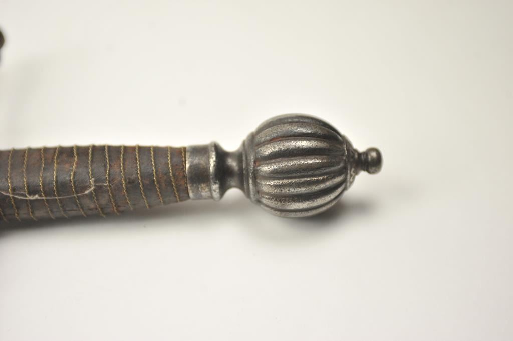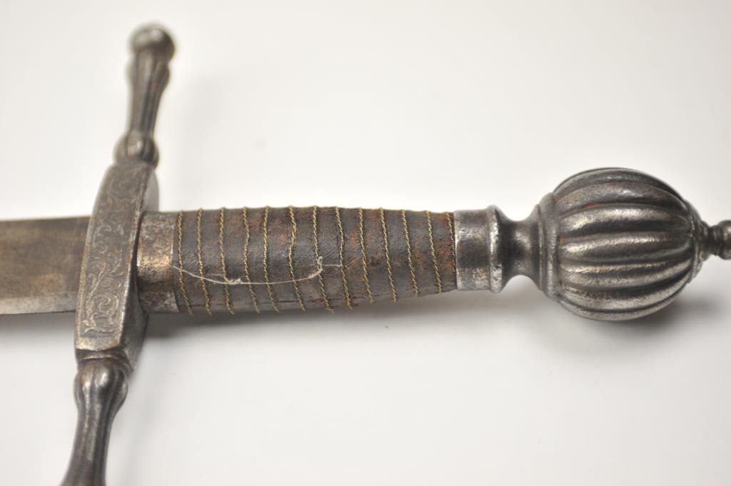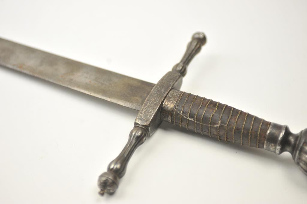 Very Good Victorian era 1 ½ hand sword with well executed etched guard and bulbous egg shaped pommel (looks period) and a single thin wire wrapped leather over wood grip. The sword is 45” in overall length with a 38” blade measuring 1 5/8” across the ricasso. The blade shows minor pitting and erosion with over 150 years of natural aging. The blade is properly tempered and an attractive decorative element of armor for display,possibly Schmidt or Heinrich workshops. Est.: $600-$1,200.