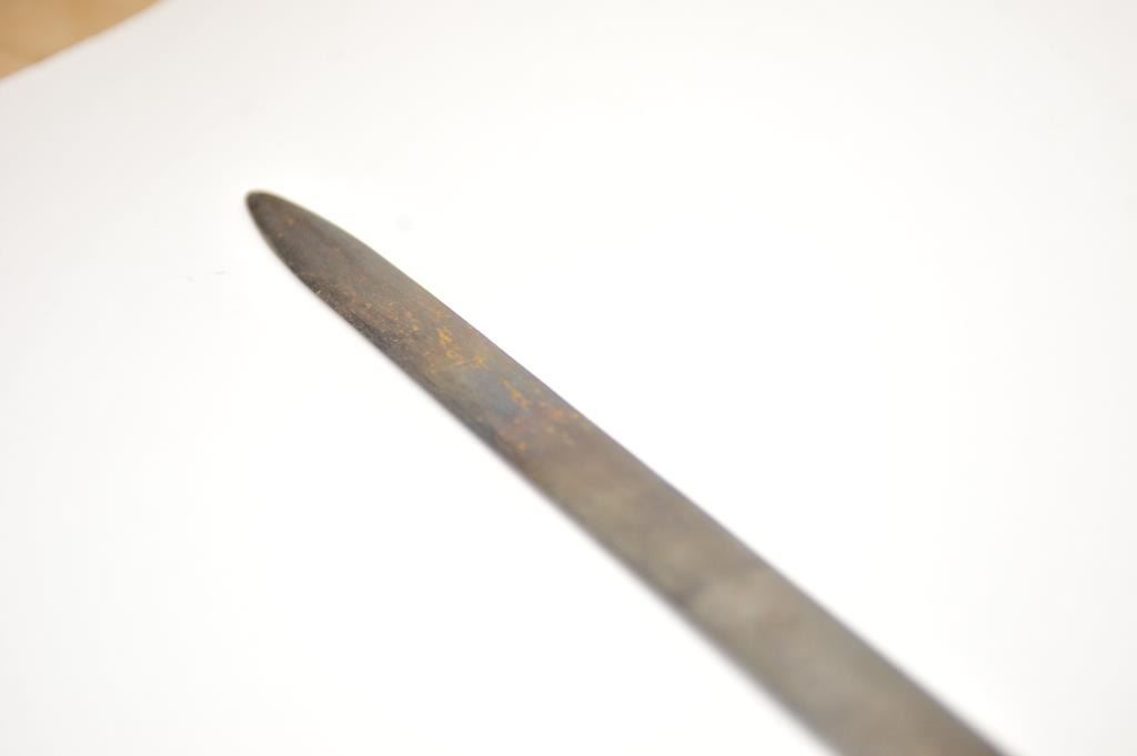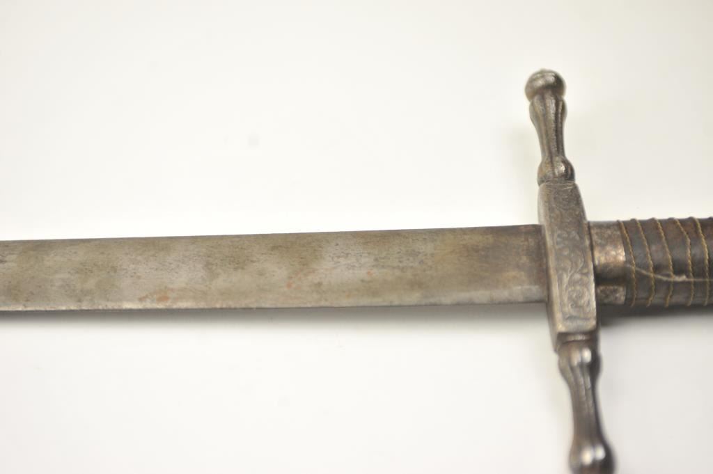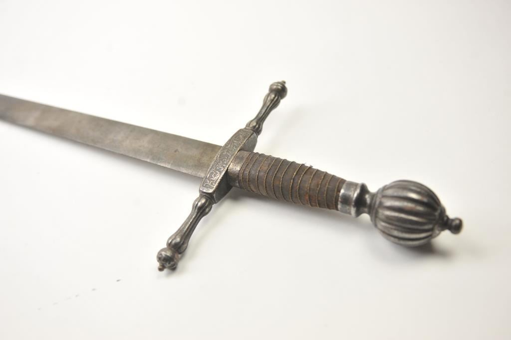 Lot 115 Very Good Victorian era 1 ½ hand sword with well executed etched guard and bulbous egg shaped pomm