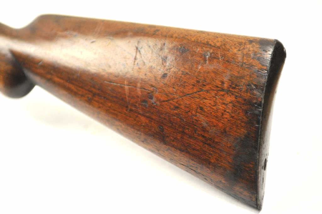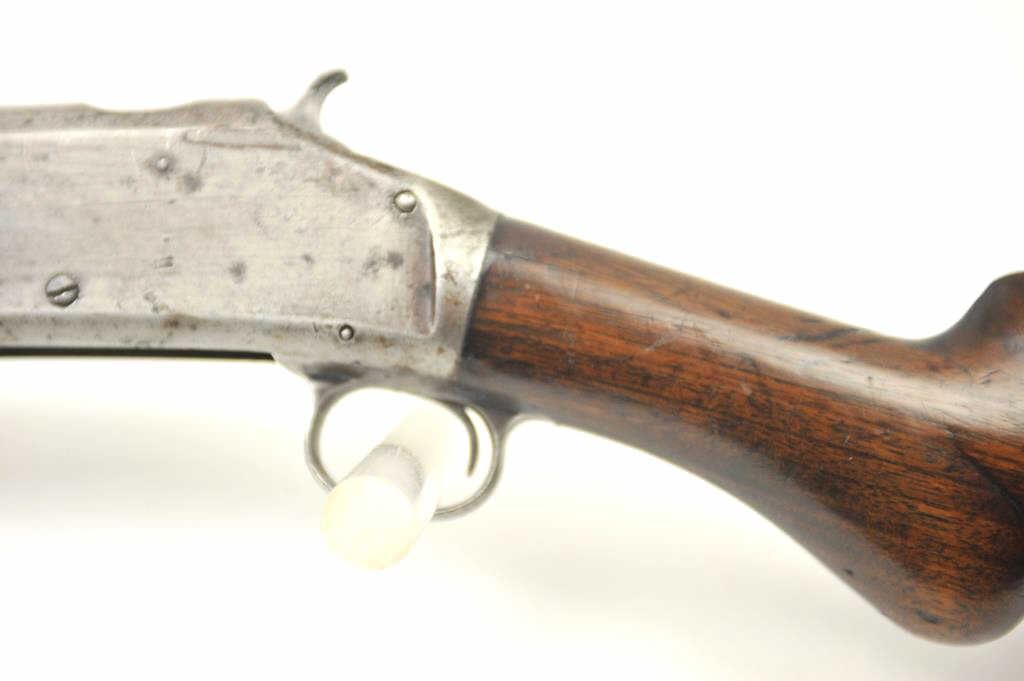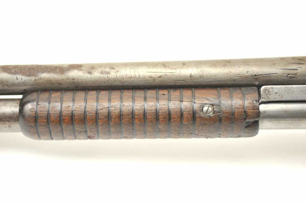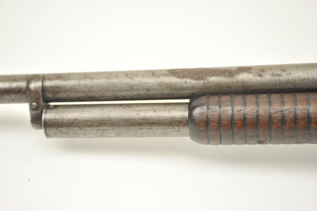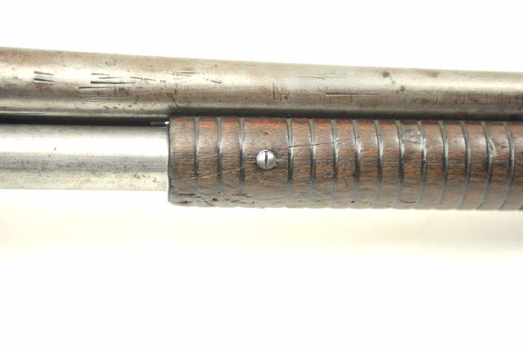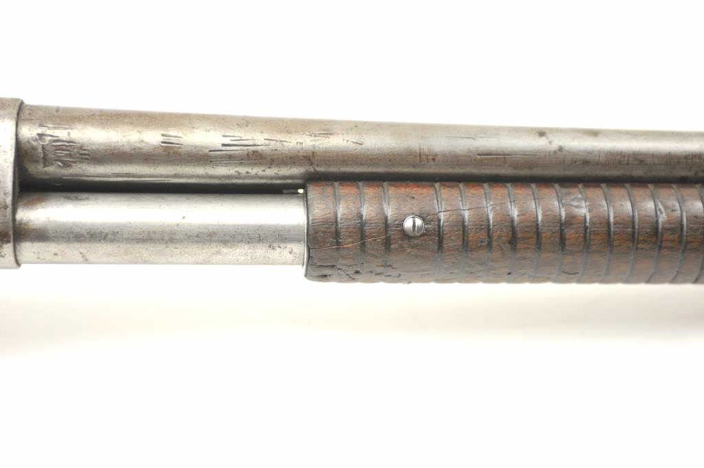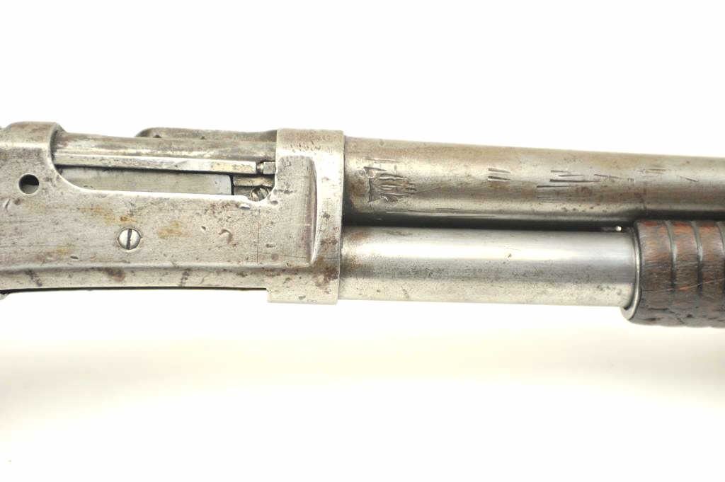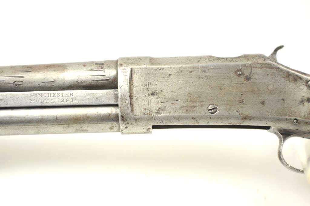 Early Winchester Model 1893 pump shotgun, 12 gauge, Serial #8191. Early 12 gauge pump action shotgun, blued finish, smooth pistol. Grooved pump handle, 32” barrel, exposed hammer, steel butt plate. The shotgun is inpoor to nearly fair overall condition with little finish and large spots of rust from poor storage. The wood is better with dents and scratches from use. It is however a rarely seen shotgun. Note: the Model 1893preceded the introduction of the 2 ¾” shell and were chambered for the 2 ½” shotgun shells. Est.: $350-$700. (Antique).
