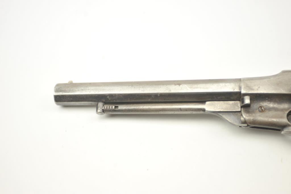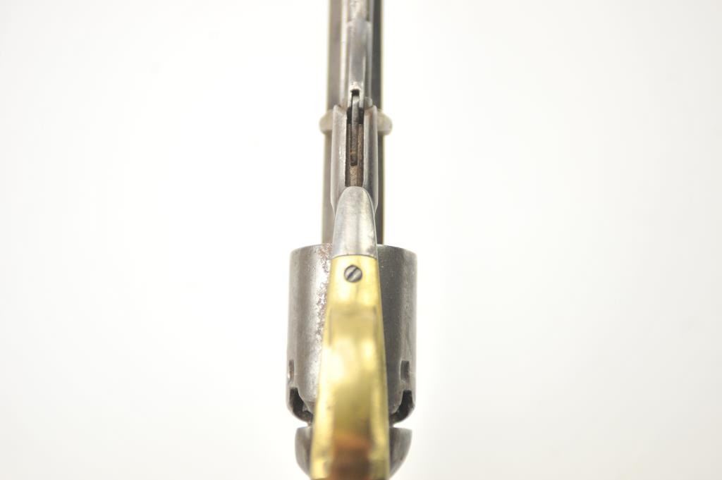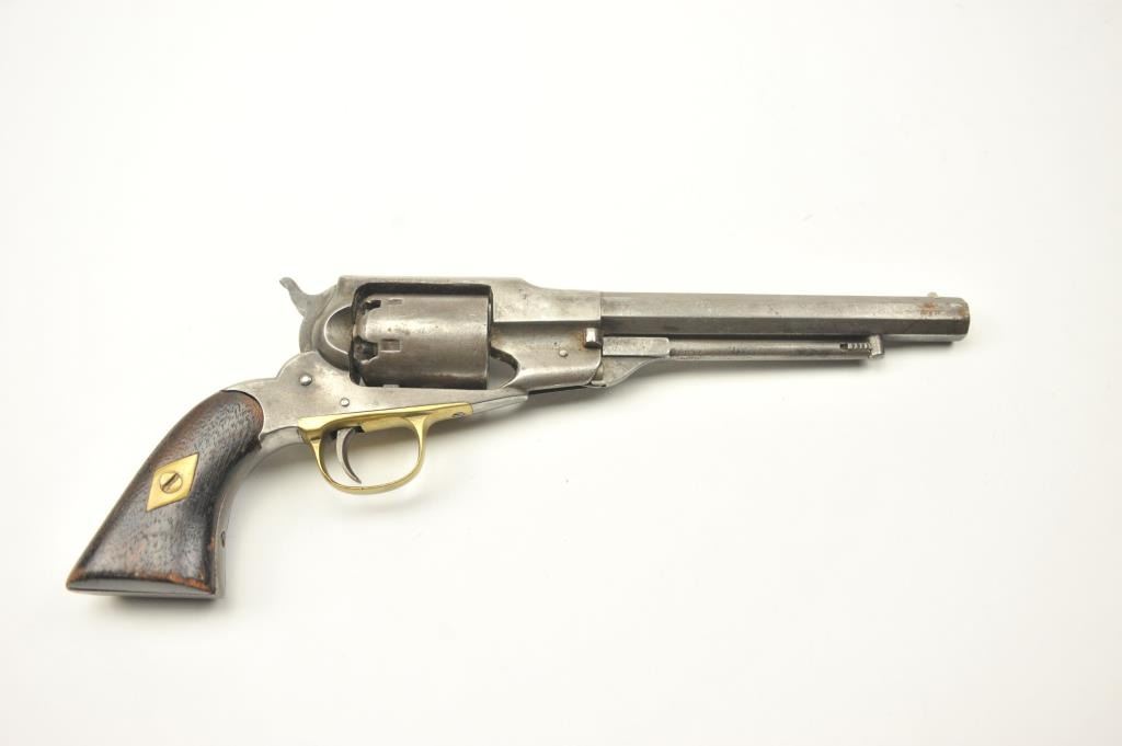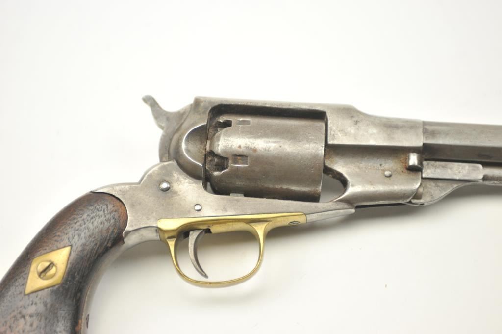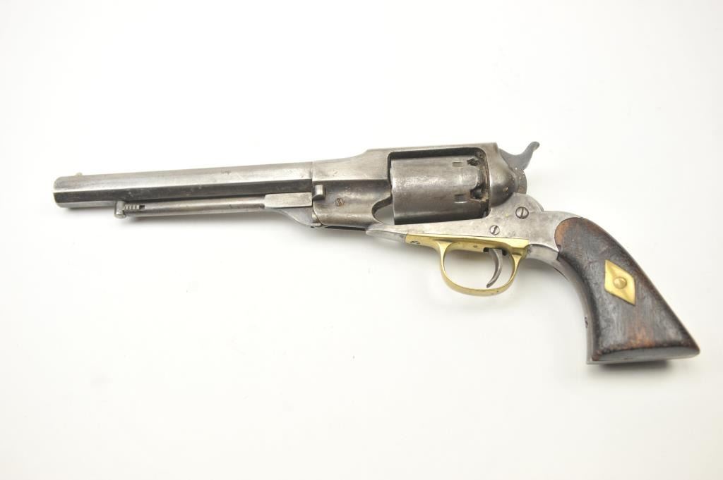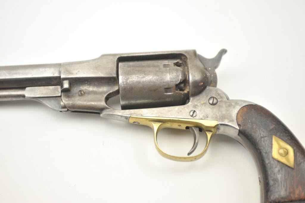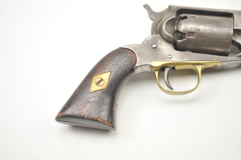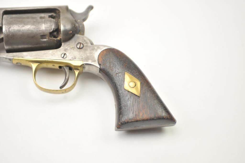 Remington Beals Navy percussion revolver, .36 caliber, Serial #9757. The pistol is in good overall condition with an 8” octagon barrel with faint traces of original blue in the protected areas and a brass triggerguard. The smooth wood grips are in good condition with an old brass diamond in the grip. The action is not working at the time of description. Est.: $700-$1,400. (Antique).