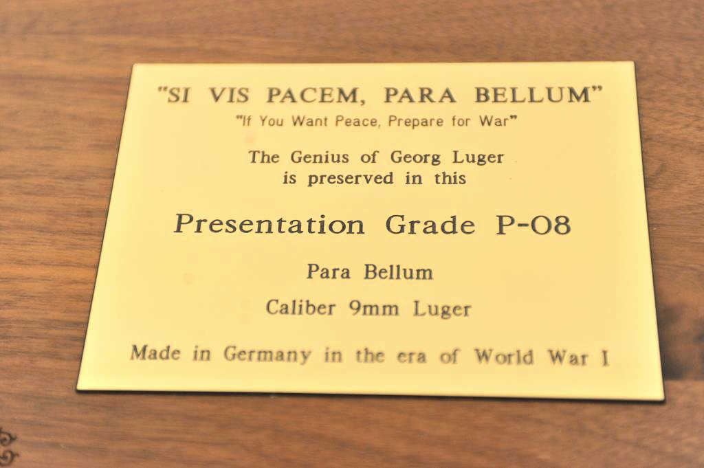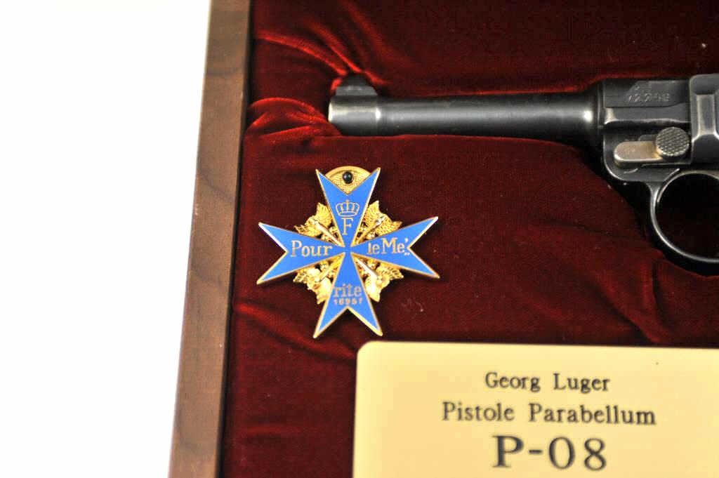 DWM P-08 1920 Luger semi-automatic pistol in wooden display case, 9mm caliber, Serial #72269. The pistol is in fine overall condition with a significant amount of original finish. The pistol is dated 1920and marked DWM with all matching serial numbers, straw finish on the trigger and small parts and German proofs. The checkered wood grips are in good condition with mars and compressions from carry and use. Thepistol comes with a hardwood display case with red velveteen interior, faux medal and a plaque on top in honor of Georg Luger. The lot includes one correct, unmarked magazine. Est.: $800-$1,600. (C+R/PPT).