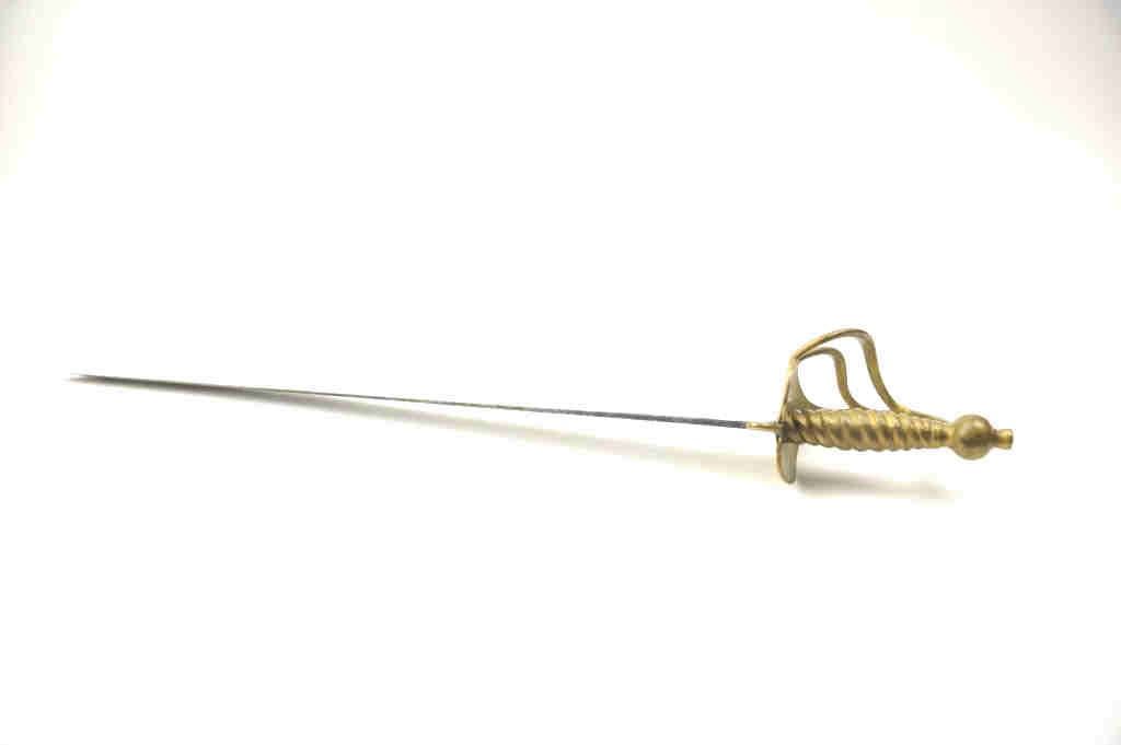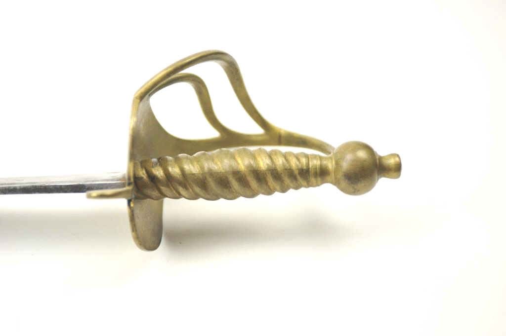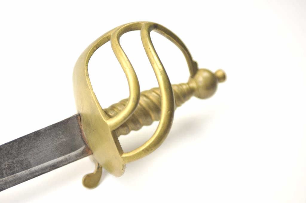 Classic Revolutionary War era British style hanger with 'Running Wolf' and S.H stamp on blade. Unstopped blood grove running from rear 3/4 way down blade. 301/4" overall with 25 3/4"blade measuring 1 3/8" and widest part of rear tapering to point and almost strait. 3 Branch Brass Guard and Hilt with turned grip. Good to Very Good condition with minor pitting and erosion. No Unit or ID markings but typical of British type used inRevolutionary War to Napoleonic era. Est:$750-1500