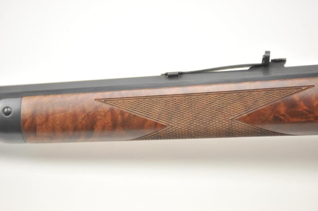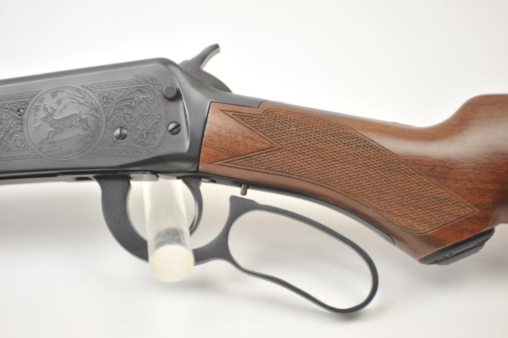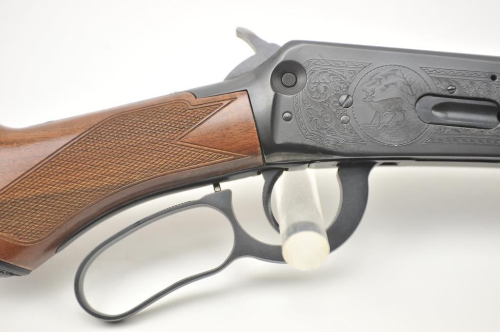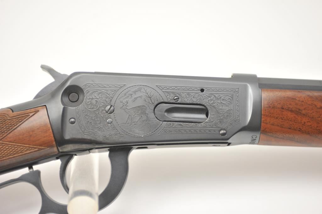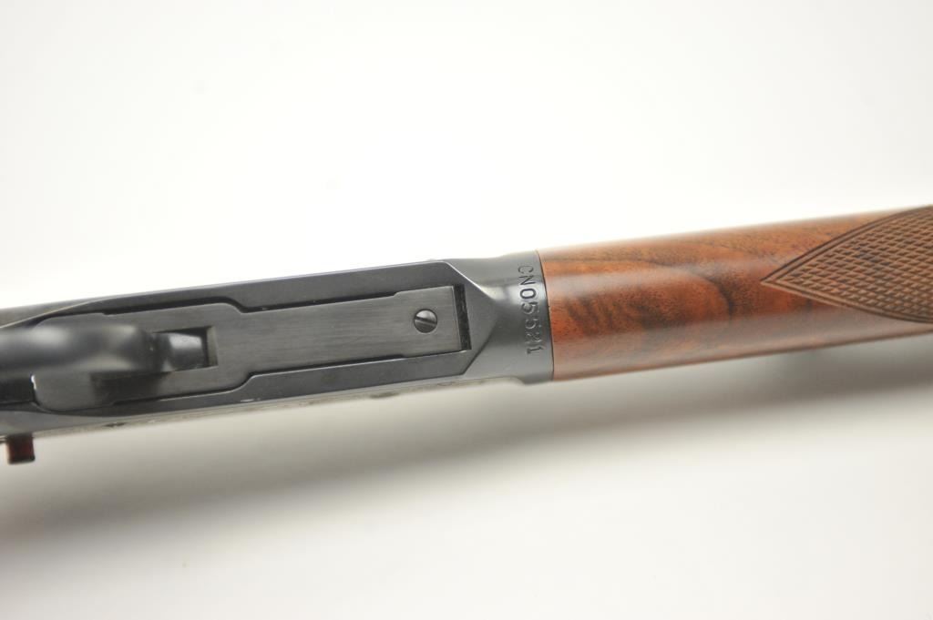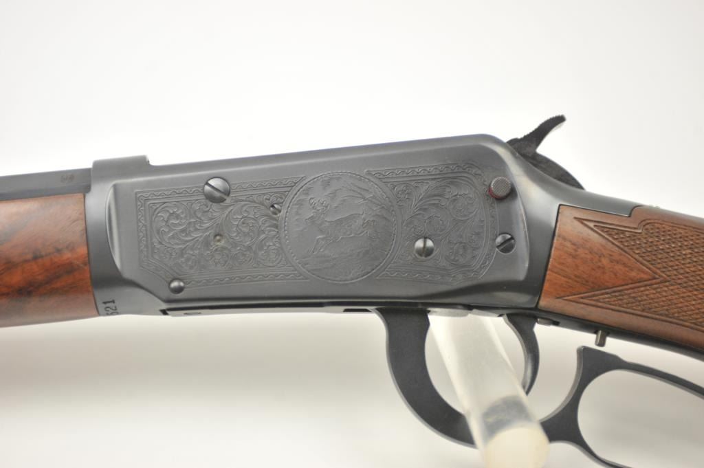 Winchester Model 1894 One Hundred Year Centennial Commemorative Model lever action rifle, .30 WCF caliber, Serial #CN05521. The rifle is in nearly excellent overall condition with a 26” octagon to round barrelwith a ¼ magazine. The rifle is marked, “1894-1994” on the right flat. The receiver is nicely scroll engraved with game scenes on both sides. The finely checkered wood stock has a pistol grip with nicely figured woodand a smooth steel crescent butt plate. Est.: $900-$1,800. (Modern).