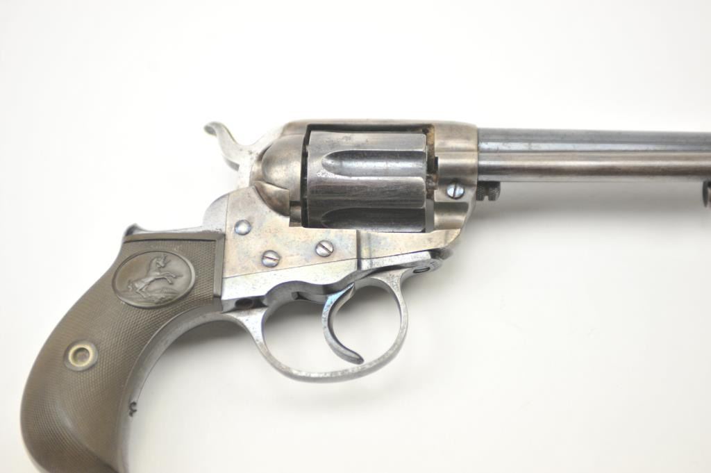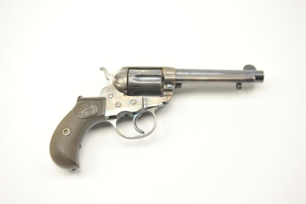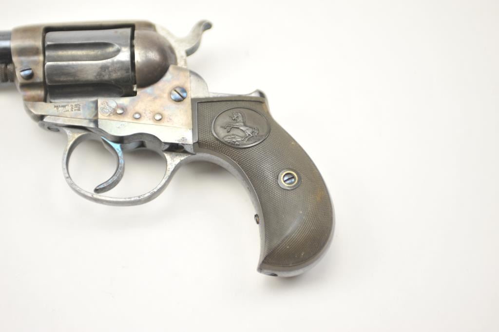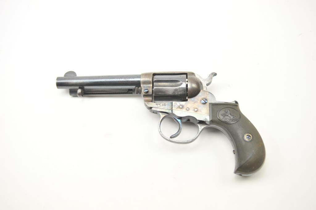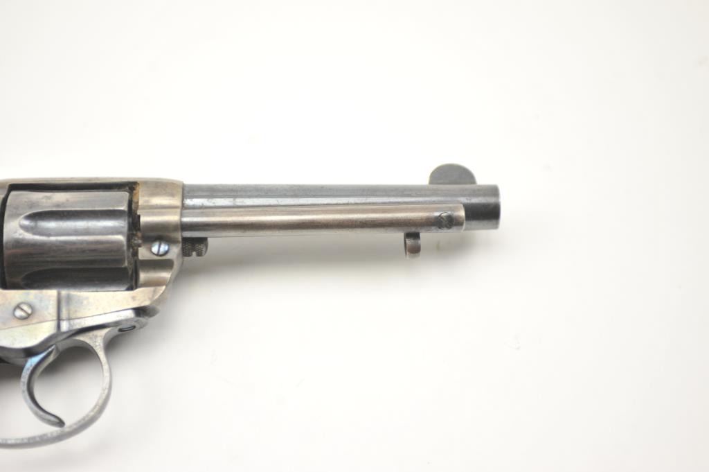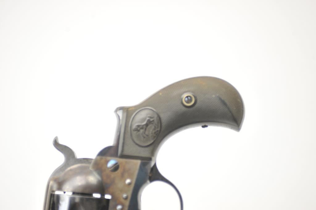 Colt Model 1877 Lightning DA revolver, .38 caliber, Serial #135233. The pistol is in fine overall condition with a 4 ½” barrel. The pistol retains approximately 80-85% of the original blue finish with holster wear at the muzzle, thinning on the cylinder and a light freckling of surface erosion. The back of the hammer, trigger and screw heads show bright niter blue and frame has considerable vivid case hardening. The checkered hardrubber grips are in very good condition. The action works well at the time of description, the bore is good and the markings are legible. Est.: $900-$1,800. (C+R/PPT).