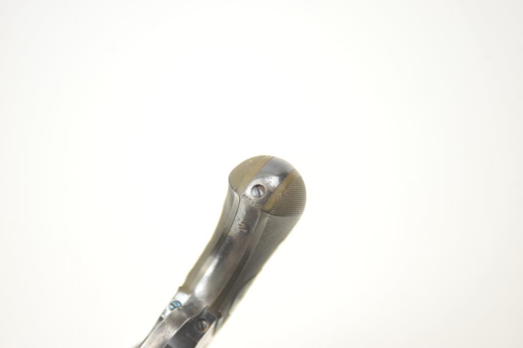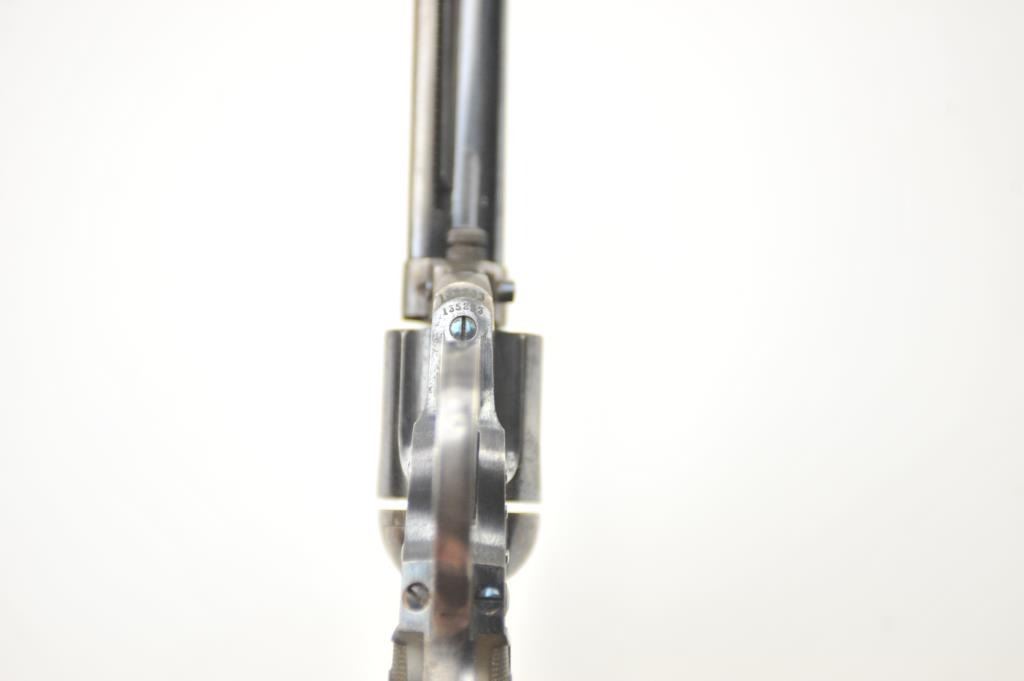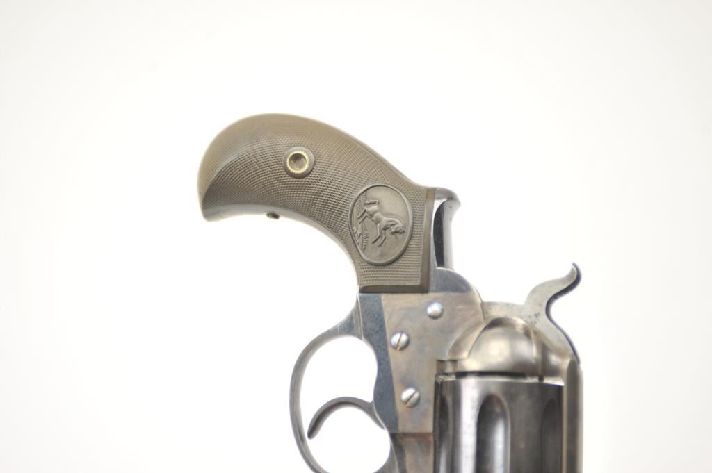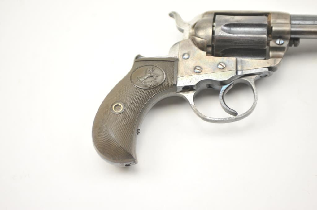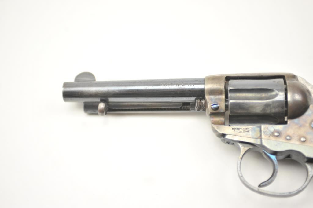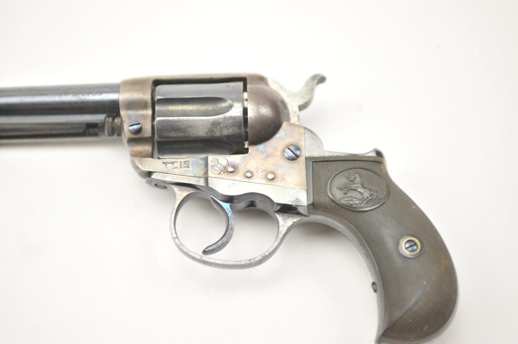 Colt Model 1877 Lightning DA revolver, .38 caliber, Serial #135233. The pistol is in fine overall condition with a 4 ½” barrel. The pistol retains approximately 80-85% of the original blue finish with holster wear at the muzzle, thinning on the cylinder and a light freckling of surface erosion. The back of the hammer, trigger and screw heads show bright niter blue and frame has considerable vivid case hardening. The checkered hardrubber grips are in very good condition. The action works well at the time of description, the bore is good and the markings are legible. Est.: $900-$1,800. (C+R/PPT).