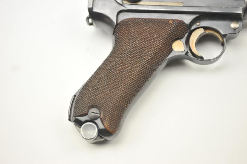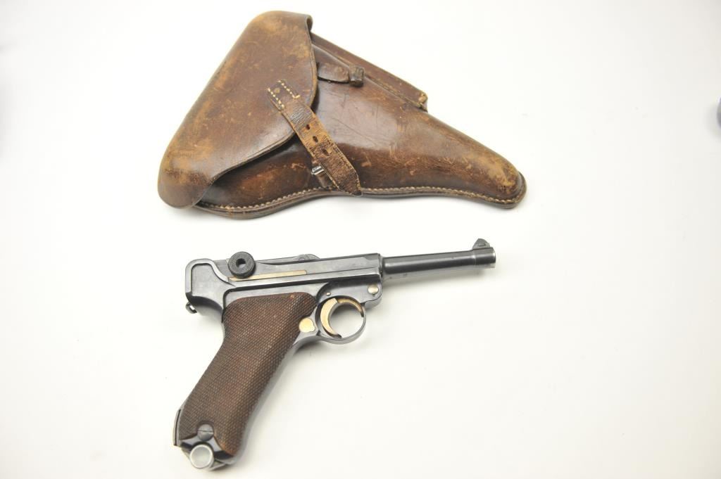 1936 S/42 Mauser Luger semi-automatic pistol, 9mm caliber, Serial #7634. The pistol is in nearly fine overall condition showing 90-95% of the blue finish with strong straw finish on the trigger and small parts. The pistolis dated 1936 with all matching visible serial numbers. The checkered wood grips are in very good condition with sharp checkering. The lot includes two clips, which are correct but with non-matchingserial numbers. The lot includes a leather holster marked, C. WEISS with a Nazi proof dated 1939. The bore is good, the action is crisp and the markings are sharp on this WWII era Luger pistol. Est.: $900-$1,800.(C+R/PPT).