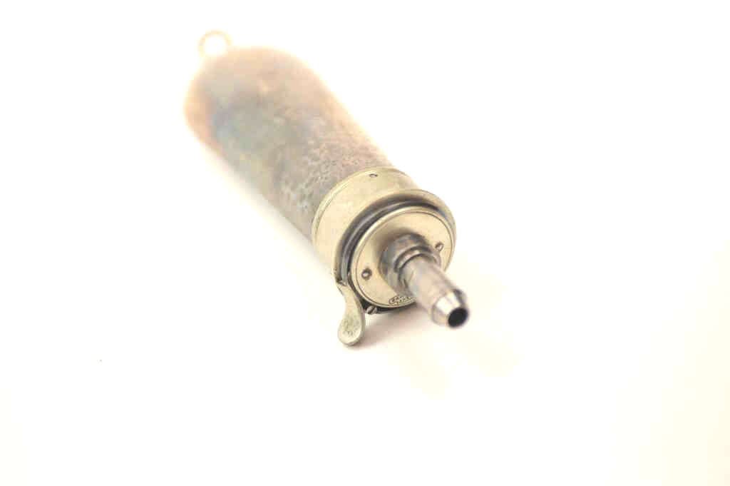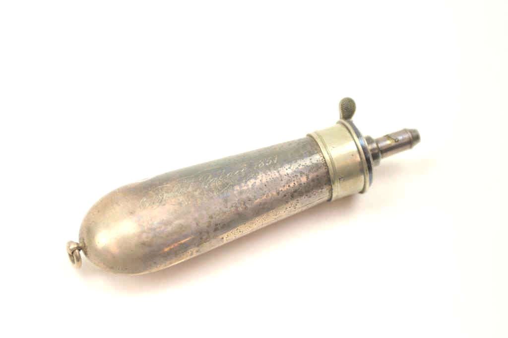 Bag flask for Colt Navy marked “Hawksley Shefield”. Originally silver plated and inscribed “Crystal Palace 1851”. Pictured in Jordan’s Navy book on page 197 Fig 16-5. 80%-90% original uncleaned silver plate withbright blue on the spring. Also enamel pin from same exhibition where 1851 Navy was introduced. Est.: $1000-$2000