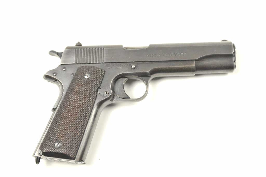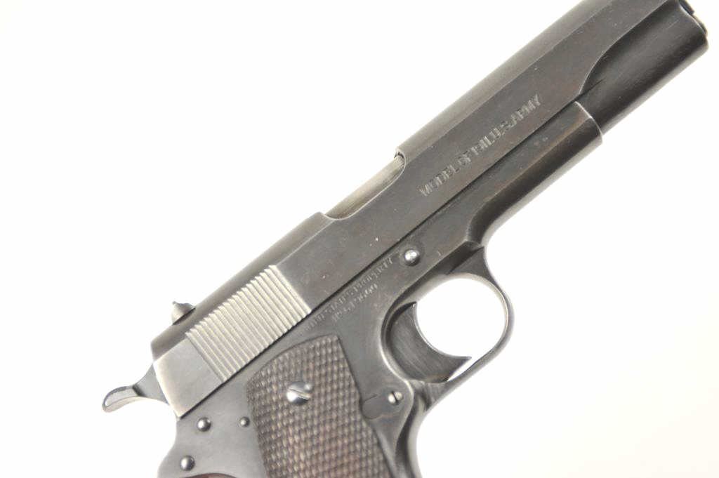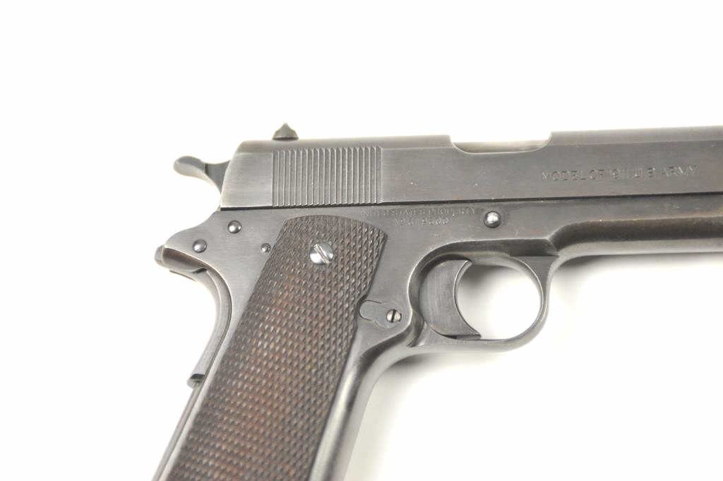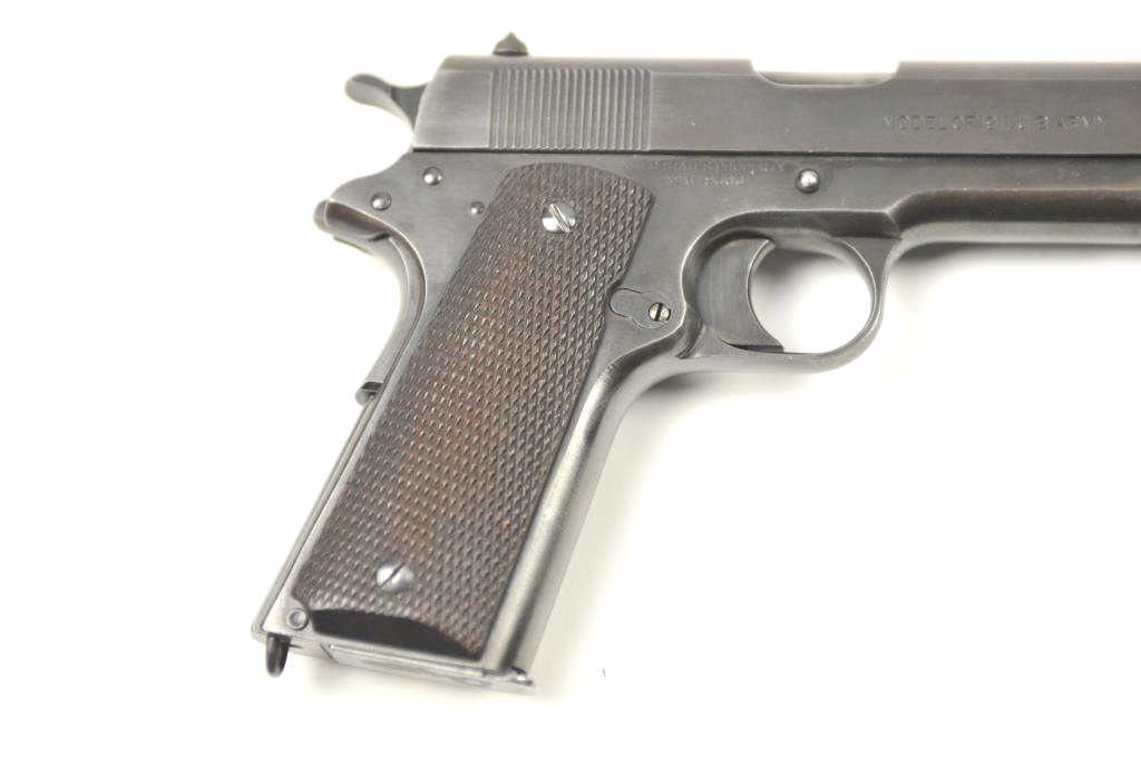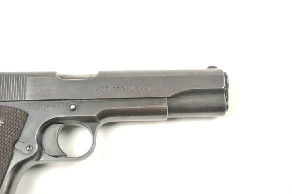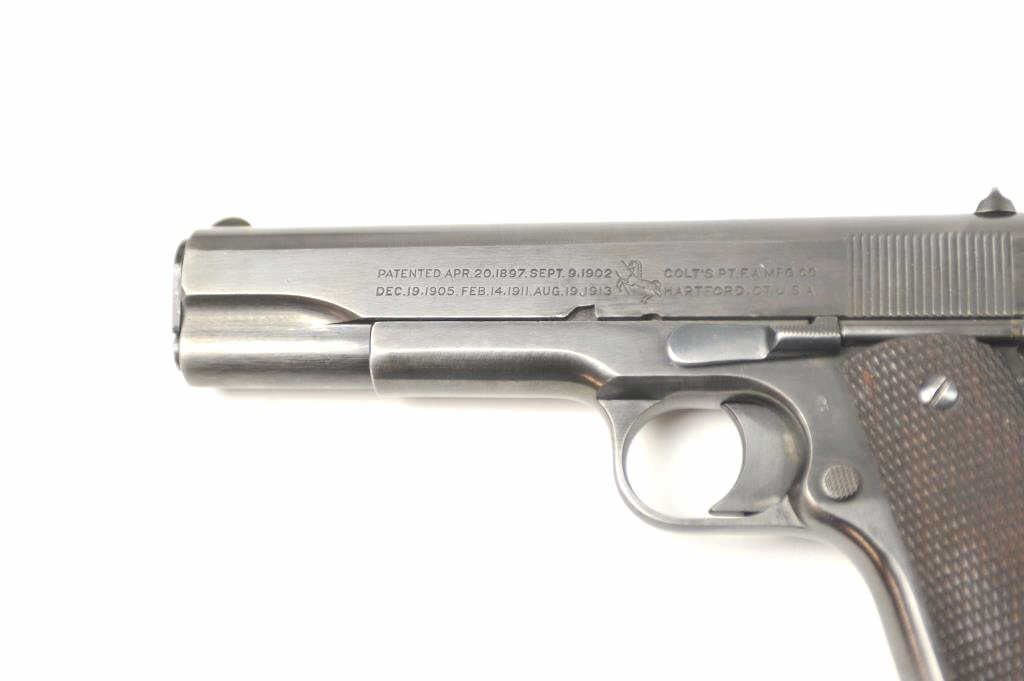 Colt Model 1911 U.S. Army Semi-Auto pistol in .45 ACP with United States property marked above serial number, S/N 619600 and S 12 (1918) proof indicating re-tasked or recovered frame. 85%-95% pasty blue arsenalstyle refinish drifting at handling areas and straps. Good sharp Colt slide markings and all other markings also sharp and crisp. “HP” proof on the barrel. Checkered wood 1911A1 style grips in very good condition. Allcorrect military small parts and 2 tone mag. Good action and bright bore. Interesting and should bear further research as to this number which is “Out of Range” for S-12 proof and 1918 era other specs on this 1911. Note: This serial number range is post-WWI and Pre-1922 when new arms were ordered and we speculate frames, parts and returns were assembled and re-tasked. (C&R/PPT) Est.: $1500-$3000
