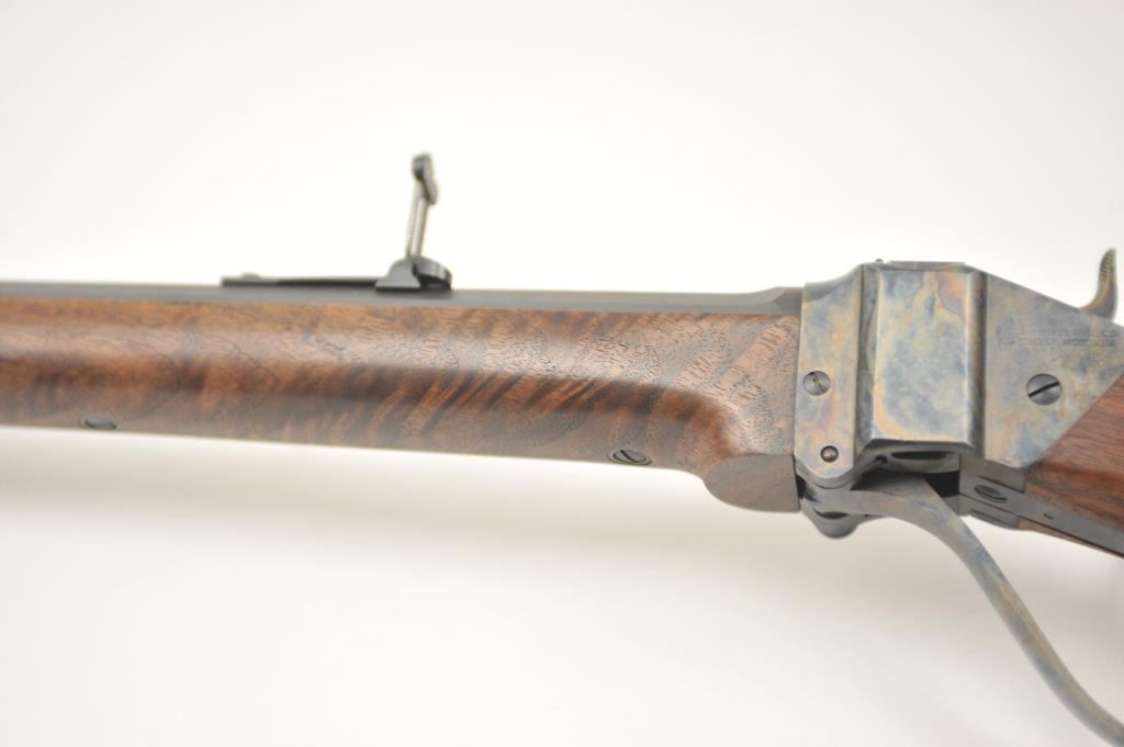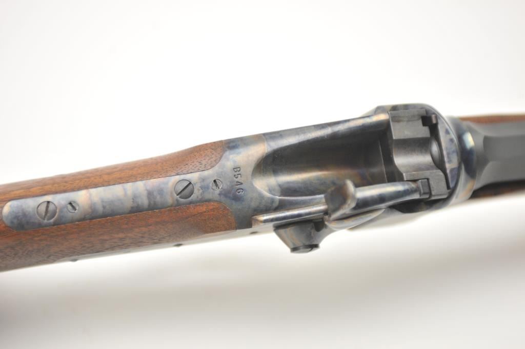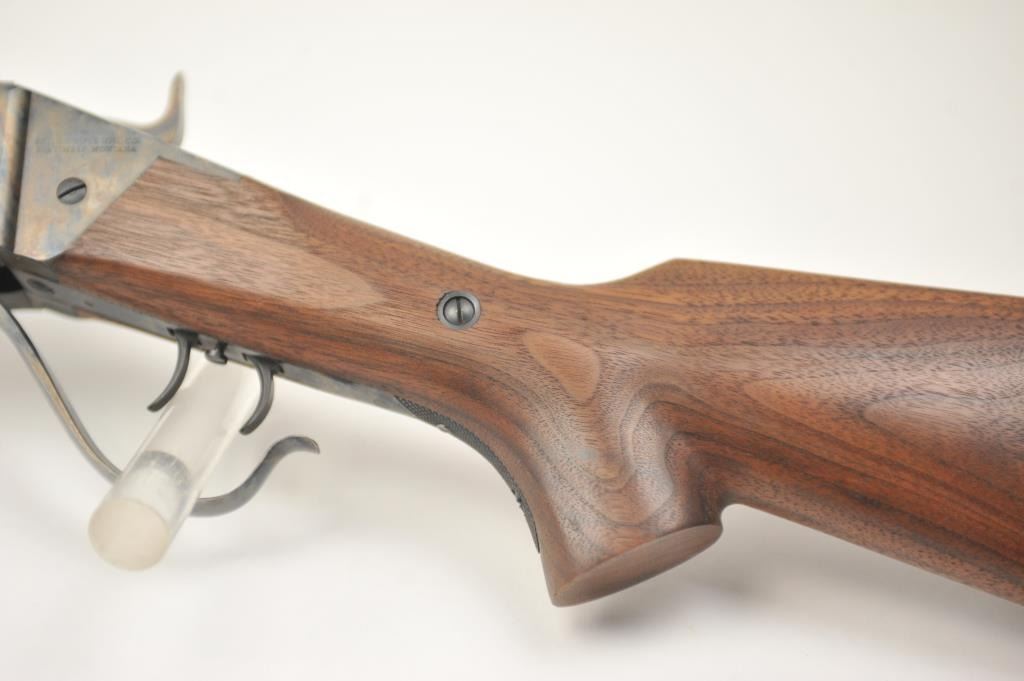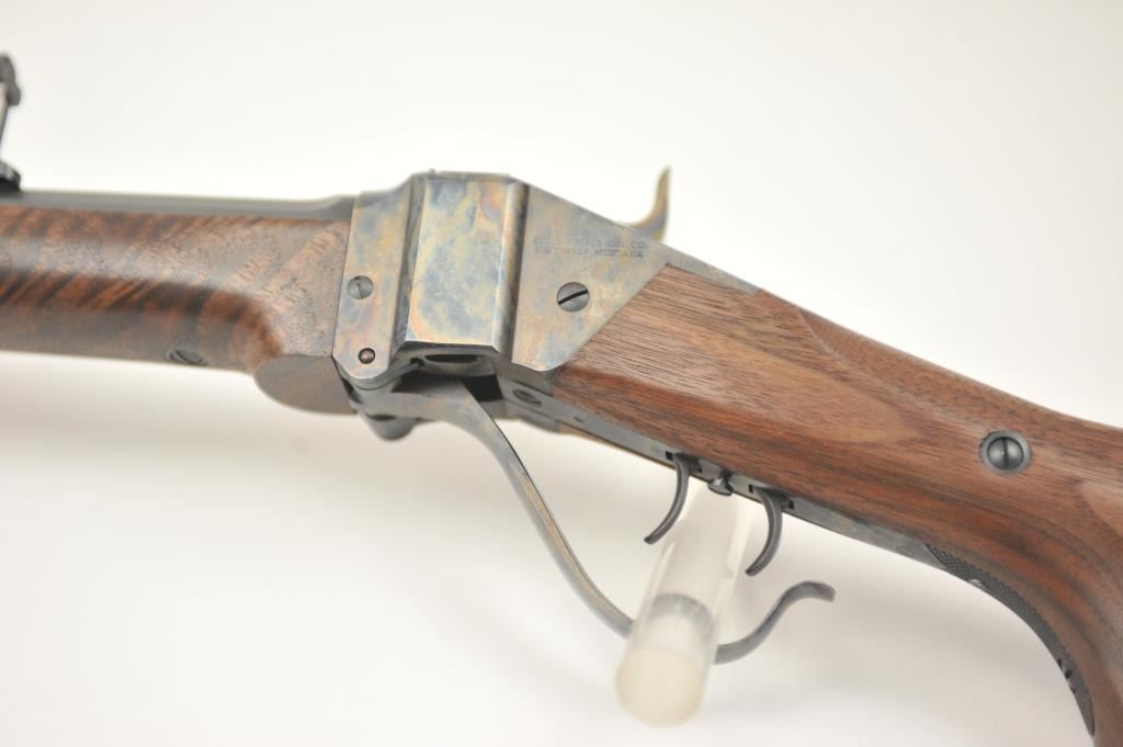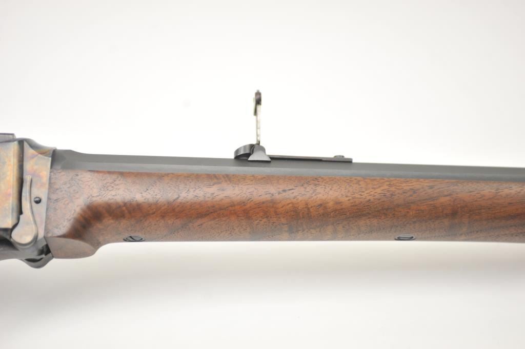 Shilo-Sharps Model 1874 single shot rifle, .45-70 caliber, Serial #B546. The rifle is in fine to nearly excellent overall condition with a 30” medium weight octagon barrel with a German silver blade front and ladder style rear sights. The barrel retains 96-97% of the matte blue finish with sharp edges and markings. The receiver is nicely case hardened with vivid color and marked, “SHILOH RIFLE MFG. CO. BIG TIMBER, MONTANA” on theleft side and double set triggers. The smooth wood stock is in very good condition with a Schnabel fore end. The butt stock ends with a smooth steel butt plate with nice case colors, providing a 13 ¾” LOP to thefront trigger. The bore is excellent and the action is crisp on this lightly used Shilo-Sharps in the venerable .45-70 chambering without the normal three year wait. Est.: $1,000-$2,000. (Modern).