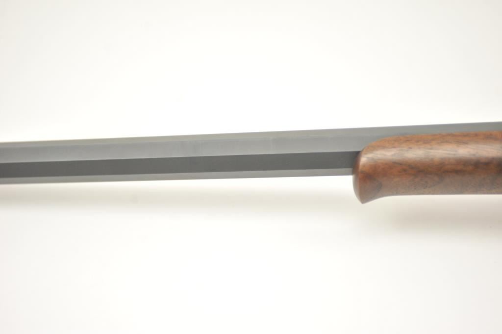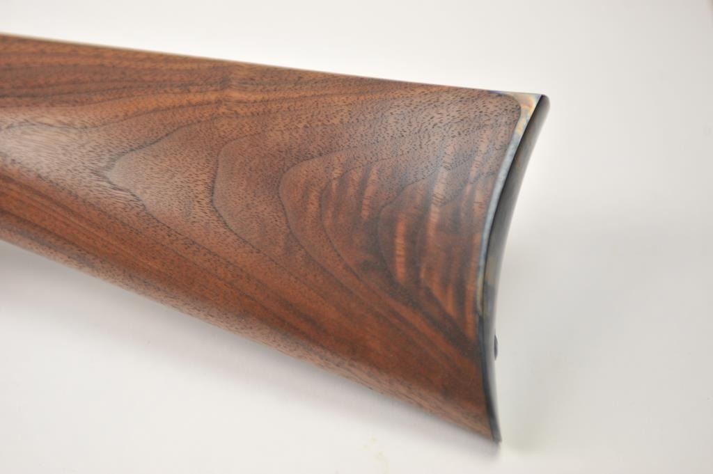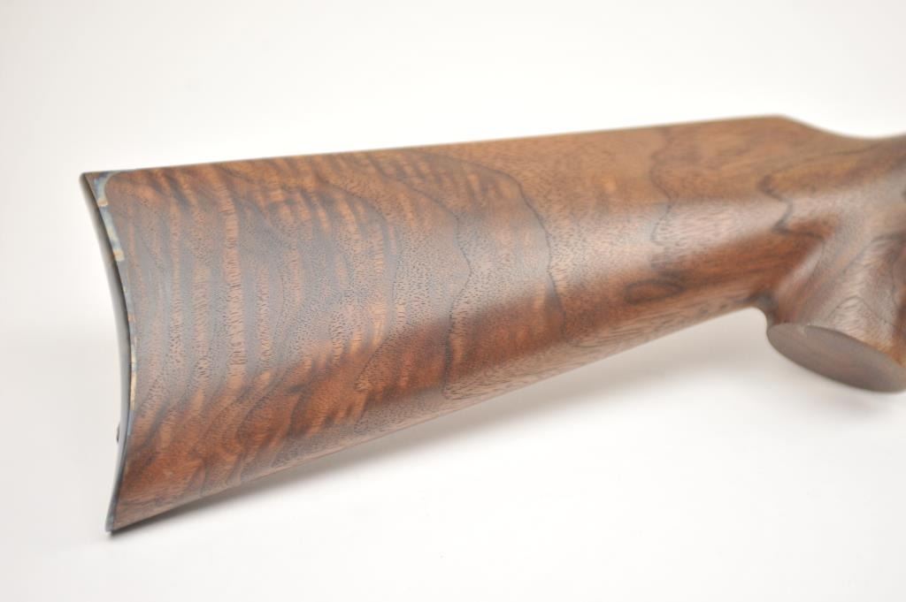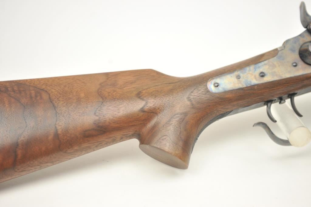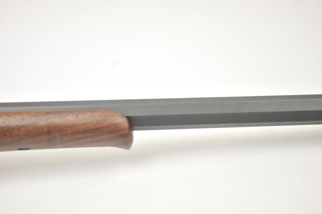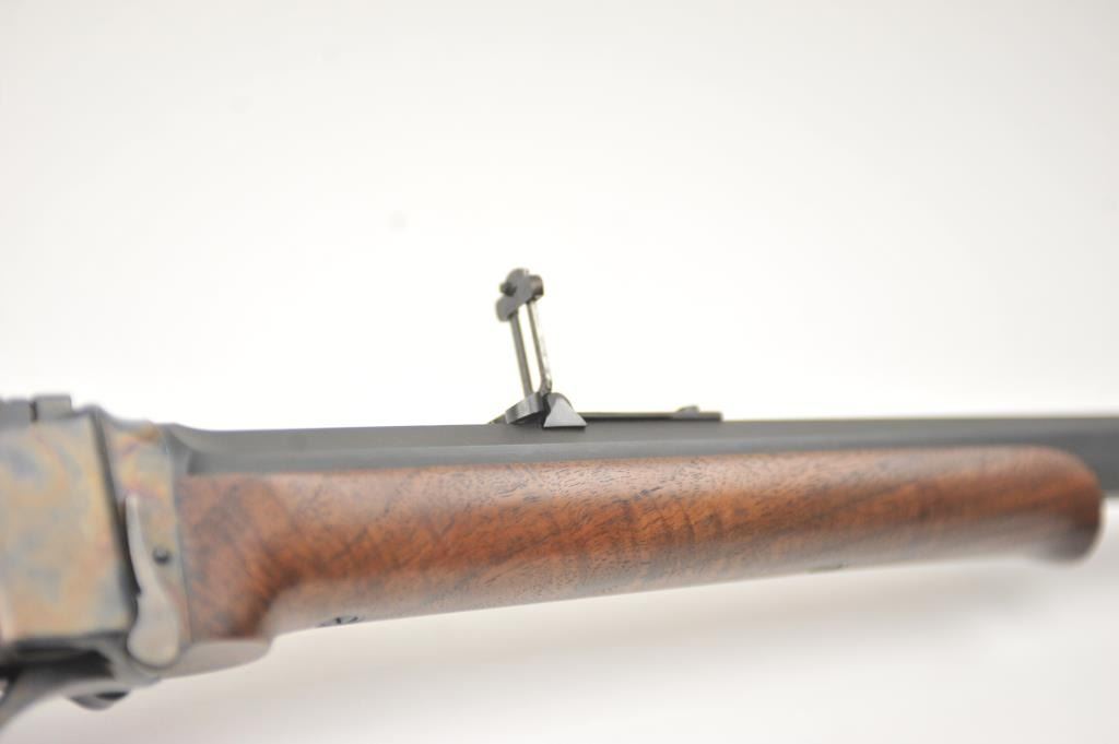 Shilo-Sharps Model 1874 single shot rifle, .45-70 caliber, Serial #B546. The rifle is in fine to nearly excellent overall condition with a 30” medium weight octagon barrel with a German silver blade front and ladder style rear sights. The barrel retains 96-97% of the matte blue finish with sharp edges and markings. The receiver is nicely case hardened with vivid color and marked, “SHILOH RIFLE MFG. CO. BIG TIMBER, MONTANA” on theleft side and double set triggers. The smooth wood stock is in very good condition with a Schnabel fore end. The butt stock ends with a smooth steel butt plate with nice case colors, providing a 13 ¾” LOP to thefront trigger. The bore is excellent and the action is crisp on this lightly used Shilo-Sharps in the venerable .45-70 chambering without the normal three year wait. Est.: $1,000-$2,000. (Modern).