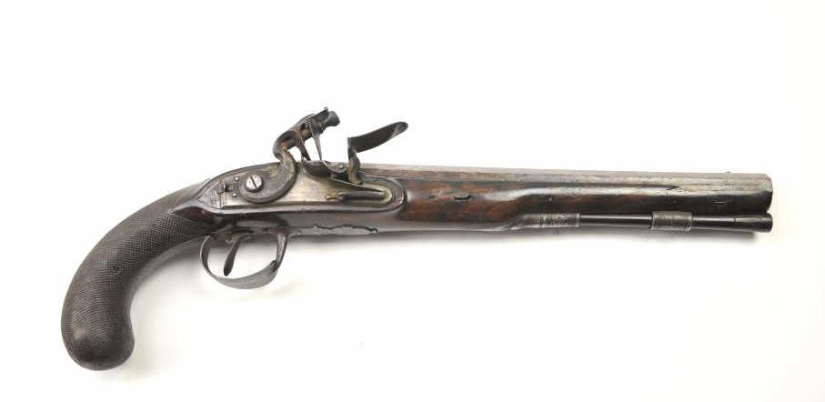 Pair of flintlock dueling pistols by H.W. Mortimer in as found relic condition needing restoration. The hammer is an old, period of use repair at the neck. Est.: $1,000-$2,000. (Antique).