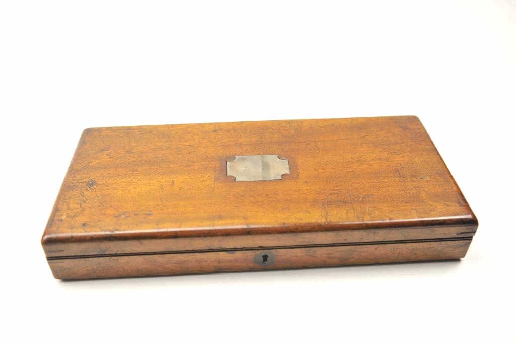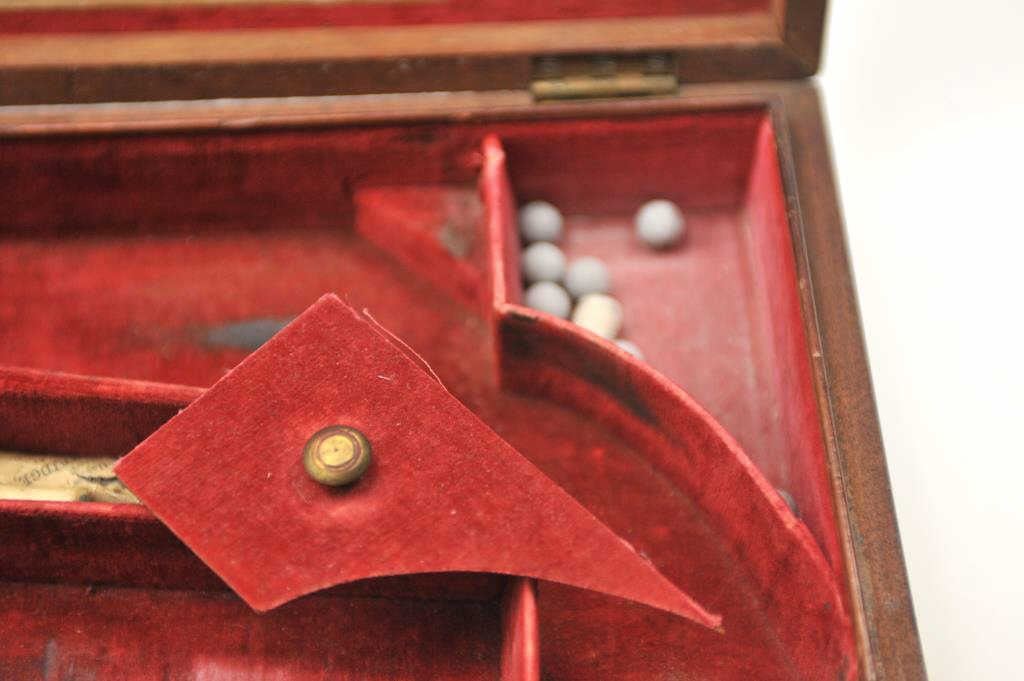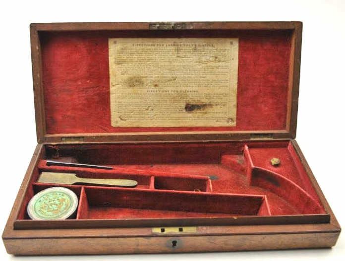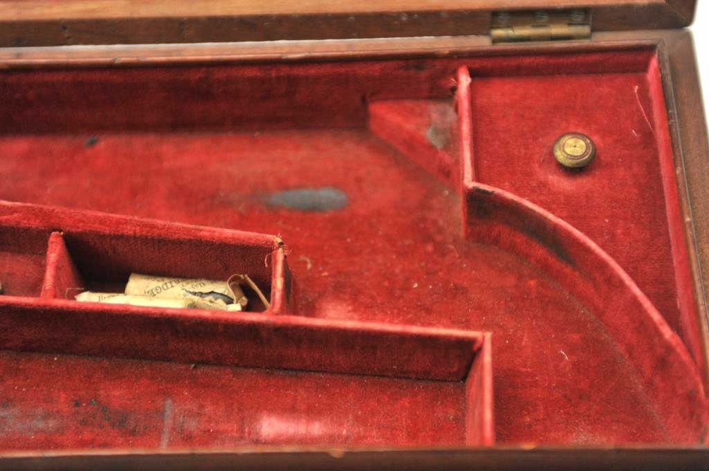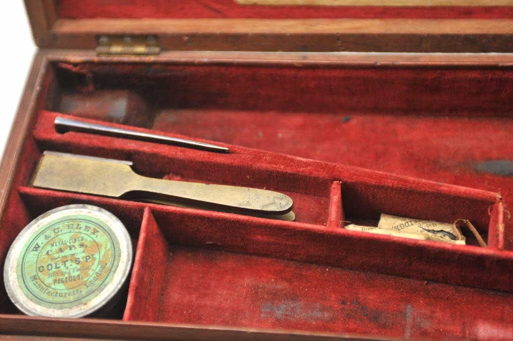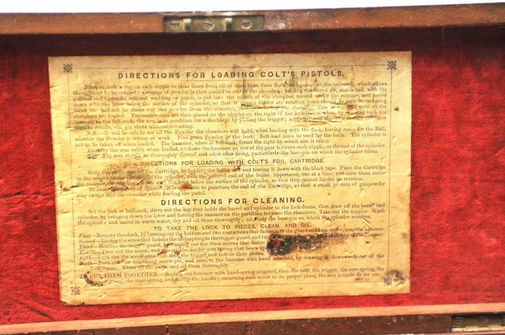 Original box for Colt 1851 London Navy in good to very good condition with mold, wrench, and large cap tin. Shows normal wear, aging, fading and minor scratches on the case. Original red velveteen lining and paper label. Est.: $1500-$3000