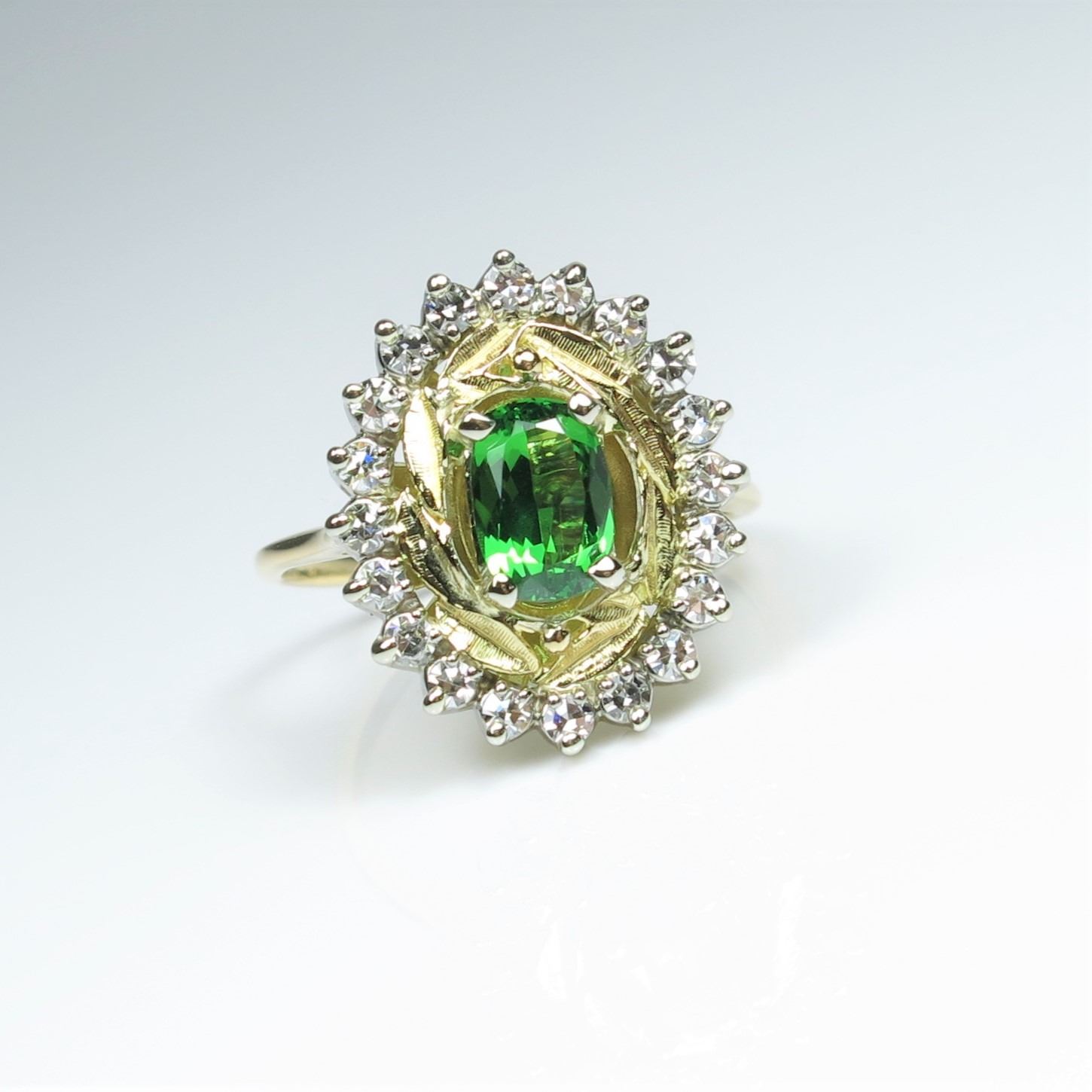 Gorgeous AAA Quality Extra Fine Tsavorite Garnet and Diamond Ring featuring an approx. 1.00 carat Green Tsavorite Garnet accented by 24 round Diamonds weighing approx. 1.00 carat with F-G colors and VVS clarity set ina custom made 14 karat yellow gold setting. Retail $3,000-$4,000 Estimates $1,500-$2,000