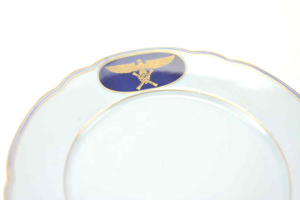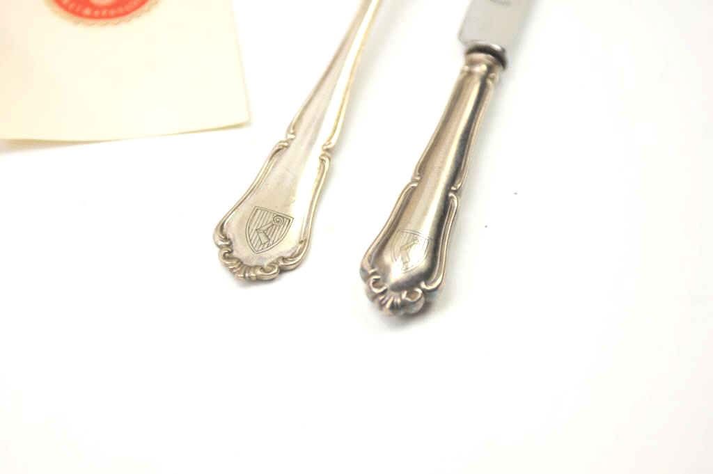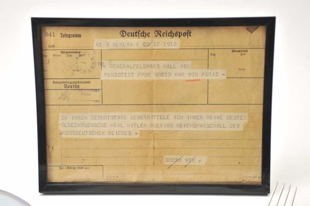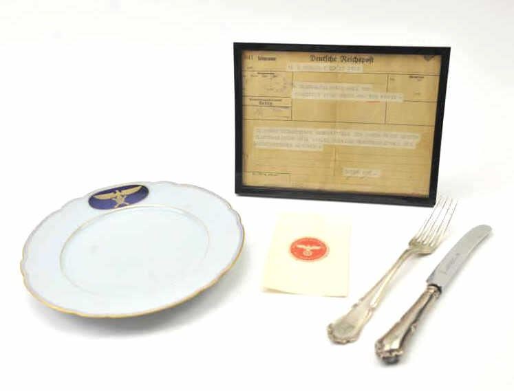 Lot of authentic WWII items formerly property of Hermann Goring, Reichsmarschall of Germany. The plate is marked Richard by Binori with the Goring crest. The provenance indicates the plate came from his sister’sestate by way of the Hermann Goring historical auction, Germany. The lot includes a knife and fork with the Goring Baronial crest, marked Hulse-1800 fine silver. There is a telegram and four pieceNazi seal set. Guaranteed authentic with a 60 day return priviledge. From an old-time collector. $1,500-$3,000.