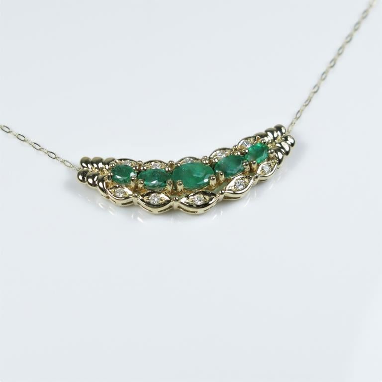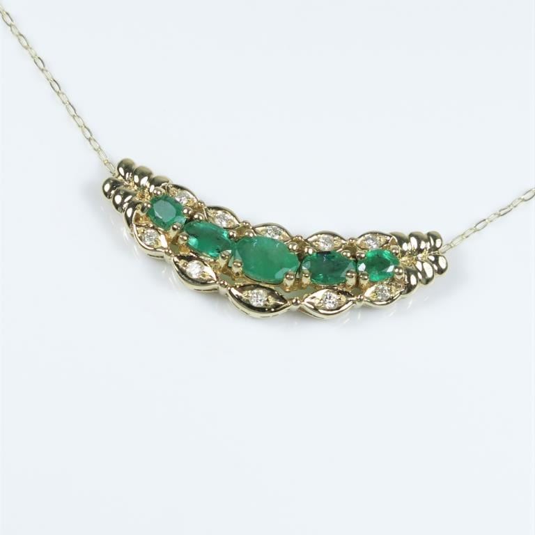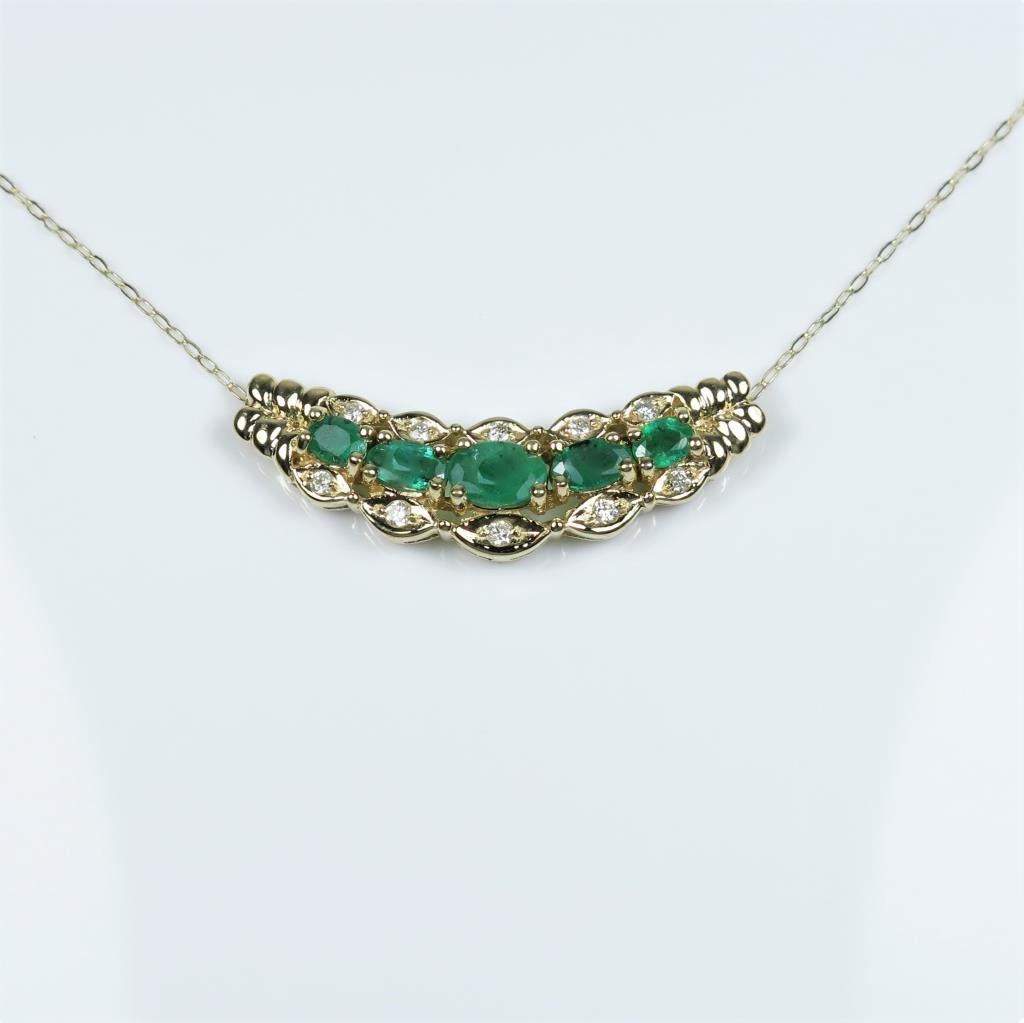 Elegant Emerald and Diamond Pendant featuring 5 oval cut Emeralds weighing approx. 2.00 carats total accented with 10 round Diamonds set in 14 karat yellow gold setting. Estimates $1,000-$1,500