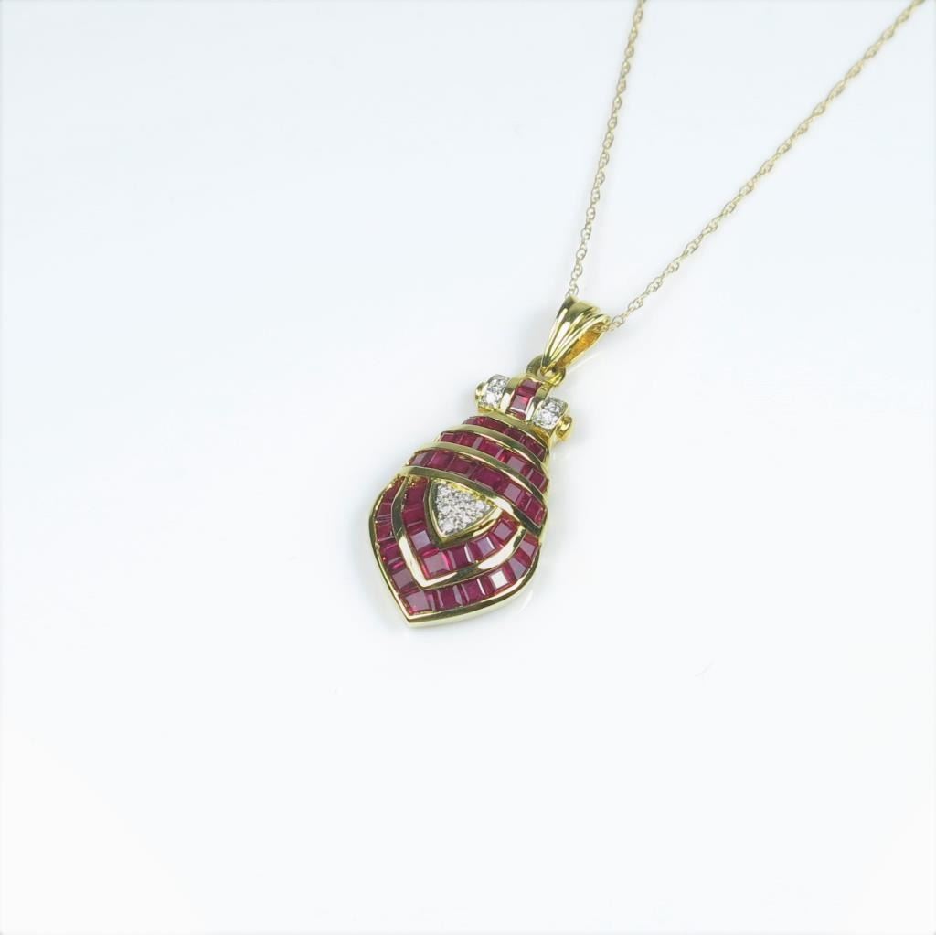 Brilliant Ruby and Diamond Pendant featuring 35 channel set Princess cut Burmese color Rubies weighing approx. 2.00 carats accented with 10 round cut Diamonds set in custom shield shape design crafted in 18 karatyellow gold. Retail $3,000-$4,000 Estimates $1,200-$2,000