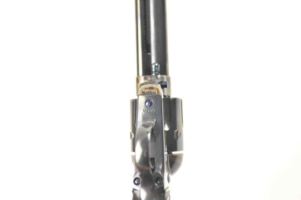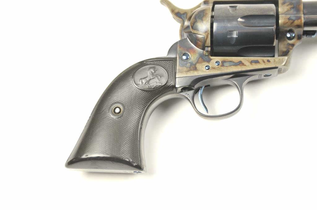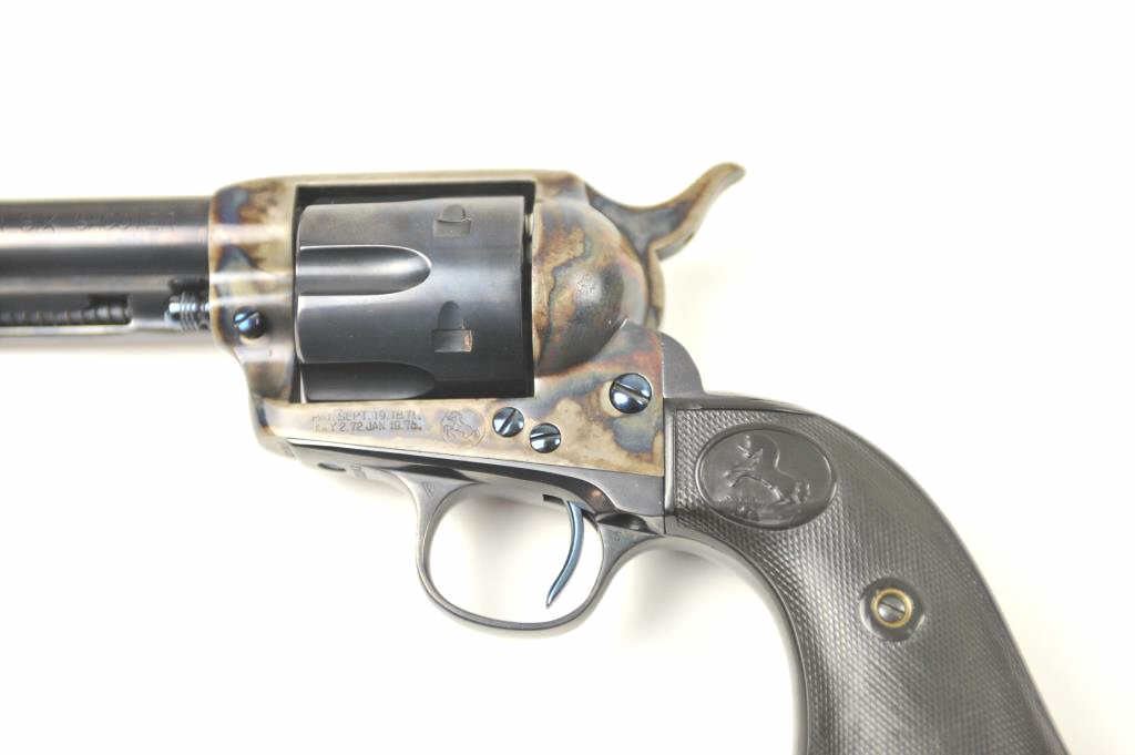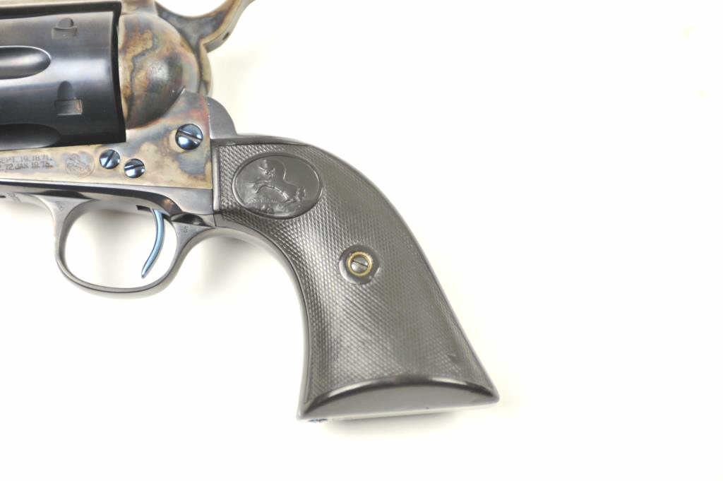 Colt SAA Revolver in .44-40 caliber with a 4 ¾” barrel, professionally refinished, and hard rubber grips, S/N 271101 made 1905. The right trigger guard bow shows an indecipherable mark possibly for factory return. The revolver shows 98%-99% high quality blue and excellent case hardening. The grips fit impeccably but worn almost smooth. Crisp markings, sound action and bright bore with fully readable Colt Frontier Six Shooter . Front sight is its full height. Factory letter states .44/40 caliber, 4 ¾” barrel, blue finish, stocks not listed, Shipped to: Simmons Hardware Company, St. Louis, Missouri, December 19, 1905, 10 guns in shipment(C& R/PPT) Est.: $1750-$3500