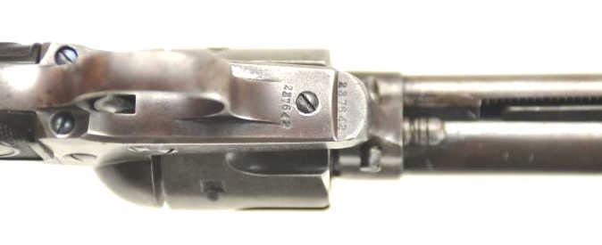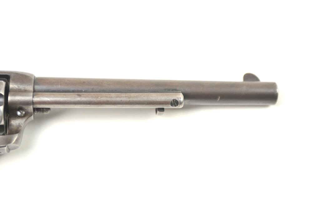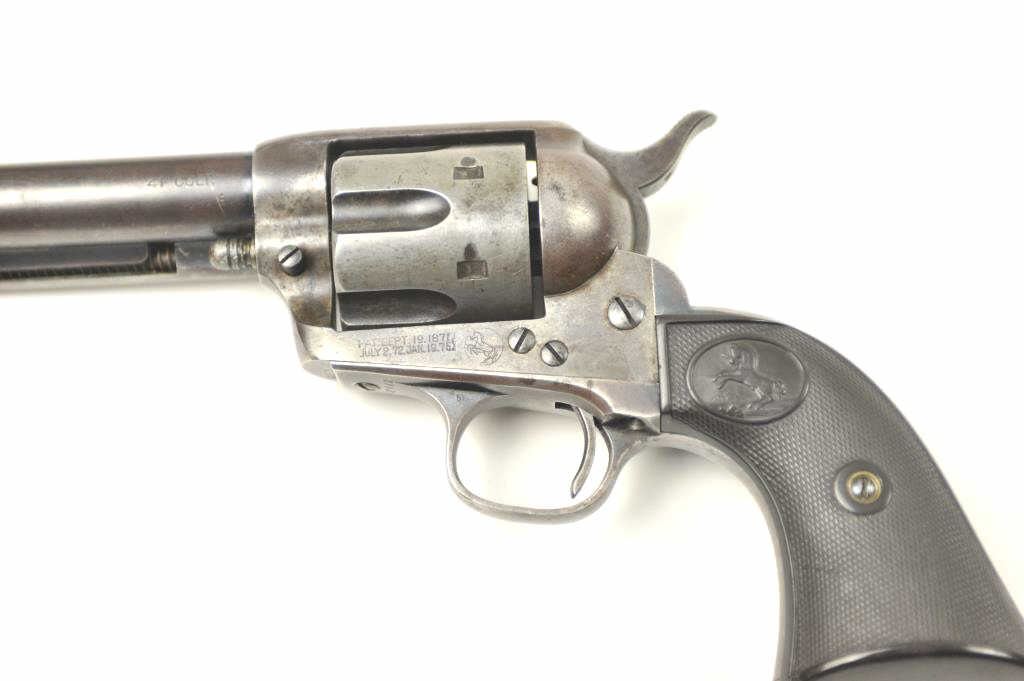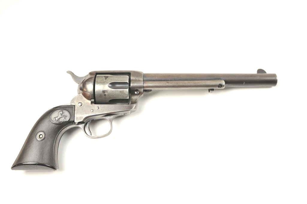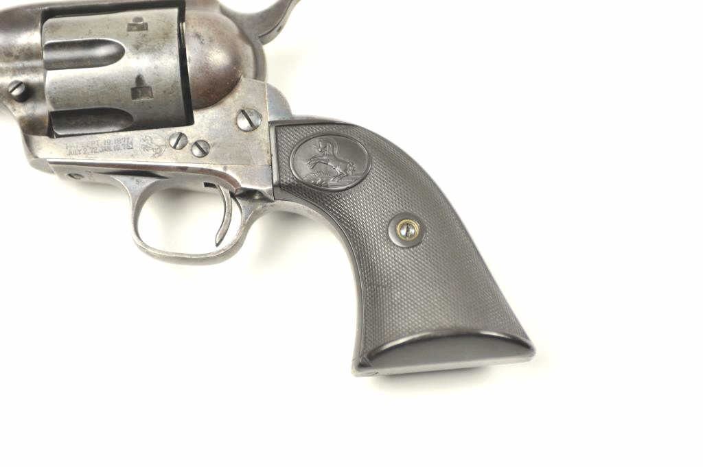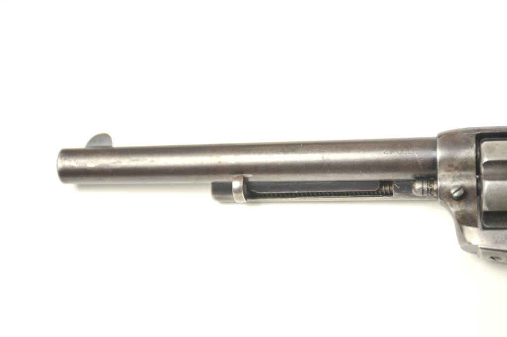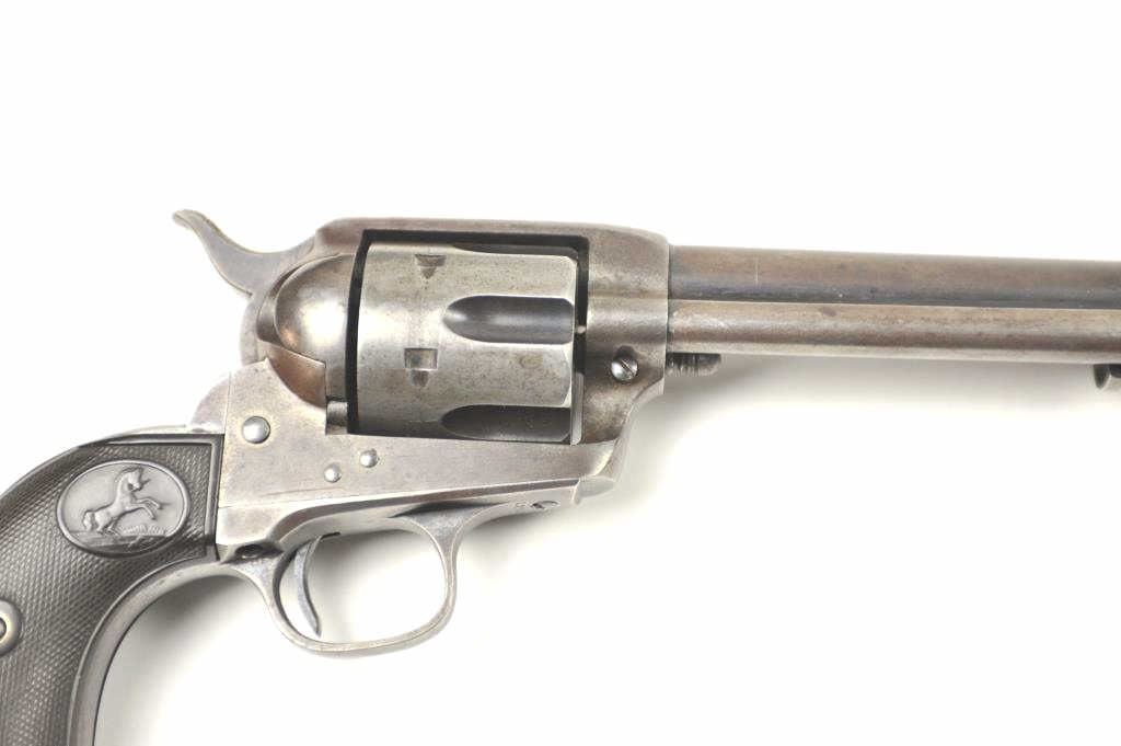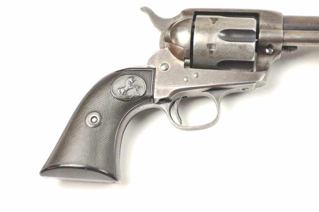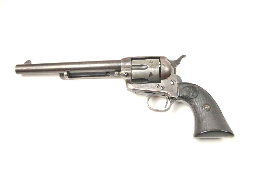 Colt SAA Revolver in .41 Long Colt caliber with a 7 ½” barrel, blue and case colored finish and hard rubber grips, S/N 237642. Factory letter confirms caliber, barrel length, and other features except grips “NotListed” and shipped to Marshall Wells Hardware Co in Deluth, Portland, Spokane, Jan 17, 1903, 2 guns in shipment. Under remarks: records indicate return March 6, 1905 and reshipped to Sears Chicago April 3, 1905.This Colt remains in good condition with 30%-50% toning and drifting blue and case colors with some minor erosion and natural aging. Good markings and matching numbers. The grips fit impeccable and match conditionremaining in good to very good condition. The bottom right grip is carved with the initials “H.N.”. The front sight shows full dimensions and most original blue. Correct to the period hammer and all small parts. Theaction is tight and the bore is good. The action is tight and the bore is good. A pleasing 7-7.5 on a 1-10 scale and very rare with approximately 300 made in .41 Colt caliber with a 7 ½” barrel estimated (See
