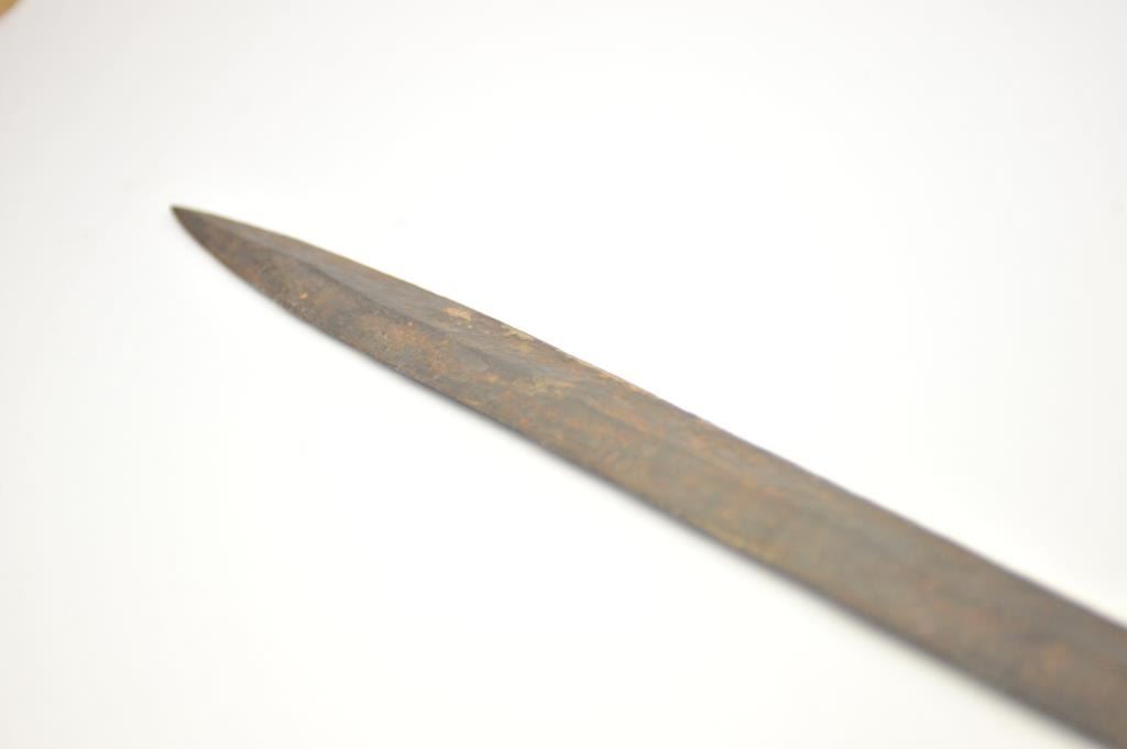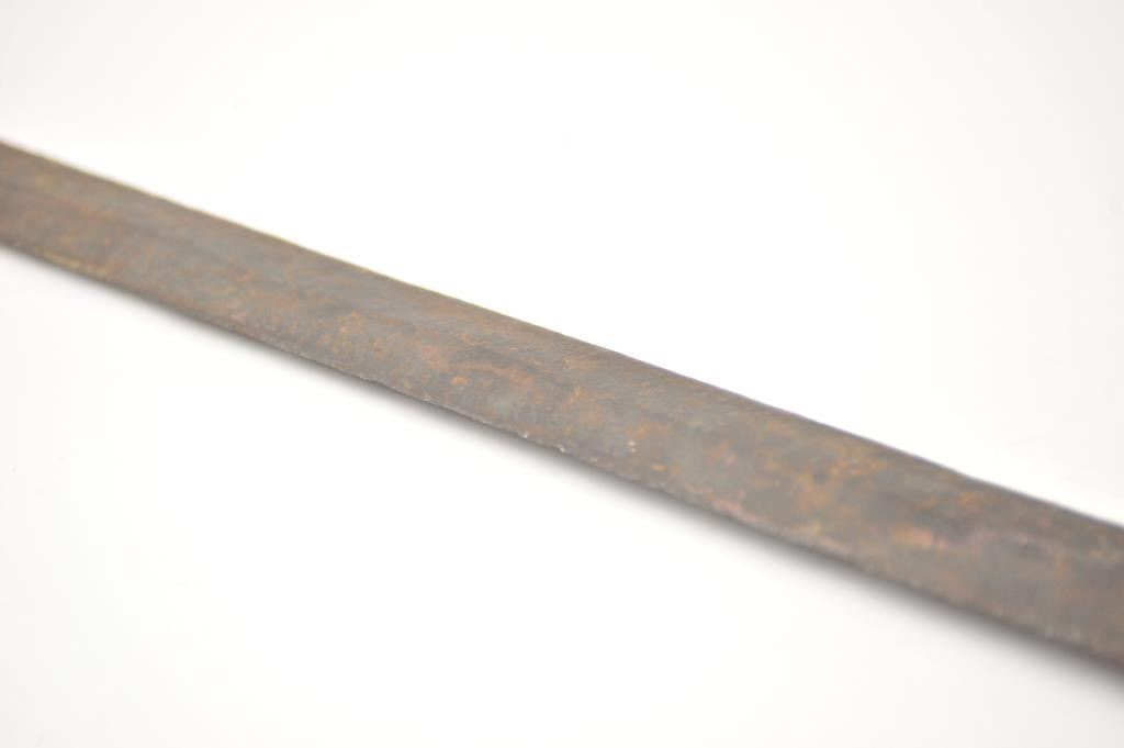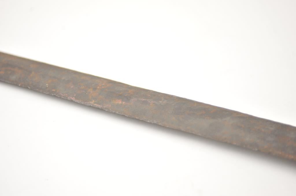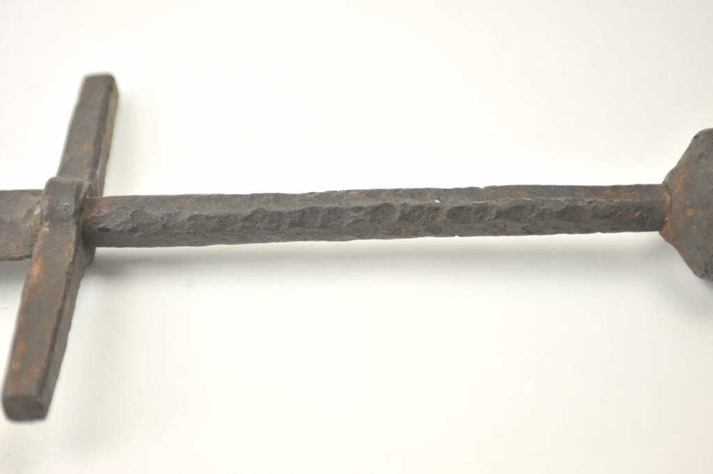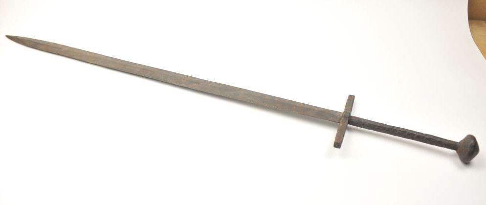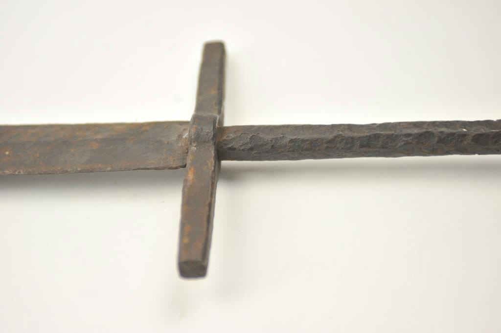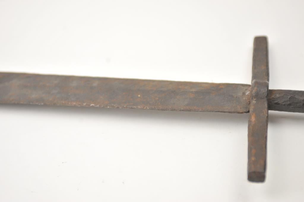 Medieval Relic Broadsword in 15th century style. The sword is 43” in overall length with a 34” blade measuring 1 ½” across at the widest part of the blade with a long triangular early type point. It is 6 ½”across the blunt ended thick guard. It is 9” from the guard to the end of the pommel which shows similar aging. We and two other experts have found no sign of chemical or artificial aging or modern fakery. We willoffer the buyer a 30 day right of return privilege on this lot as we believe in it, as does our consignor. Simply return with 30 days if not satisfied with the originality and purchase price will be refunded. Theweight is 4.3 pounds and the blade is forged correctly. Est.: $2,500-$5,000+++.