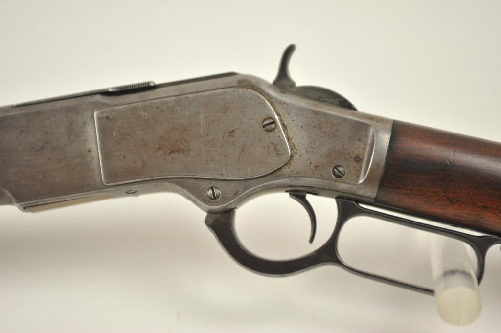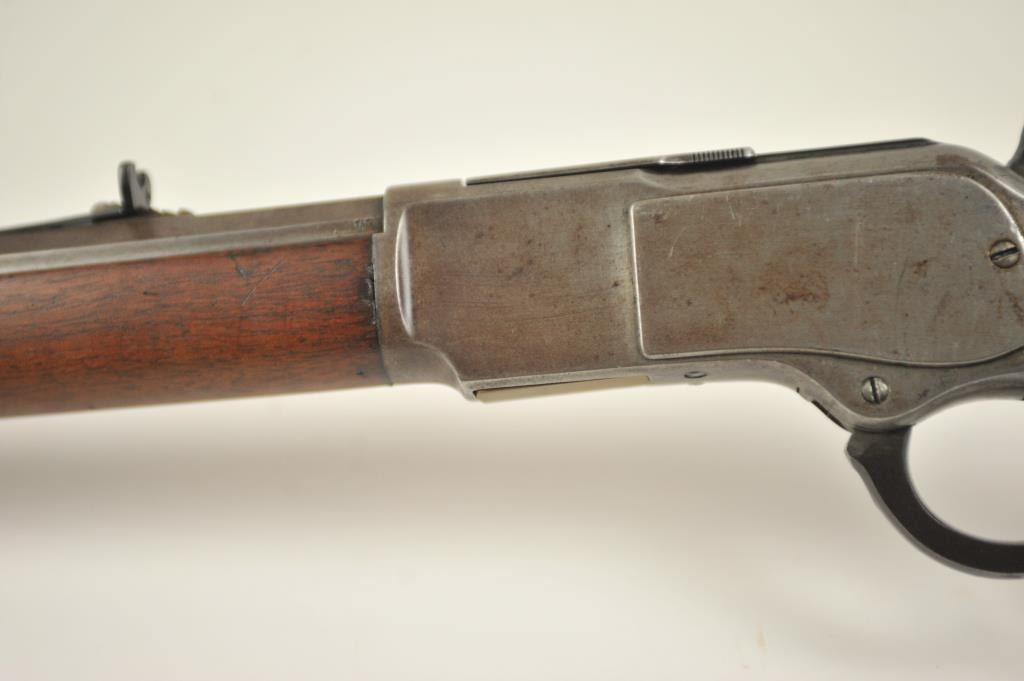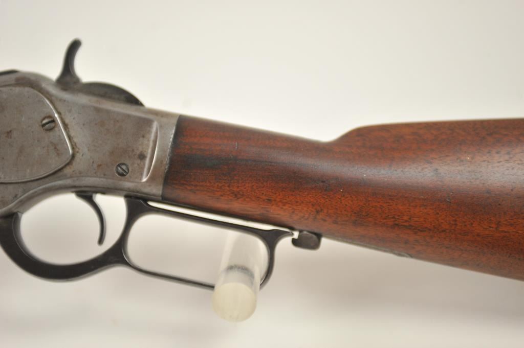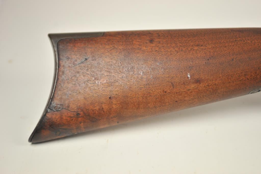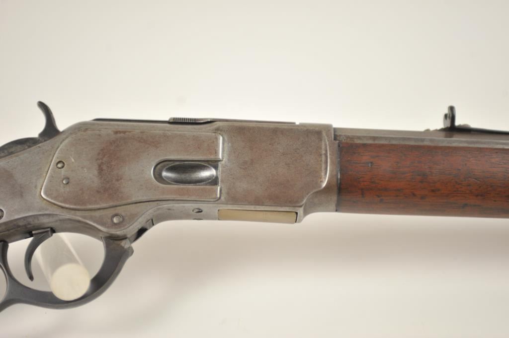 Winchester 1873 Third Model lever action rifle, .44-40 WCF caliber, Serial #452427B. The rifle is in good to very good overall condition with a 24” octagon barrel and full-length magazine. The rifle has gone toan overall grey patina with a replacement rear sight. The caliber marking is still legible on the brass cartridge elevator and the dust cover is present. The hammer shows silvered case hardening and there is stilldull blue on the loading gate. The smooth wood stocks are in good condition with mars and compressions. The butt stock ends with a smooth steel crescent butt plate with a trap and there is a crude repair at the toe. The bore is fair and the action works well on this desirable Model 1873 circa 1893. Est.: $1,250-$2,500. (Antique).