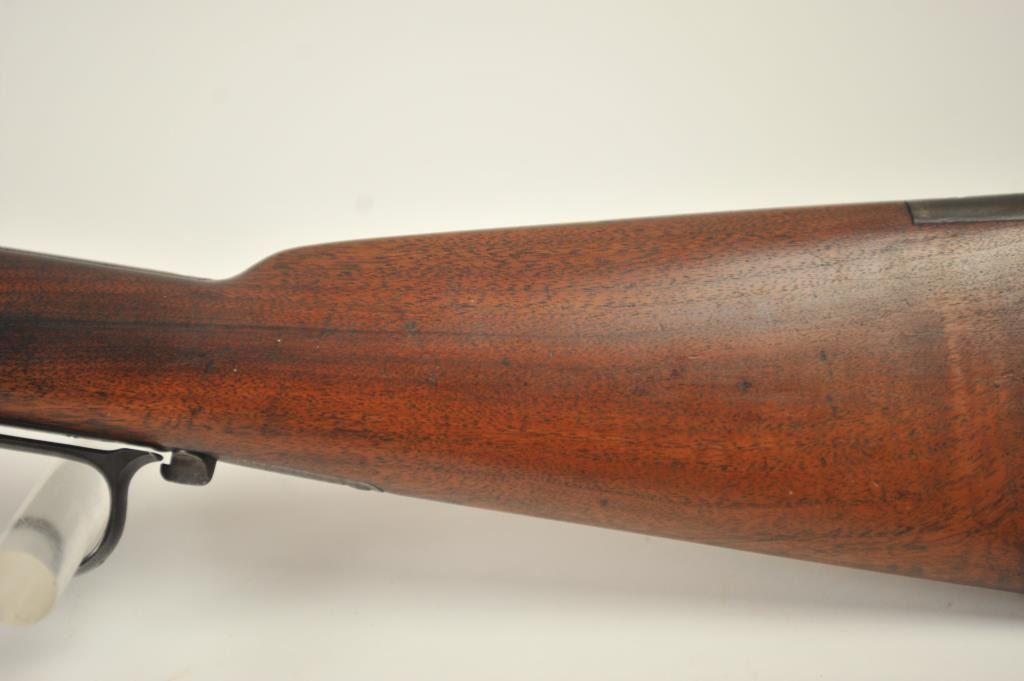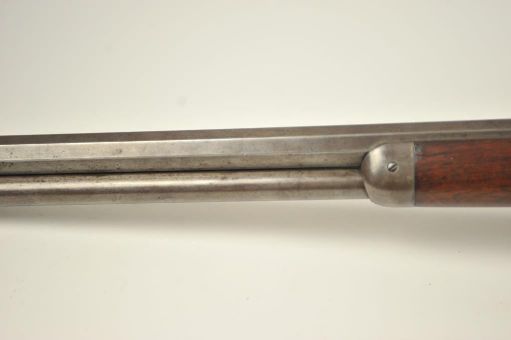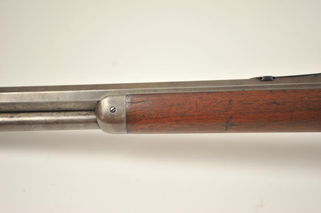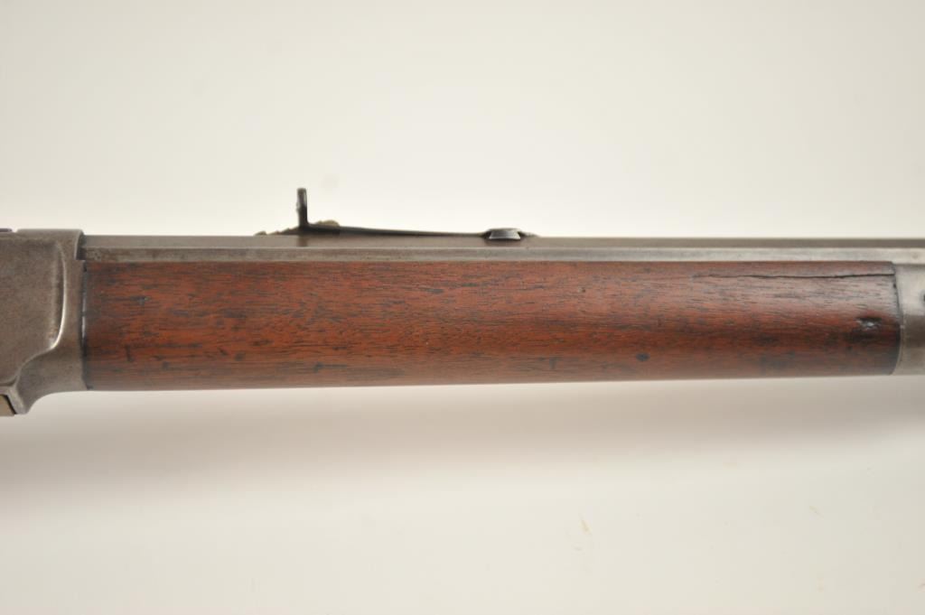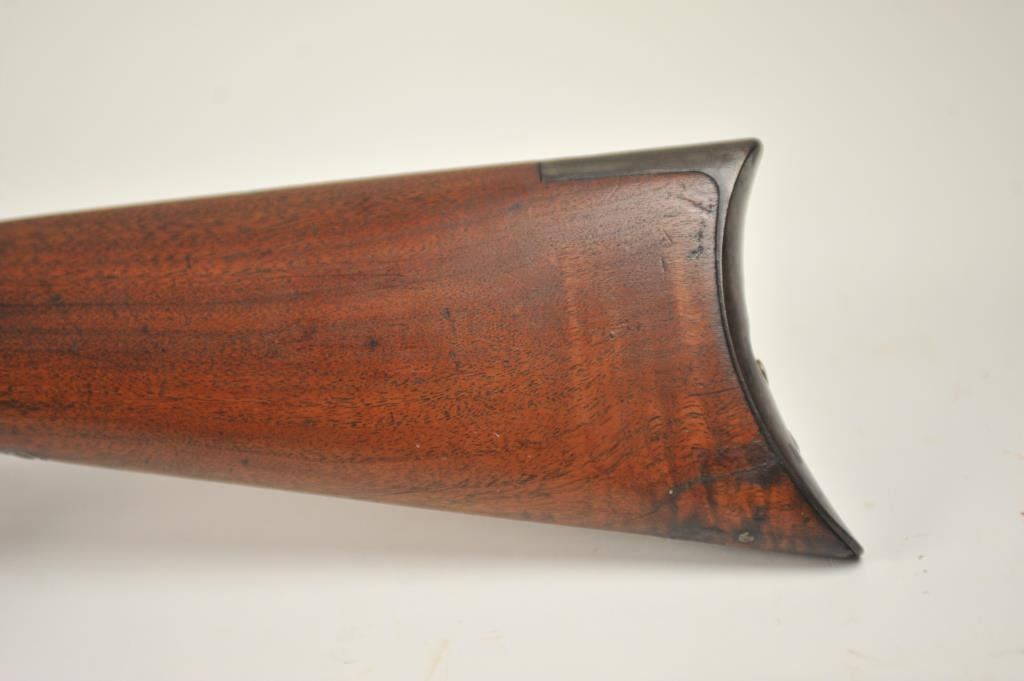 Winchester 1873 Third Model lever action rifle, .44-40 WCF caliber, Serial #452427B. The rifle is in good to very good overall condition with a 24” octagon barrel and full-length magazine. The rifle has gone toan overall grey patina with a replacement rear sight. The caliber marking is still legible on the brass cartridge elevator and the dust cover is present. The hammer shows silvered case hardening and there is stilldull blue on the loading gate. The smooth wood stocks are in good condition with mars and compressions. The butt stock ends with a smooth steel crescent butt plate with a trap and there is a crude repair at the toe. The bore is fair and the action works well on this desirable Model 1873 circa 1893. Est.: $1,250-$2,500. (Antique).