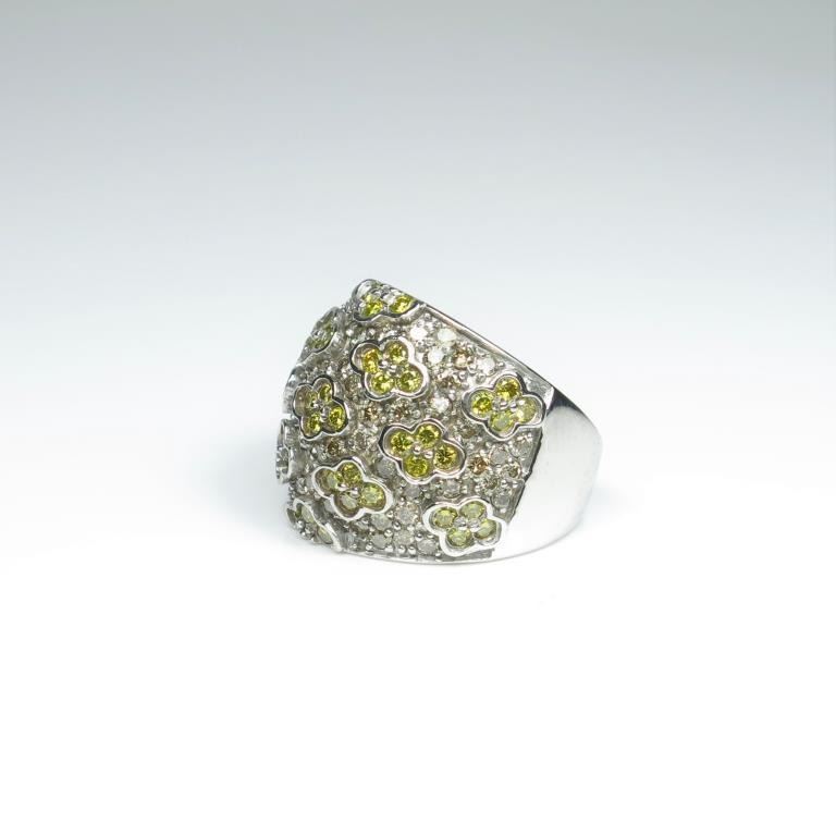 Designer Style Yellow Sapphire and Diamond Ring featuring dome shaped design with detailed mosaic pattern with 46 Sapphires accented with 64 White Diamonds approx. gem weight of 4.00 carats set in 14 karat whitegold setting. Retail $4,000-$5,000 Estimates $2,000-$3,000