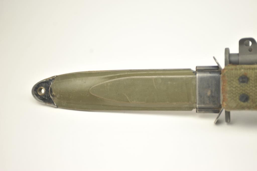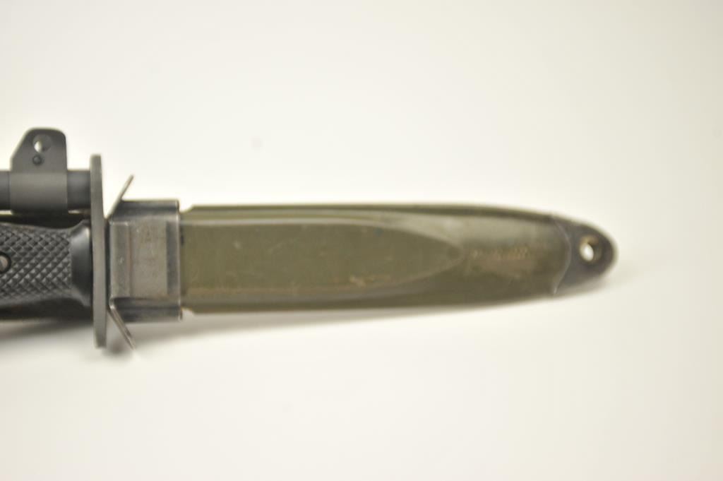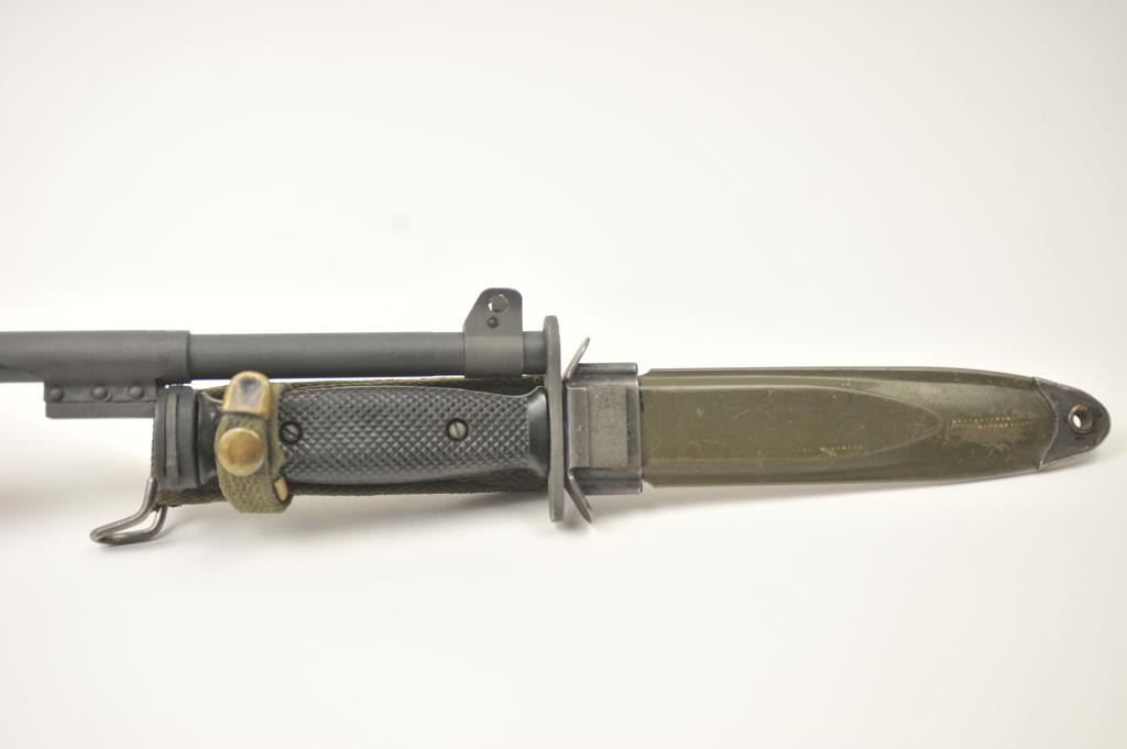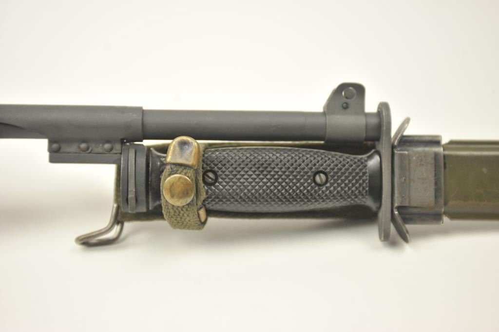 U.S. M1 semi-automatic carbine by Inland, .30 caliber, Serial #5162950. The carbine is in fine overall condition with an 18” Inland marked barrel dated 1944. The carbine retains a significant amount of theparkerized military with storage and handling marks. The smooth wood stock is in very good condition as re-finished with the oiler intact. The bore is good, the action is crisp and the markings are sharp. The lotincludes a U.S. M8A1 marked bayonet with scabbard in very good condition. The bore is good and the action works well. Est.: $750-$1,500. (C+R).