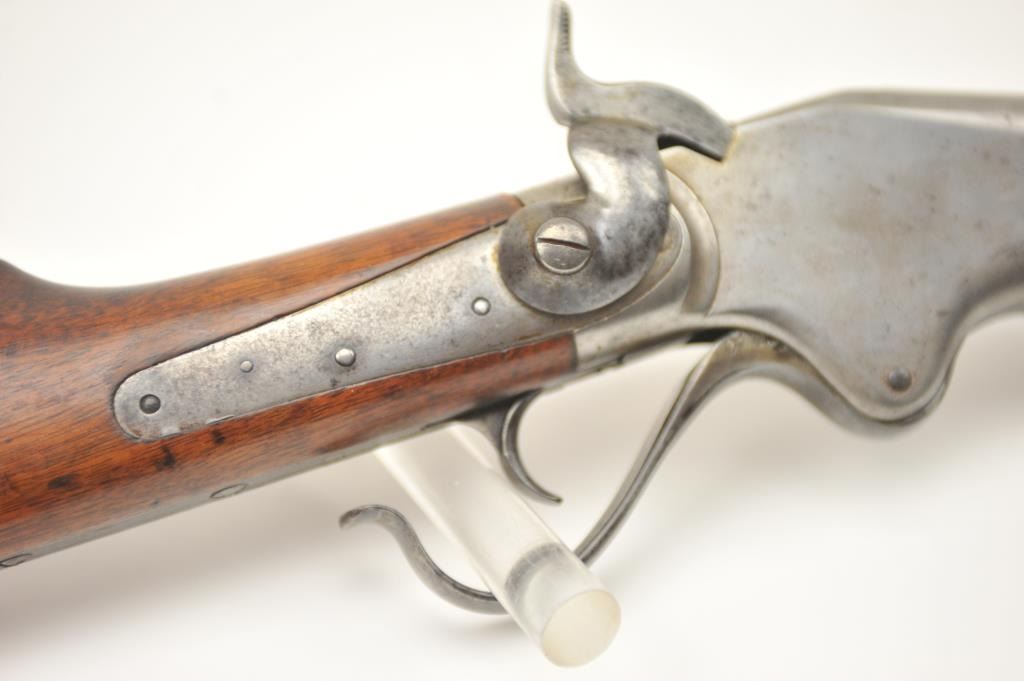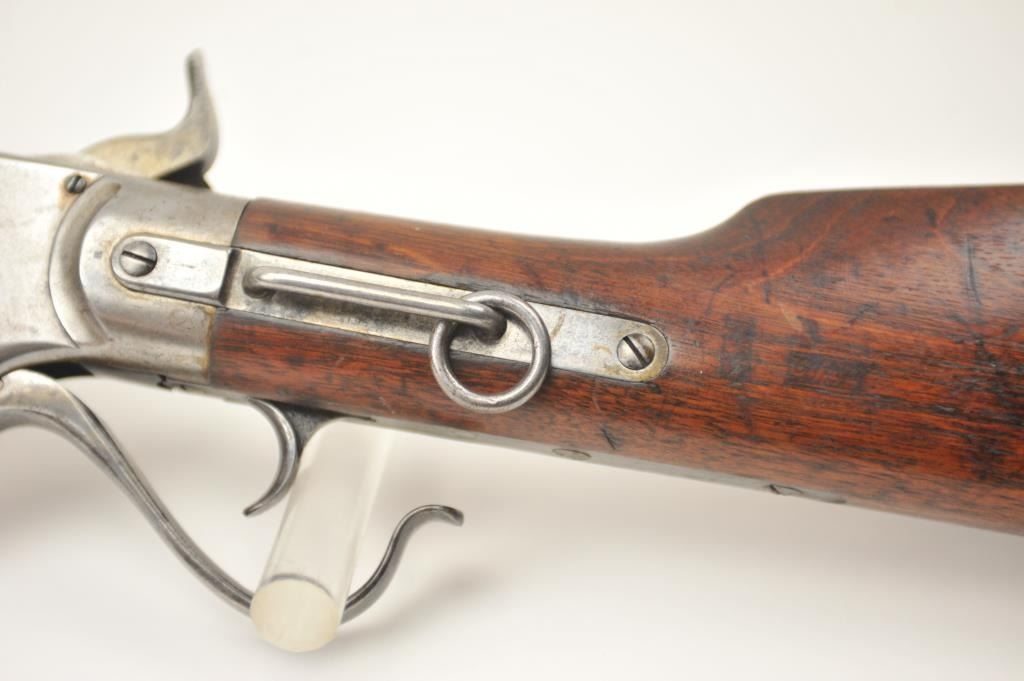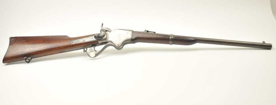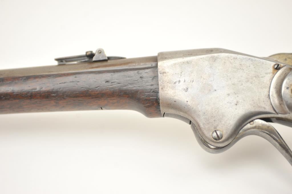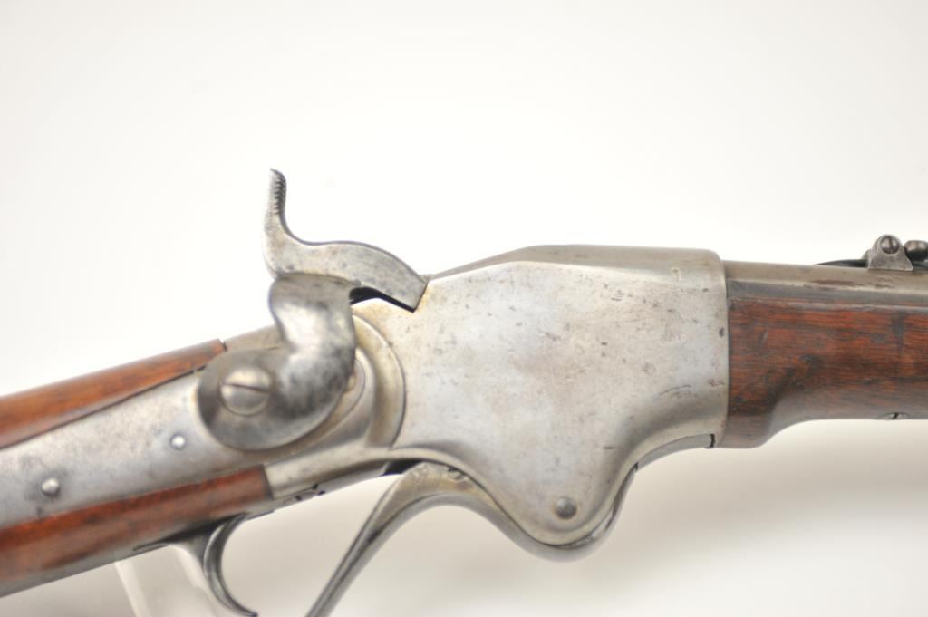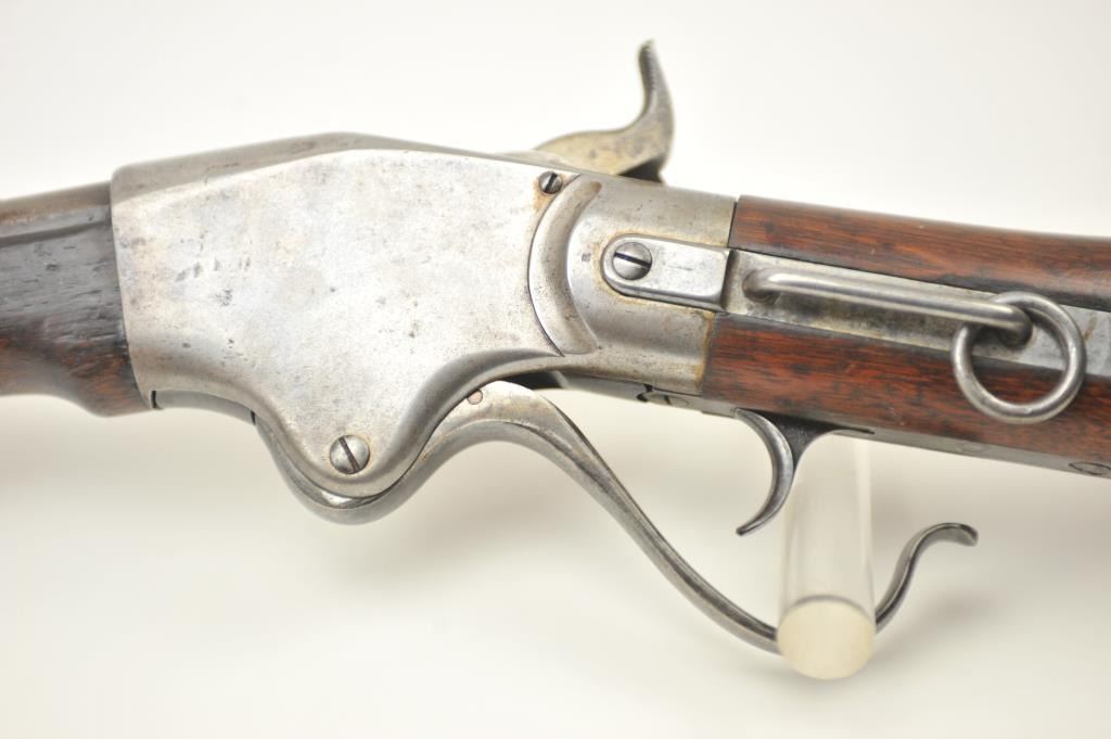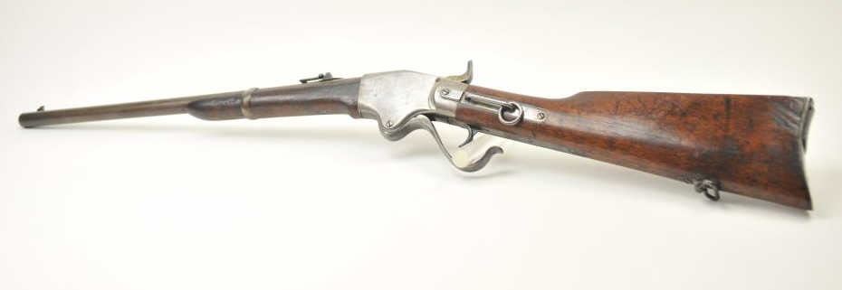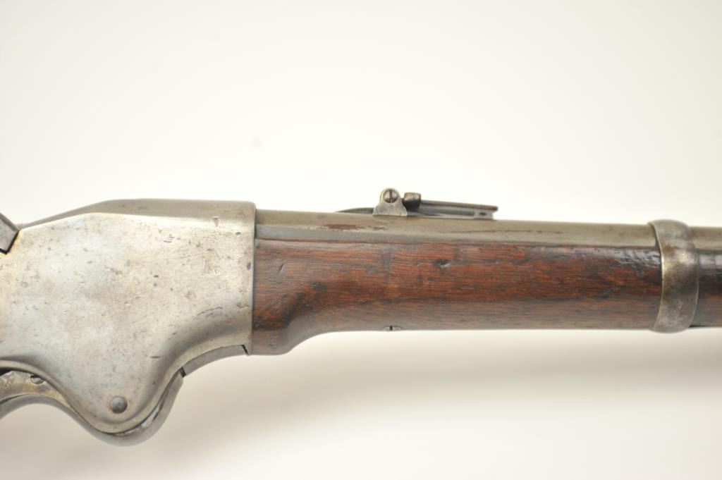 Spencer Model 1860 saddle ring carbine, .52 caliber, Serial #39950. The carbine is in very good overall condition with a Civil War era 22” barrel with a ramped blade and a ladder style rear sights. The barrel hasgone to a grey/brown patina while the receiver is silvered case hardening. The markings on the receiver are light but legible. The saddle ring is present with areas of dull case hardening evident. Thesmooth wood stock is in good condition with mars and dents consistent with carry and use. There are two sharp cartouches behind the saddle ring plate. The bore is fair and the action is crisp on this desirable Civil Warera Spencer. Est.: $1,400-$2,800. (Antique).