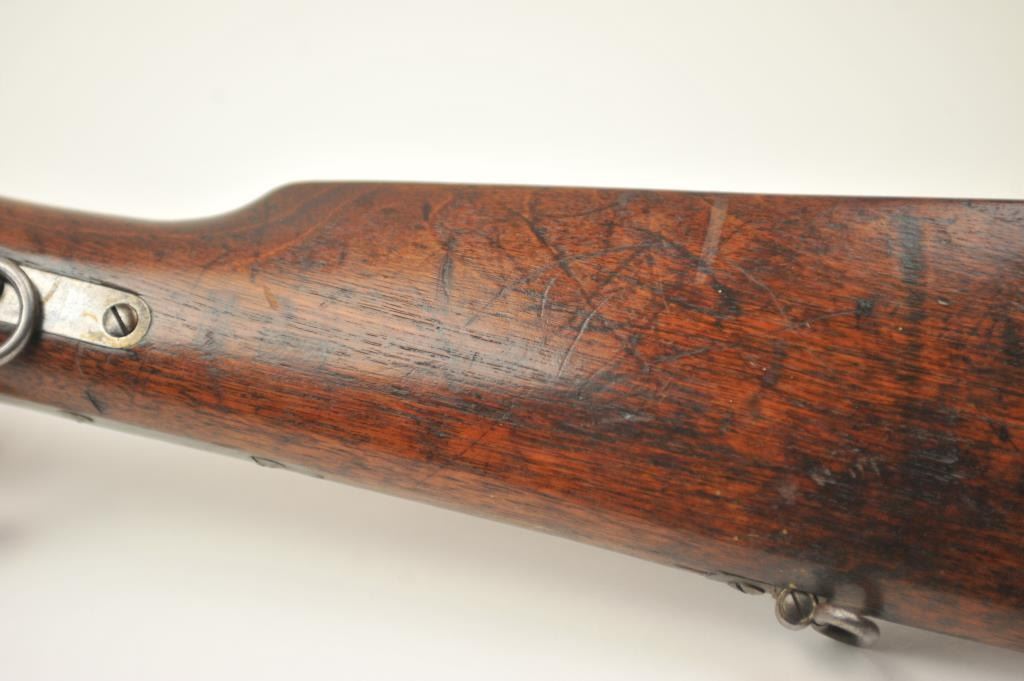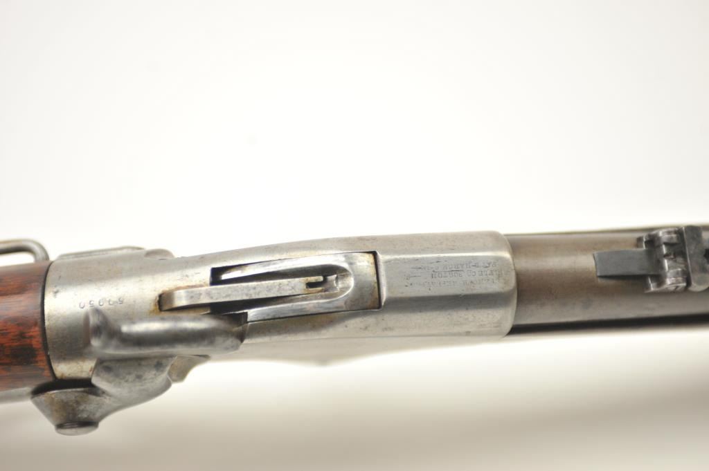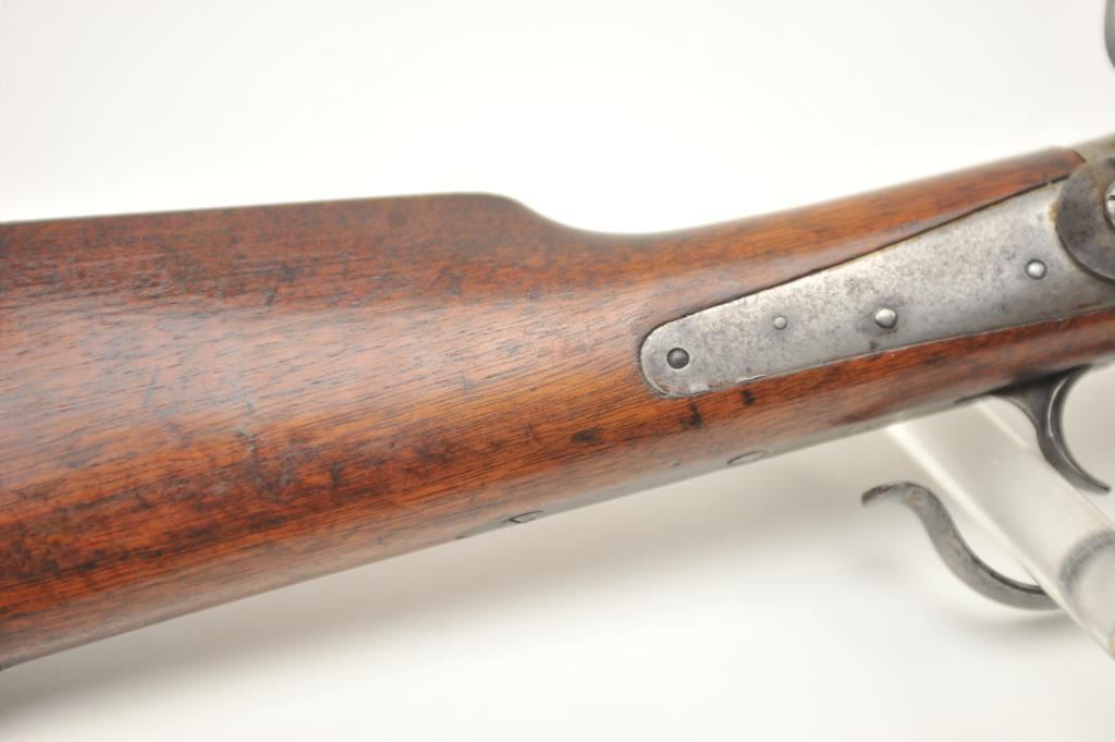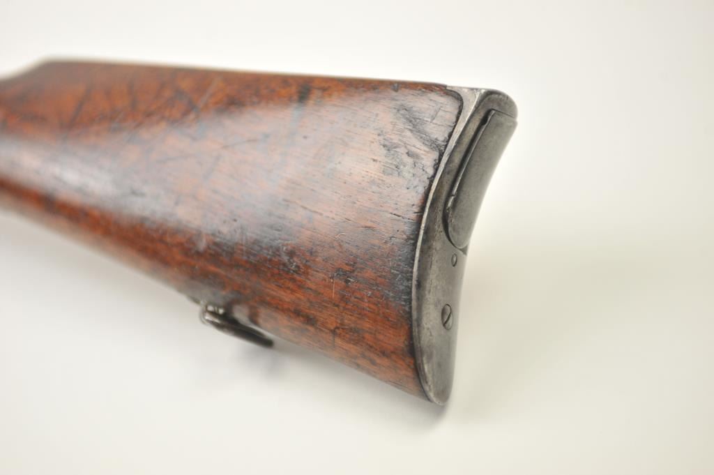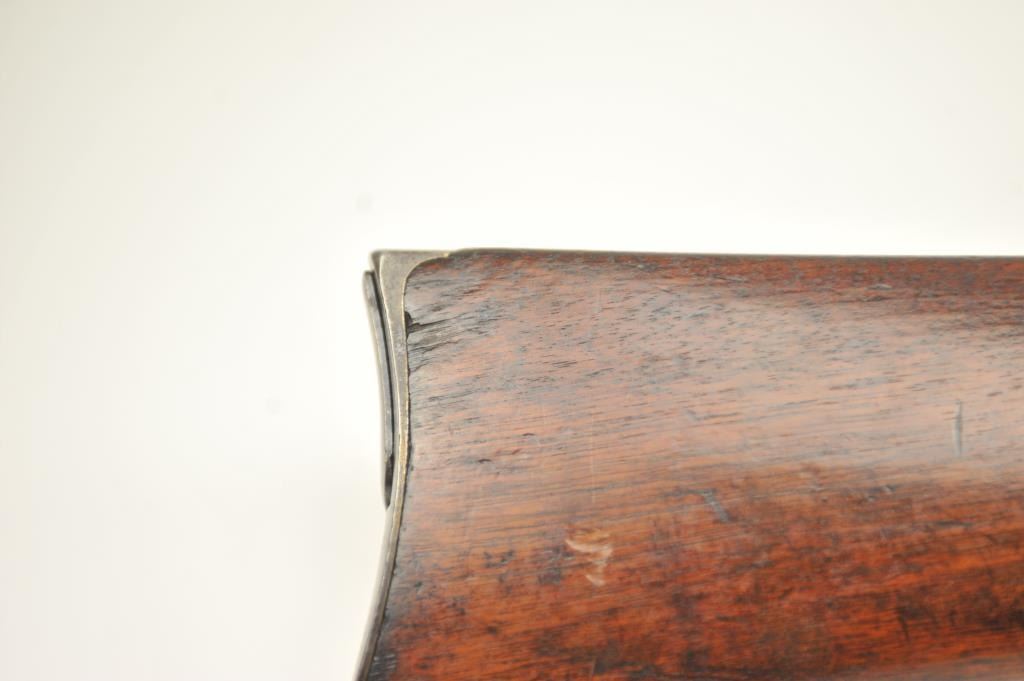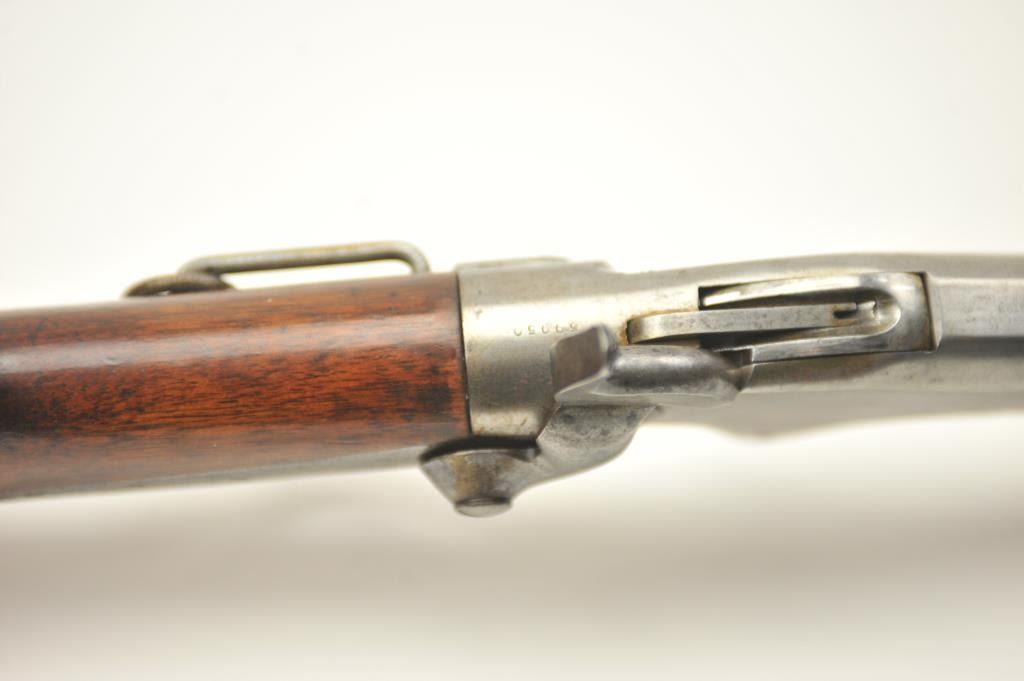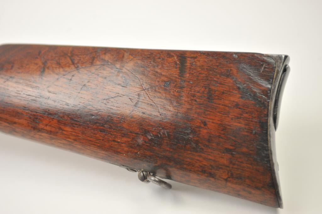 Spencer Model 1860 saddle ring carbine, .52 caliber, Serial #39950. The carbine is in very good overall condition with a Civil War era 22” barrel with a ramped blade and a ladder style rear sights. The barrel hasgone to a grey/brown patina while the receiver is silvered case hardening. The markings on the receiver are light but legible. The saddle ring is present with areas of dull case hardening evident. Thesmooth wood stock is in good condition with mars and dents consistent with carry and use. There are two sharp cartouches behind the saddle ring plate. The bore is fair and the action is crisp on this desirable Civil Warera Spencer. Est.: $1,400-$2,800. (Antique).
