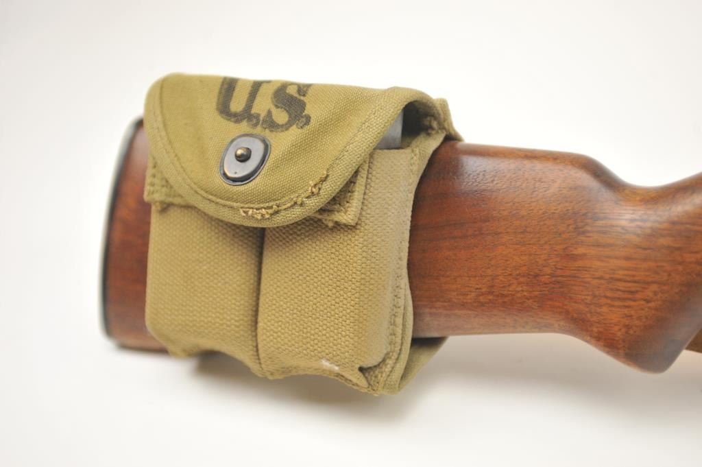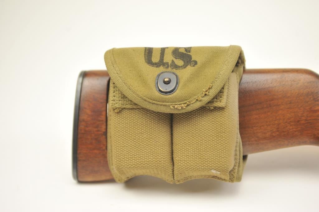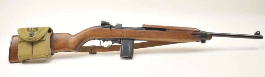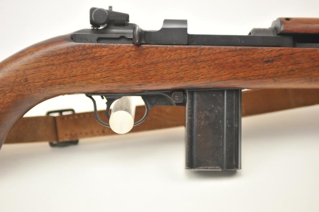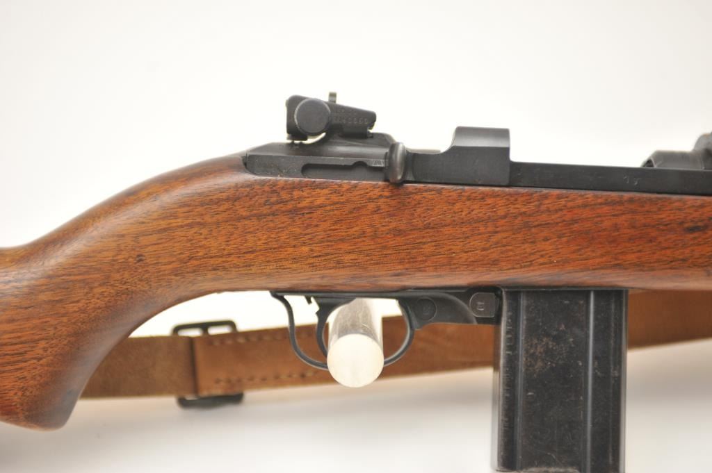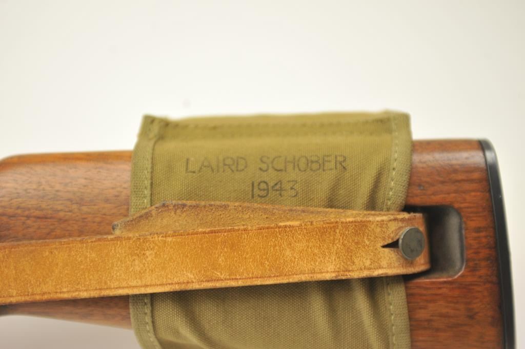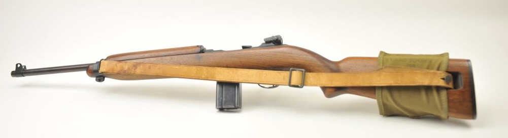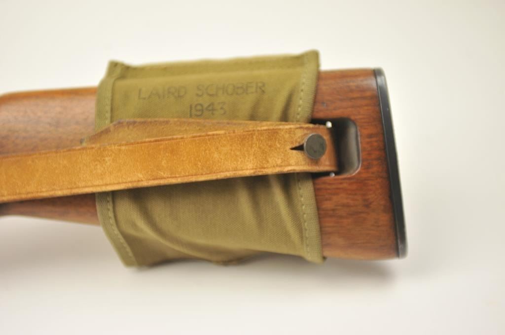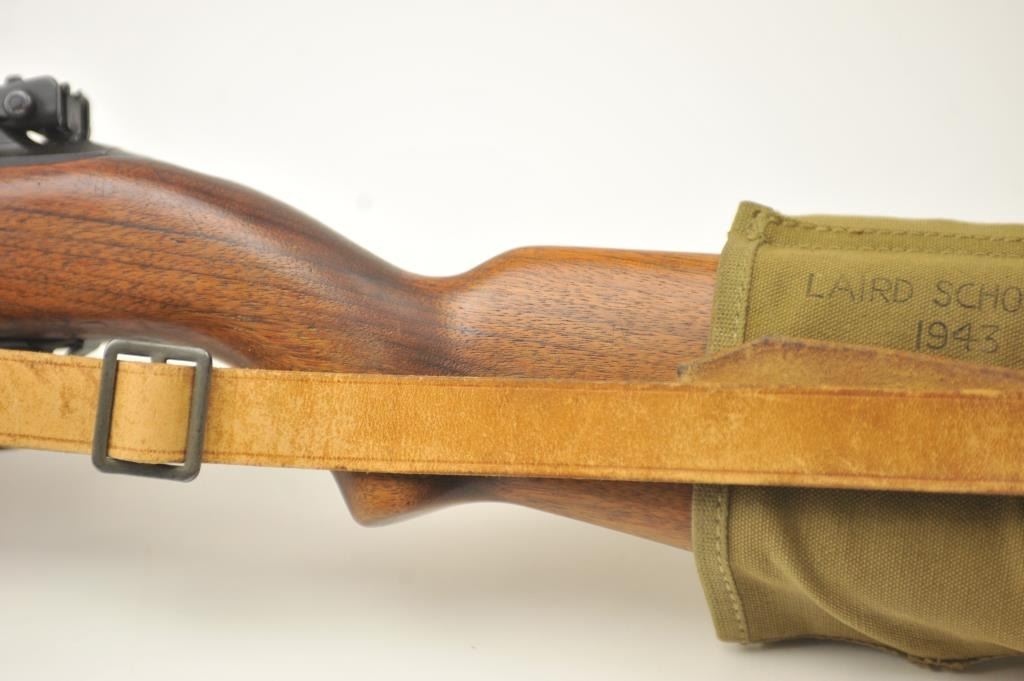 U.S. M1 semi-automatic carbine by Saginaw, .30 caliber, Serial #3362819. The carbine is in fine overall condition as re-finished. The carbine retains nearly all of an old post-war dealer re-finish with storage andhandling marks. The smooth wood stock is in very good condition with mars and small repairs. The oiler is intact and a period leather rifle sling added. A period canvas U.S. marked magazine pouch with “LAIRDSCHOBER 1943” stenciled on the reverse in very good condition. The bore is good, the action is crisp and the markings are sharp. The lot includes three 15 round military magazines (Not available in California orwhere prohibited). Est.: $600-$1,200. (C+R).