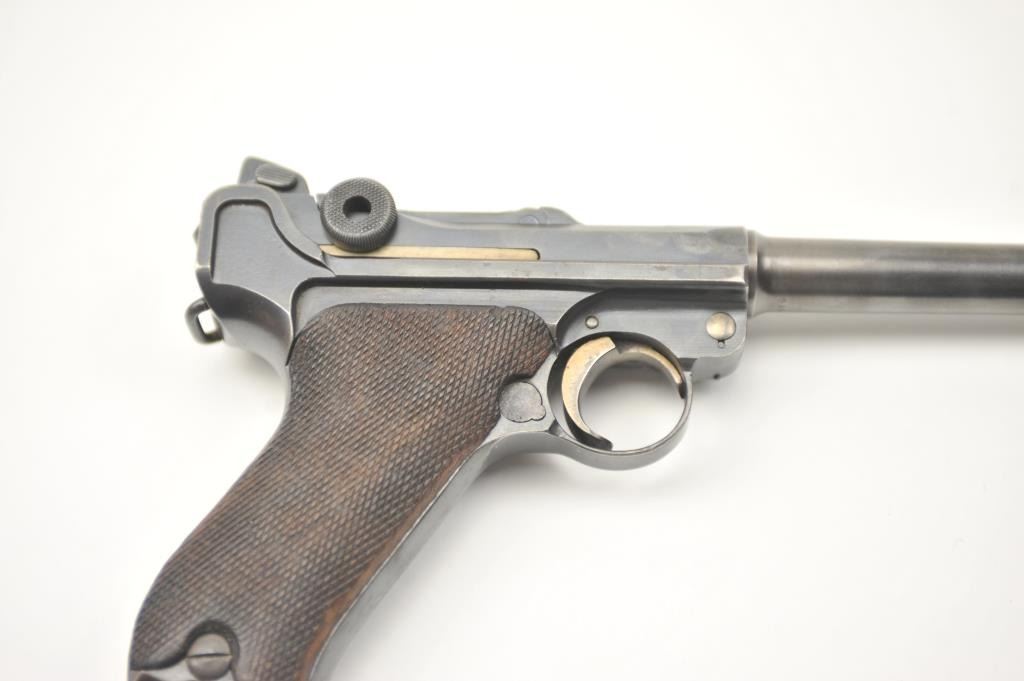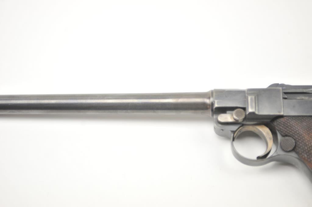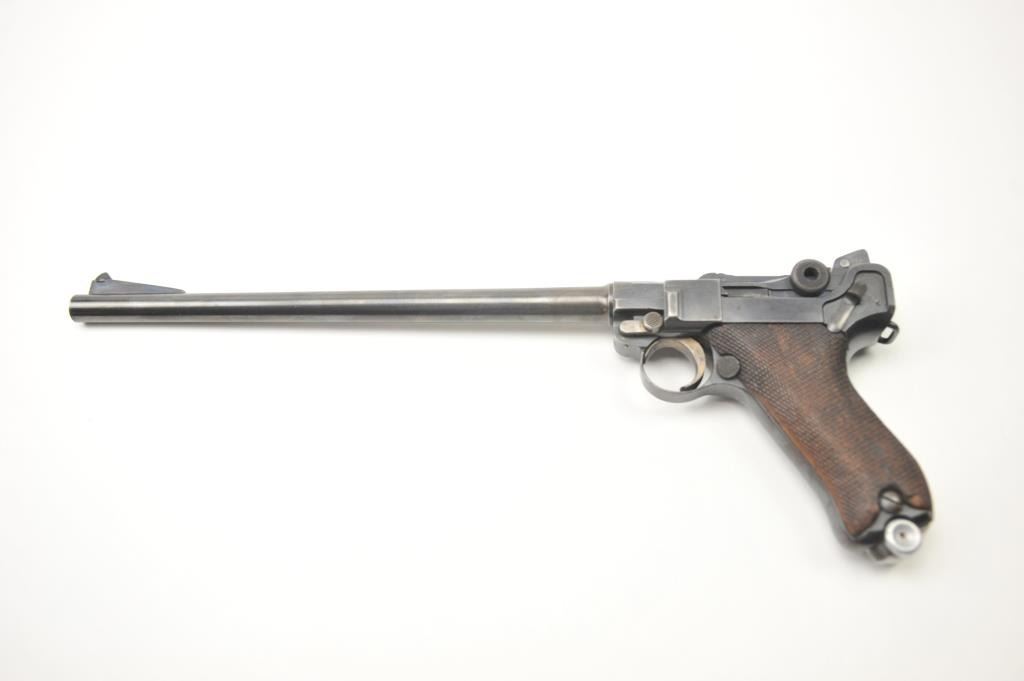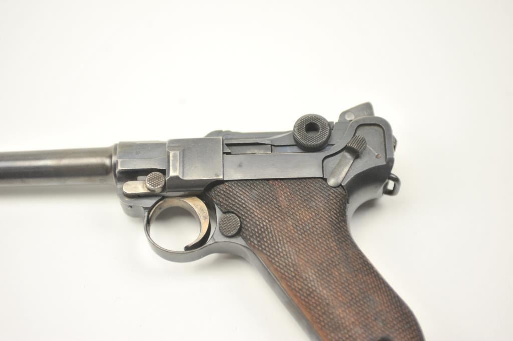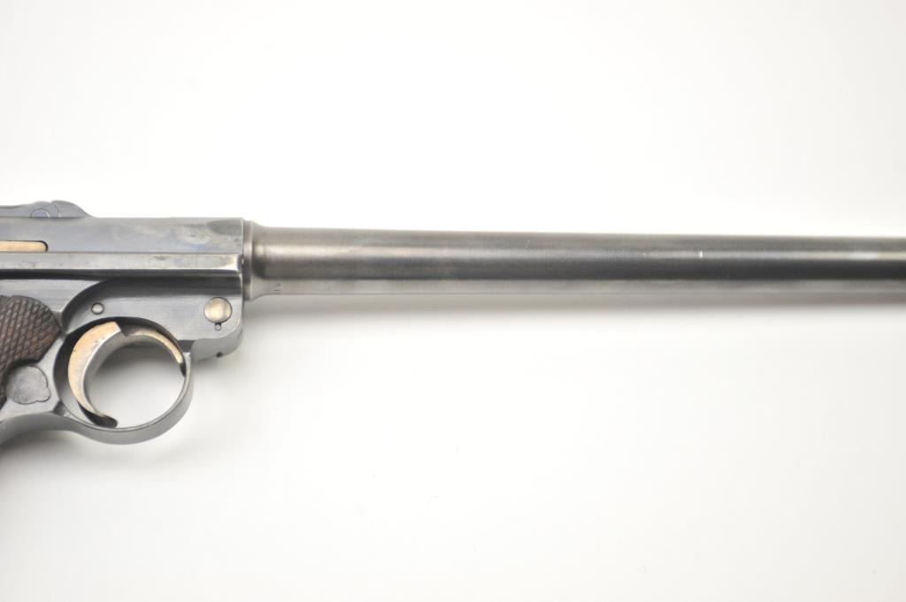 Luger carbine in 9mm with a 12” barrel, navy type rear sight, Post WWI crown “N” proof, S/N 9195 circa 1920s. This Luger originally had a stock lug which was ground off by a collector who was wary of 1968 gun control.Regulations before curio relic status exempted stocked pistols. Correct ramp type front sight base similar to standard carbine. 80%-90% original blue with losses on straps. The grips show wear but good overall. Latermagazine. Matching visible numbers including sight. Very bright bore and good action. We would recommend restoring the lug and adding a stock as it is a scarce Luger worthy of expense. (C&R/PPT) Est.: $1400-$2800