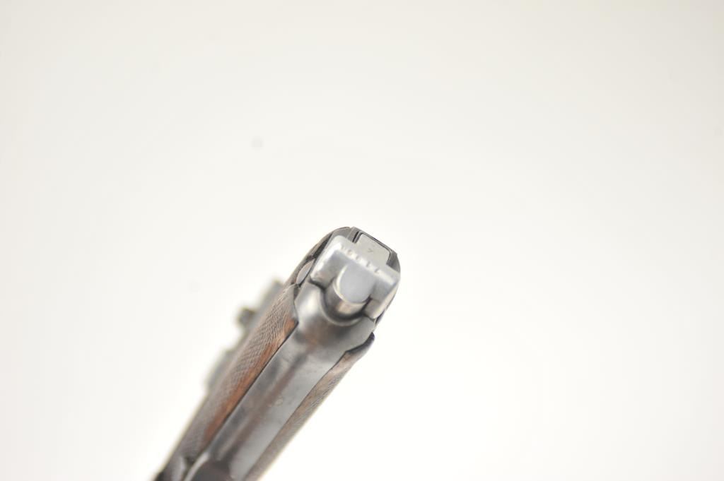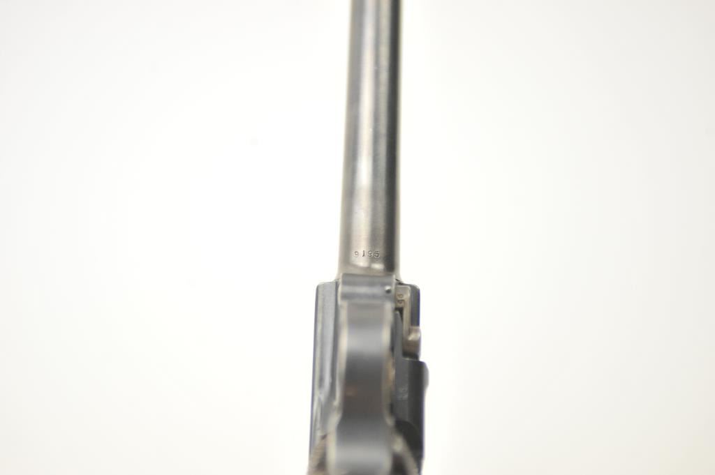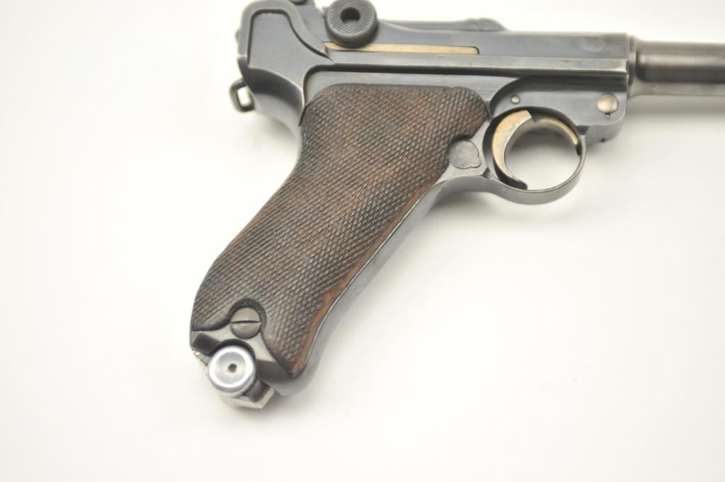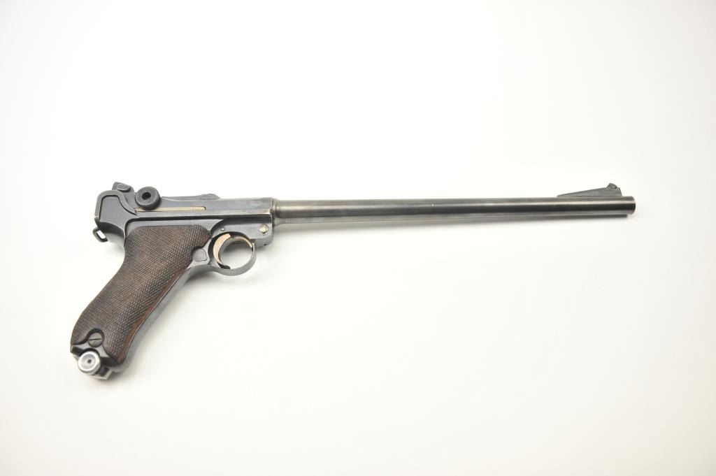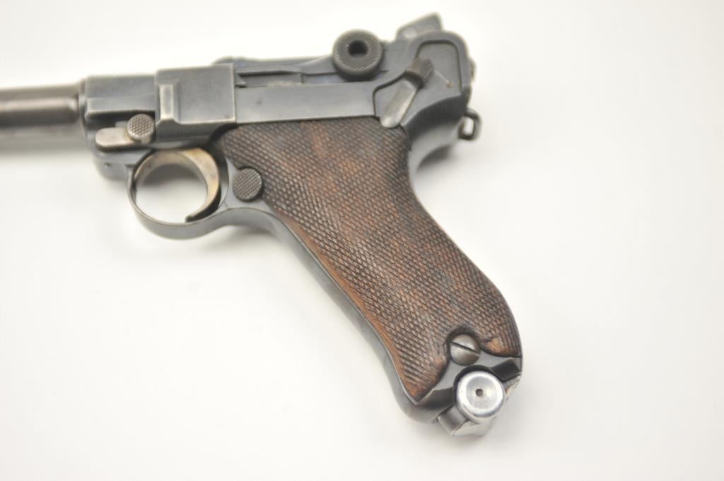 Luger carbine in 9mm with a 12” barrel, navy type rear sight, Post WWI crown “N” proof, S/N 9195 circa 1920s. This Luger originally had a stock lug which was ground off by a collector who was wary of 1968 gun control.Regulations before curio relic status exempted stocked pistols. Correct ramp type front sight base similar to standard carbine. 80%-90% original blue with losses on straps. The grips show wear but good overall. Latermagazine. Matching visible numbers including sight. Very bright bore and good action. We would recommend restoring the lug and adding a stock as it is a scarce Luger worthy of expense. (C&R/PPT) Est.: $1400-$2800
