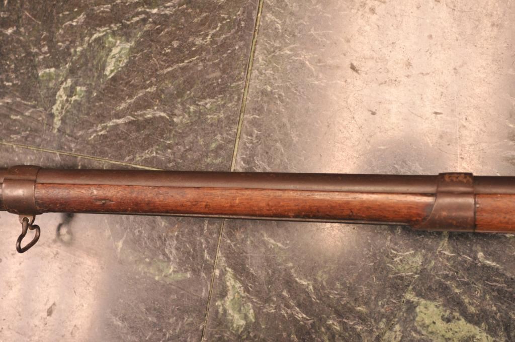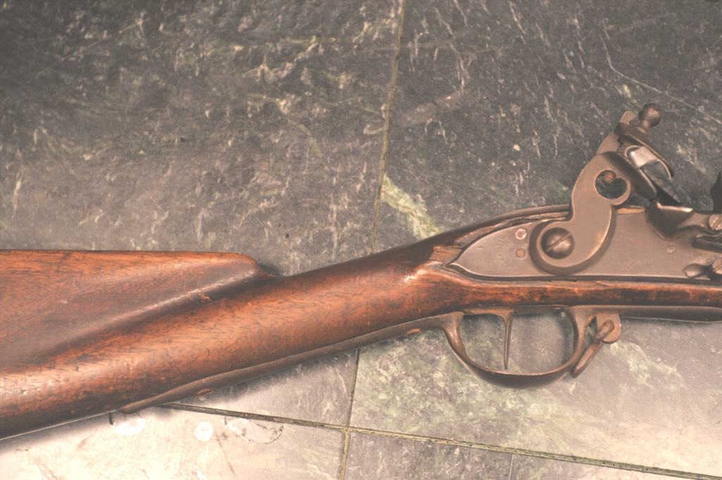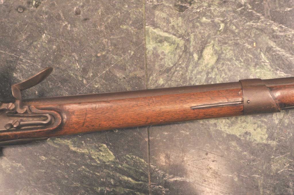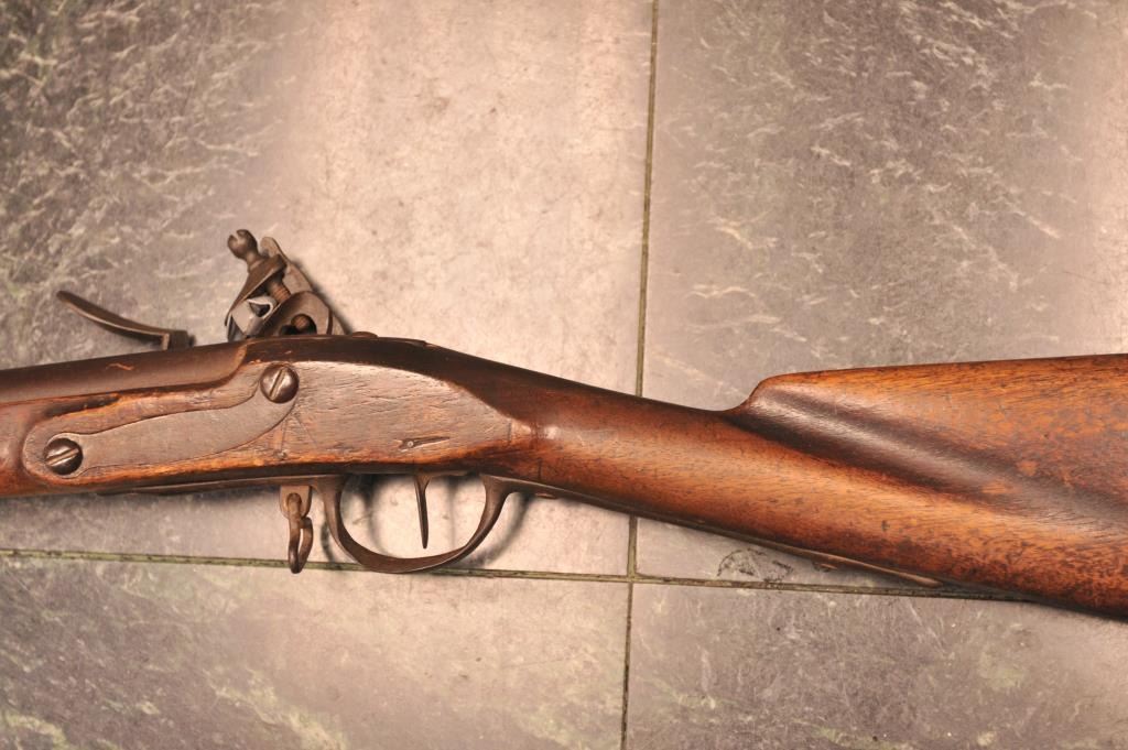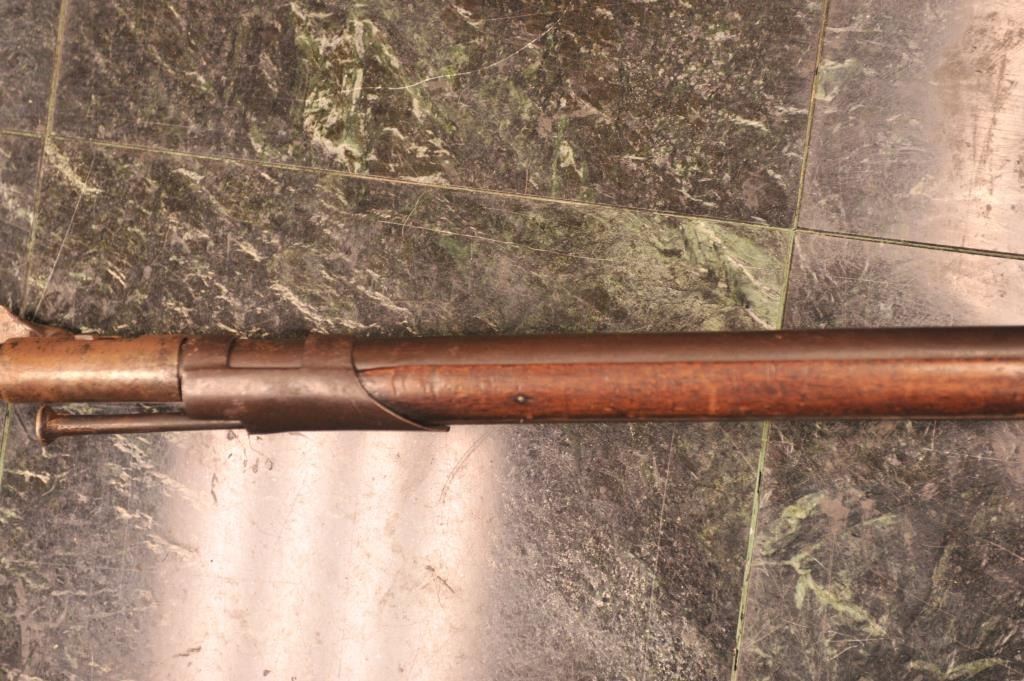 U.S. Model 1797 Springfield flintlock musket in .69 caliber with bayonet and rod. In original flintlock configuration, Type I with a 44 ½” barrel (No visible date on the butt plate). Eagle over U.S. in script andSpringfield in curve at rear of lock, with a 1 ¼” lug for bayonet mounted at muzzle with bayonet. Original swivels, original full-length configuration with the correct hammer, frizzen and small parts. Darkuncleaned patina with minor pitting and erosion. The stock is good for its age with small losses around the rear of the lock and tang and along the ram rod channel. There are other minor imperfections, the bayonetshows light to heavy pitting. The first musket made at Springfield Armory of which about 25,000 were made and mostly shortened. A better than average example from an early collectors estate. Est.: $1,750-$3,500+++. (Antique).