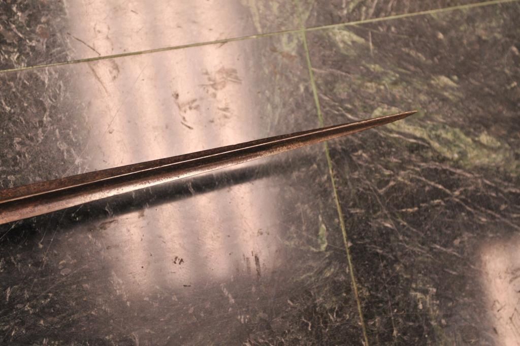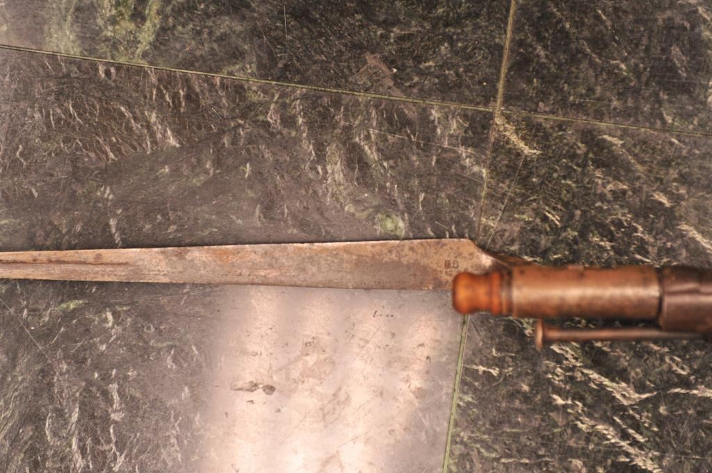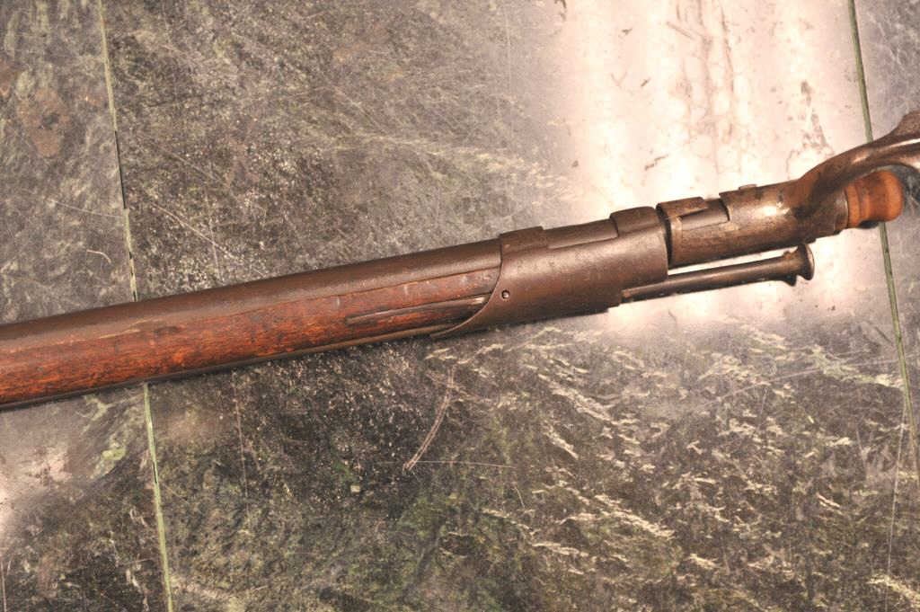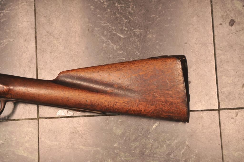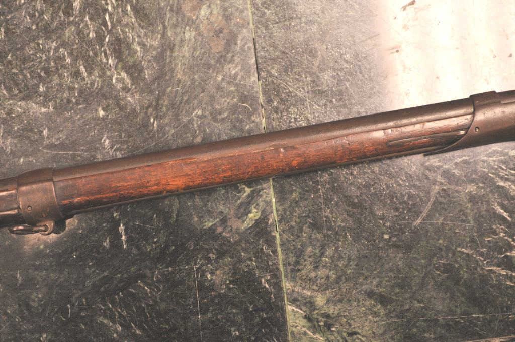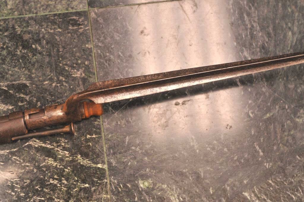 U.S. Model 1797 Springfield flintlock musket in .69 caliber with bayonet and rod. In original flintlock configuration, Type I with a 44 ½” barrel (No visible date on the butt plate). Eagle over U.S. in script andSpringfield in curve at rear of lock, with a 1 ¼” lug for bayonet mounted at muzzle with bayonet. Original swivels, original full-length configuration with the correct hammer, frizzen and small parts. Darkuncleaned patina with minor pitting and erosion. The stock is good for its age with small losses around the rear of the lock and tang and along the ram rod channel. There are other minor imperfections, the bayonetshows light to heavy pitting. The first musket made at Springfield Armory of which about 25,000 were made and mostly shortened. A better than average example from an early collectors estate. Est.: $1,750-$3,500+++. (Antique).