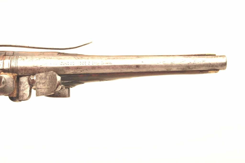 Pair of snaphance flintlock pistols by Giovanni Zambonetti circa 18th century with gilded brass engraved mounts formerly Joe Kundig collection. Measures 14” overall with 8 ¼” barrels of .44 smoothbore. Fineengraving and beautifully chiseled and sculptured frizzen with heads and piercing. (Antique) Est.: $3,000-$6,000