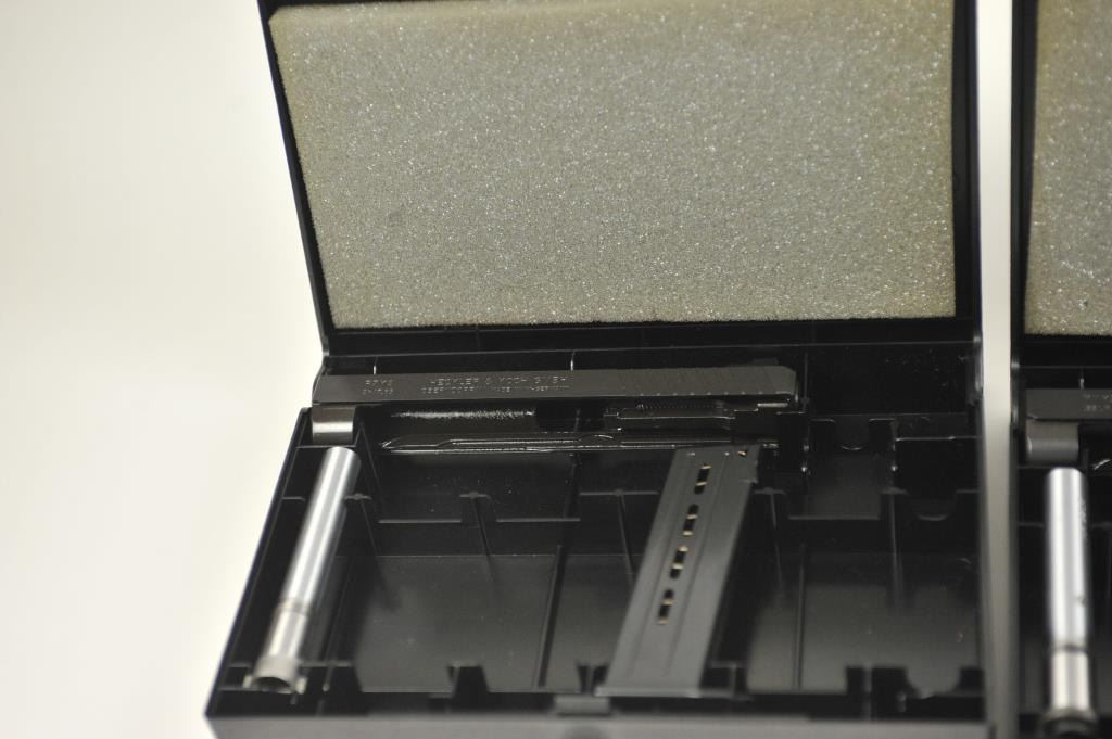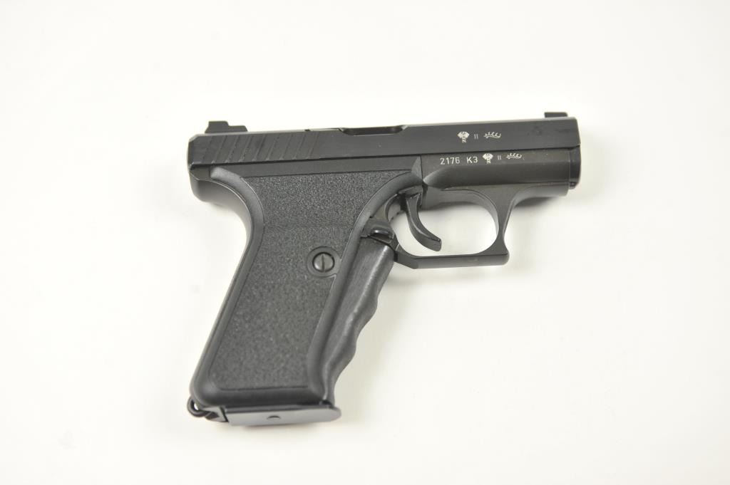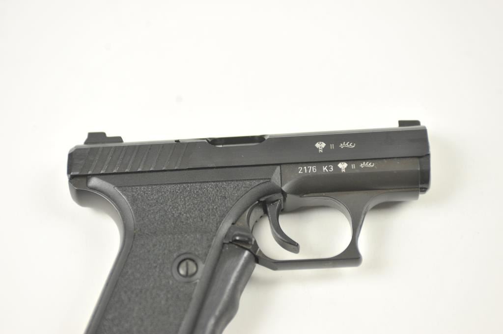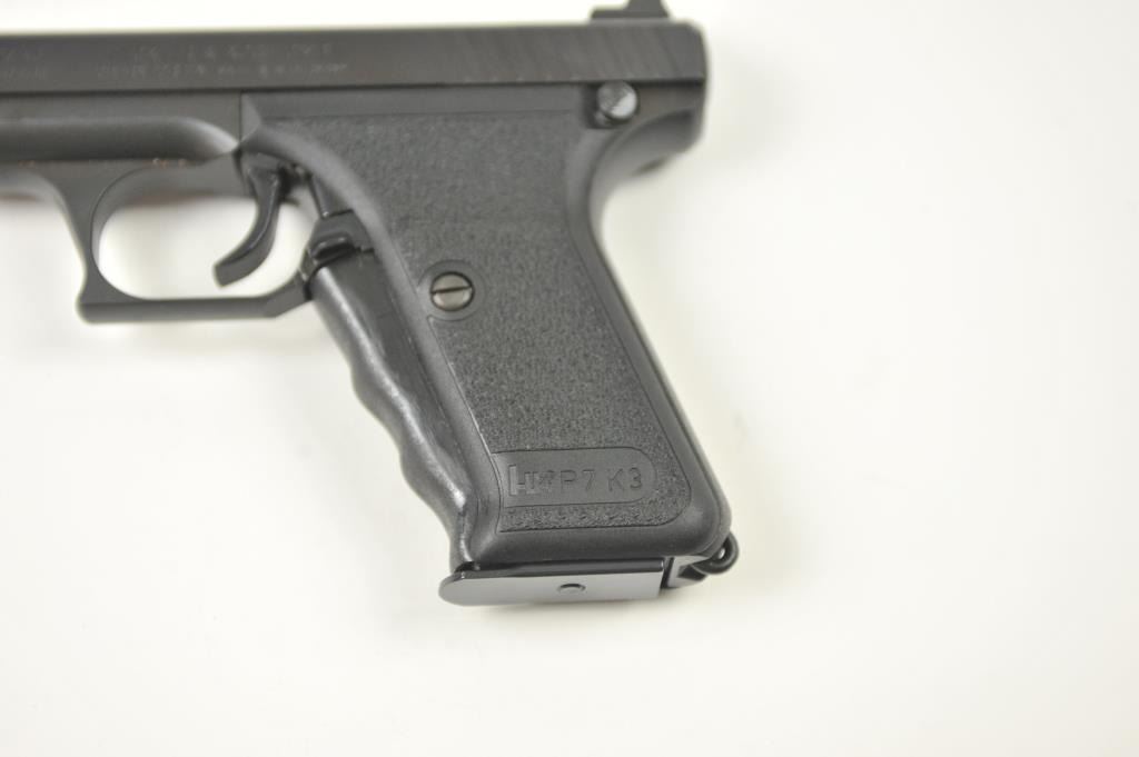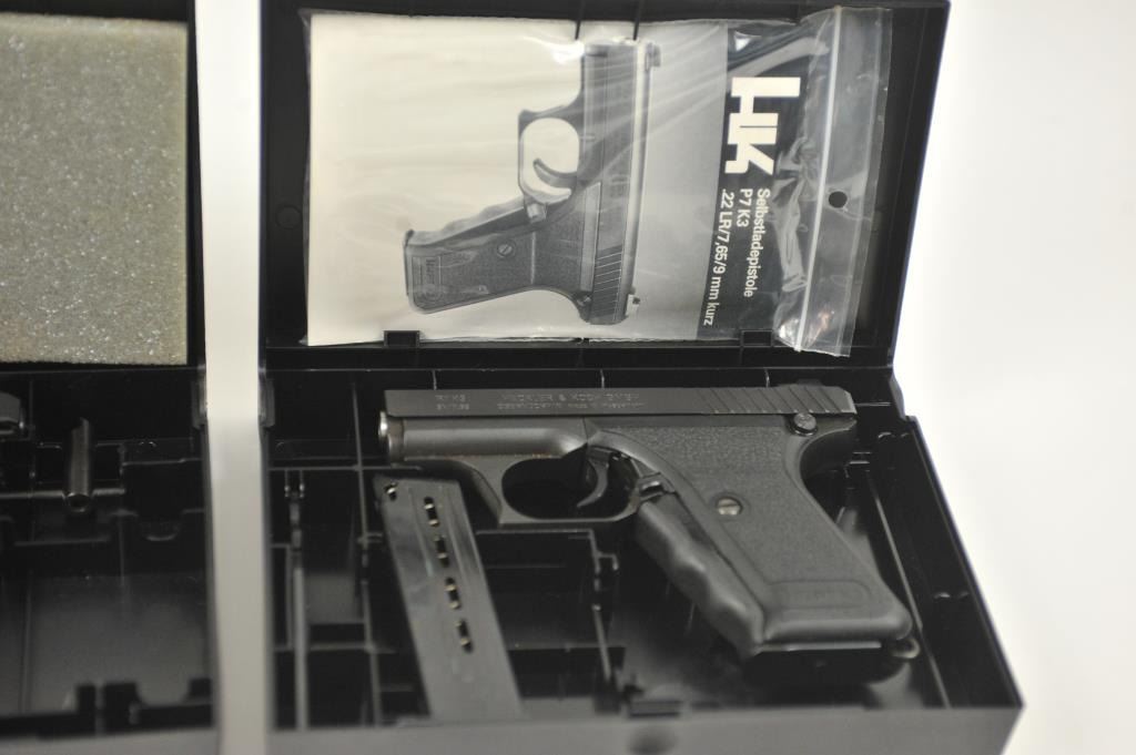 Very rare and desirable Heckler Koch P7K3 squeeze cocking semi automatic pistol three caliber set, #2176K3, 7.65 cal, 3.75” barrel, blued finish with 3 dot fixed sights and black stippled HK logo grips. Pistol is inexcellent overall condition, showing 98-99% original matte finish, with excellent bore, crisp action, and fine plus grips. Original plastic box and test target numbered to the gun, original manual, and two magazines. Set also includes a caliber conversion in 9mm Kurz (.380 cal), with slide numbered to the gun, barrel and magazine marked 9K, in excellent condition, in a plastic box marked AT-P7 K3, and a caliber conversion kit for.22 LR, with slide and barrel (not numbered) marked .22 LR, insert, in excellent condition, with .22 marked mag, takedown tool, and extractor tool also in a plastic case marked AT-P7 K3. Seldom offered forsale, and almost never in this condition. (Modern/PPT) Est. $3500-7000