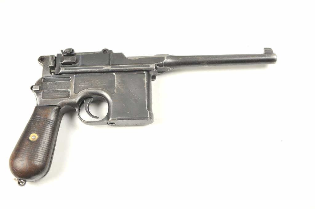 Mauser Model 1896 .30 caliber (7.65mm Mauser), semi-automatic pistol with stock-holster, leather carrier, take down tool and two stripper clips. The pistol retains 50-70% original thinning and toningblue finish with minor scratches and normal aging #254927. Good markings, minor scratches. Grips good but worn. Action is good and the bore is fair to good with erosion showing wear. The stock is a goodreproduction and the carrier shows 1916 date and maker’s mark in Berlin. Est.: $1,400-$2,800. (C+R/PPT).