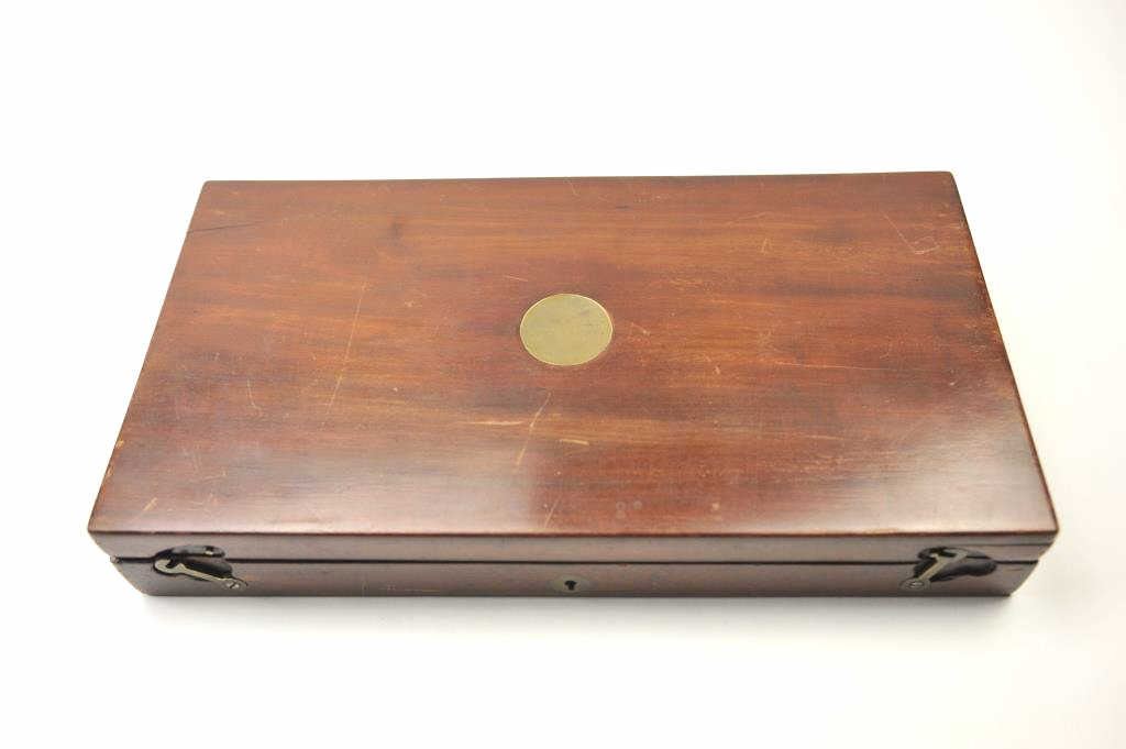 The case shows age and is probably period with purple velveteen interior showing wear at the contact points and normal aging. The exterior is Walnut with English style brass hardware. We were unable to locate this set on the Fort Bliss inventory or other sources of research. However, we do remember the set and Jimmy Fowler owned some of the best American historic Winchester and Colt firearms in his era of collecting and he prized this pair. Est.: $6,000-$12,000. (Antique).