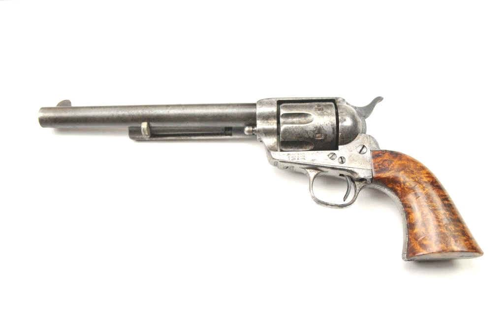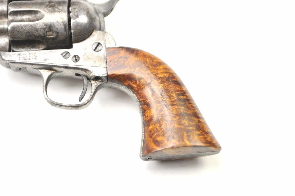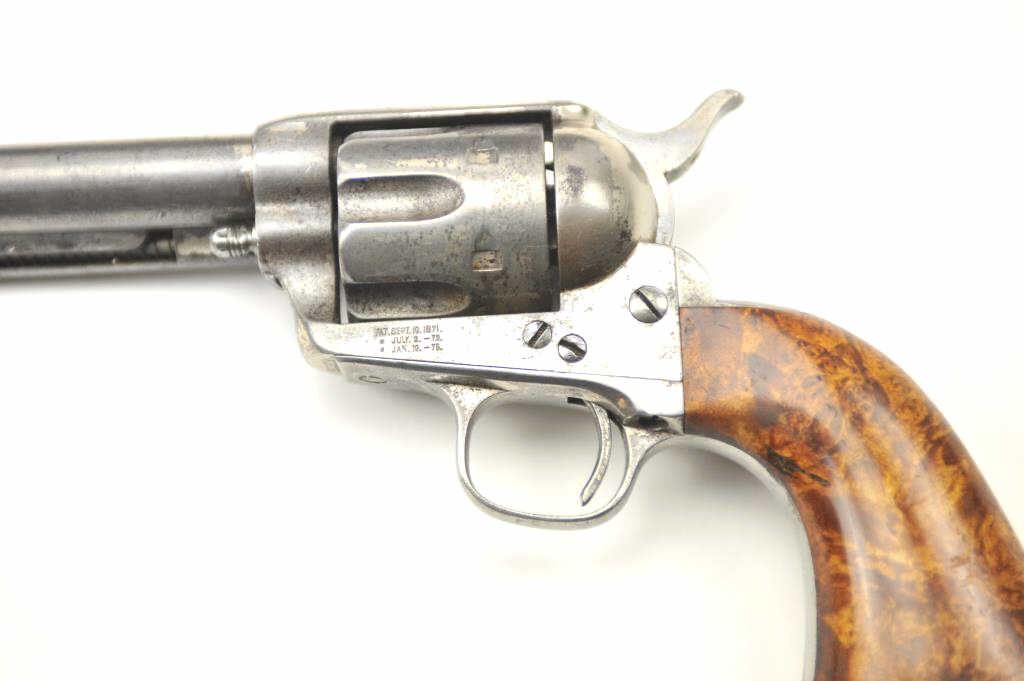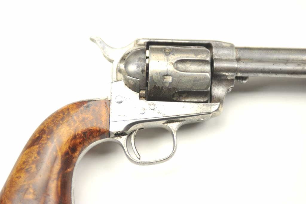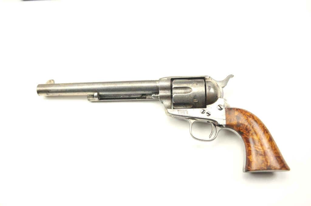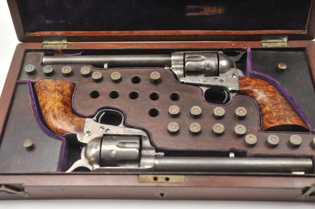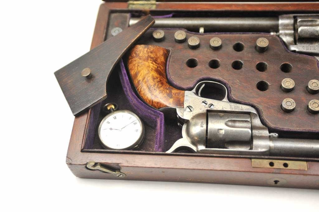 Pair of cased SA Army revolvers, .44-40 caliber, 7½” barrels with traces of nickel finish, Deluxe Burl Maple screw-less grips in an old case from the period of use, Serial #82308 and 82315. Additionally, the lot includes a silver pocket watch contained the left corner, inscribed “EL PASO-TEXAS” with the initials, “JWC” at center purportedly for Jack Wallace Crawford, AKA Captain Jack Crawford. The English lever set watch is marked, “ACME LEVER H. Samuel, Manchester” with British sterling touch marks, Swiss movement and is not running at the time of description.
