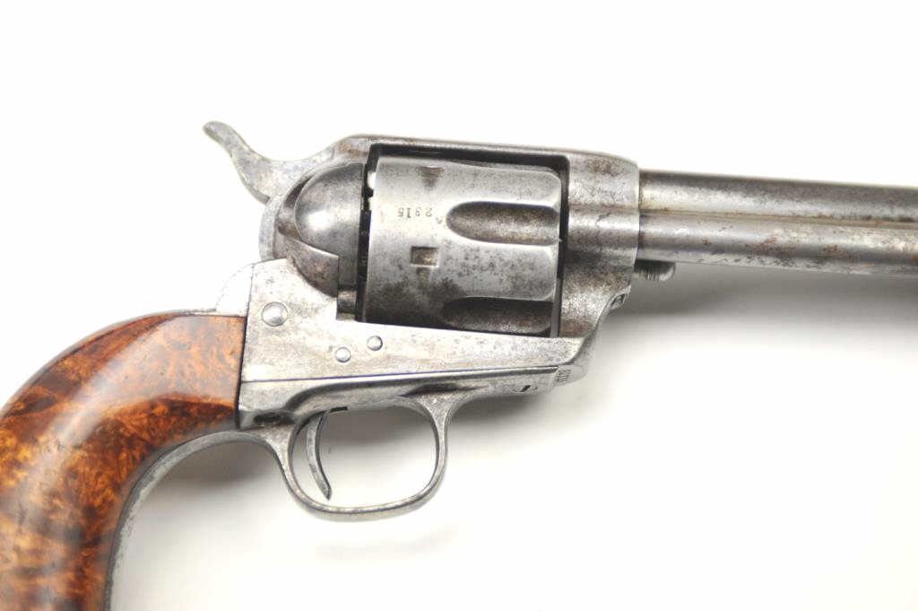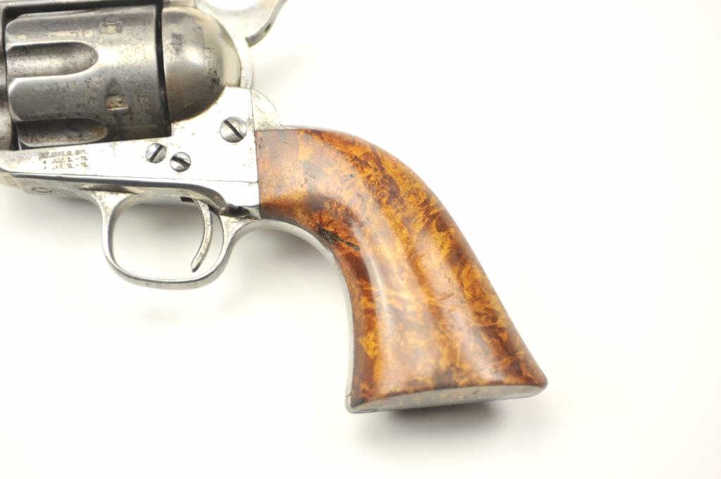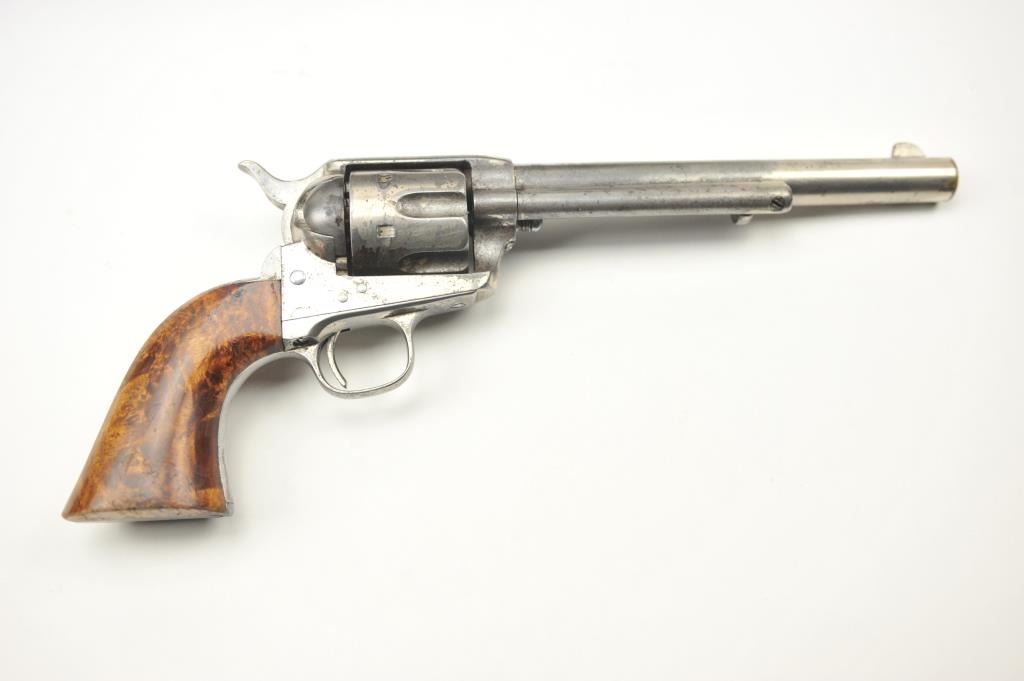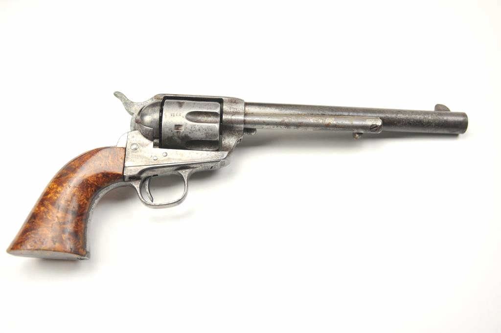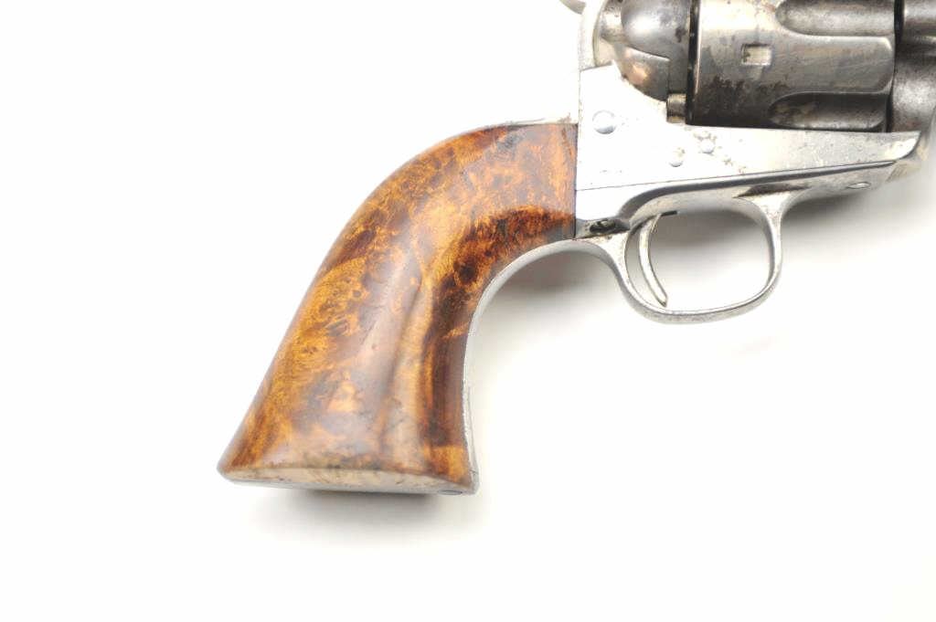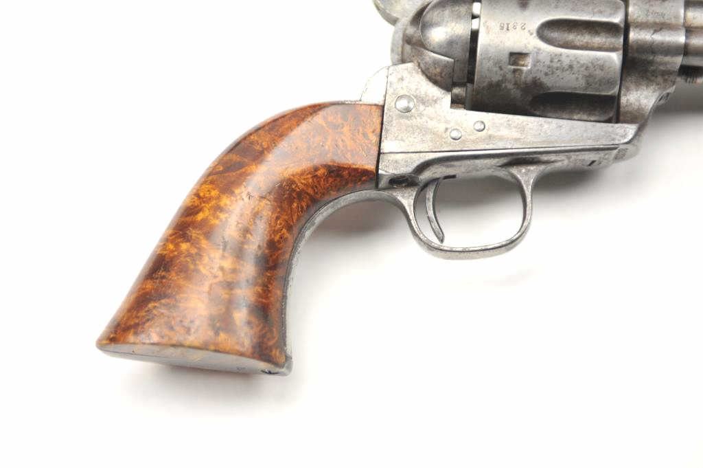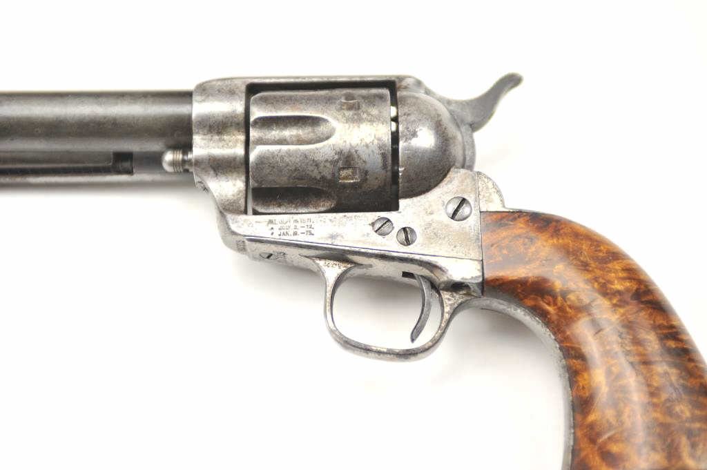 Pair of cased SA Army revolvers, .44-40 caliber, 7½” barrels with traces of nickel finish, Deluxe Burl Maple screw-less grips in an old case from the period of use, Serial #82308 and 82315. Additionally, the lot includes a silver pocket watch contained the left corner, inscribed “EL PASO-TEXAS” with the initials, “JWC” at center purportedly for Jack Wallace Crawford, AKA Captain Jack Crawford. The English lever set watch is marked, “ACME LEVER H. Samuel, Manchester” with British sterling touch marks, Swiss movement and is not running at the time of description.