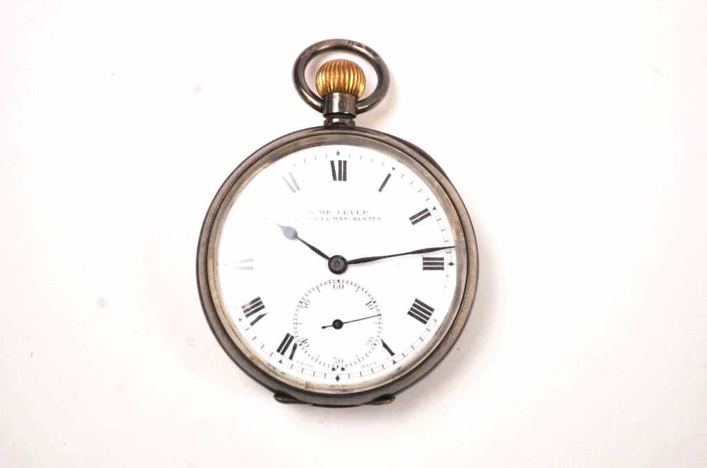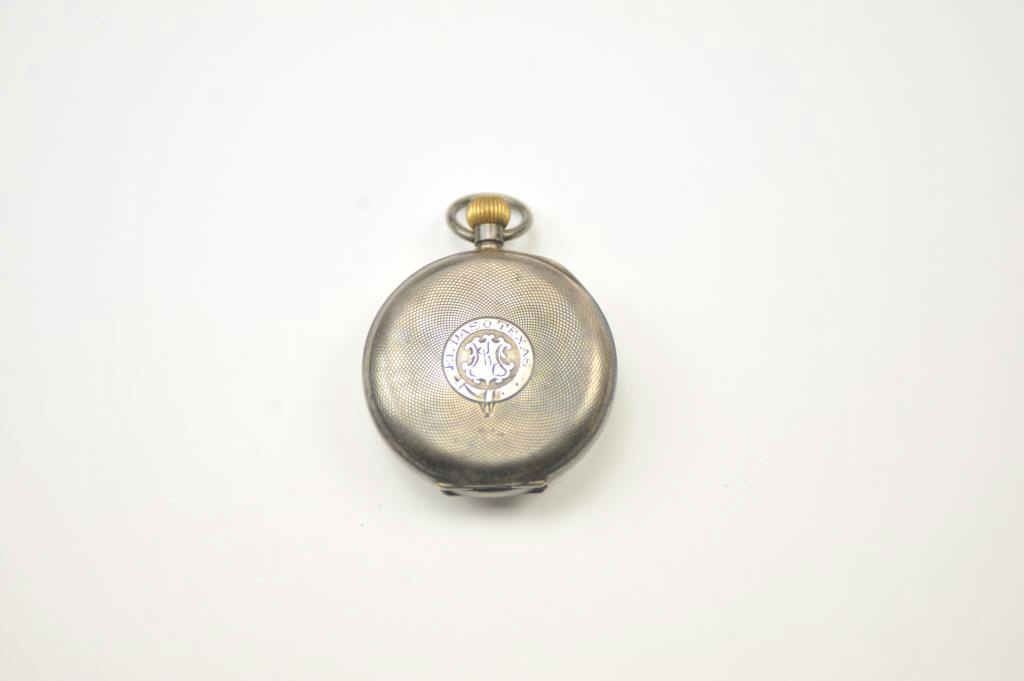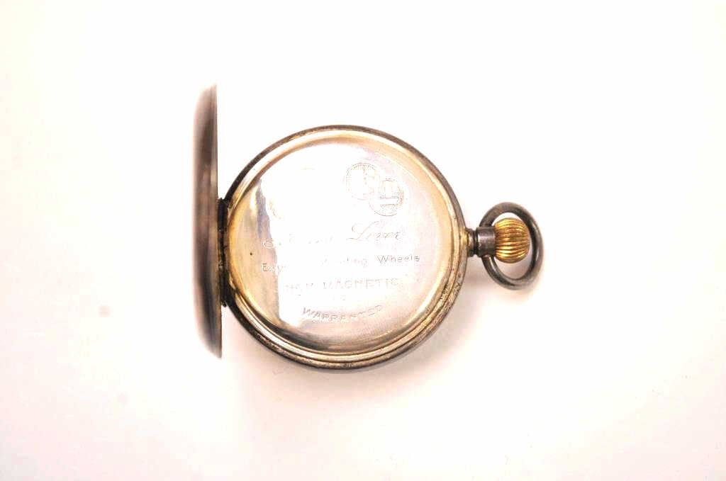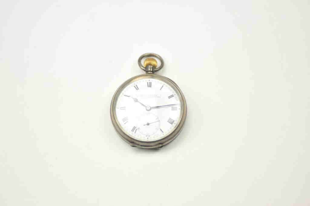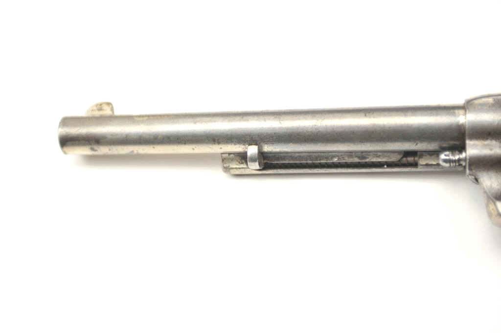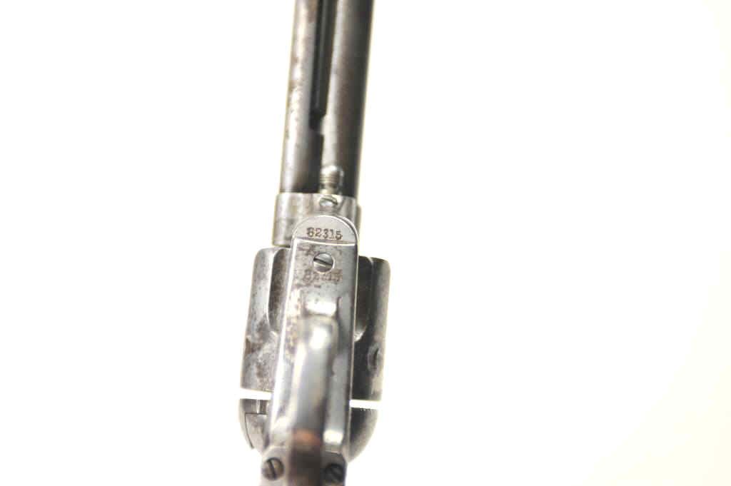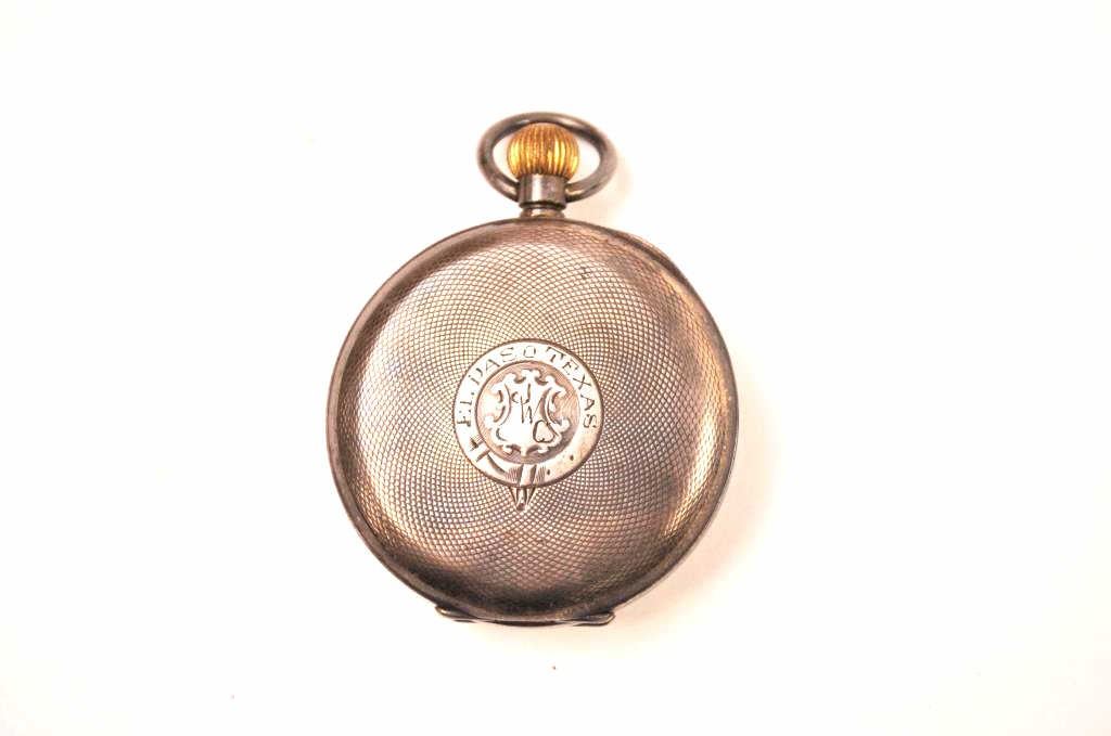 Pair of cased SA Army revolvers, .44-40 caliber, 7½” barrels with traces of nickel finish, Deluxe Burl Maple screw-less grips in an old case from the period of use, Serial #82308 and 82315. Additionally, the lot includes a silver pocket watch contained the left corner, inscribed “EL PASO-TEXAS” with the initials, “JWC” at center purportedly for Jack Wallace Crawford, AKA Captain Jack Crawford. The English lever set watch is marked, “ACME LEVER H. Samuel, Manchester” with British sterling touch marks, Swiss movement and is not running at the time of description.