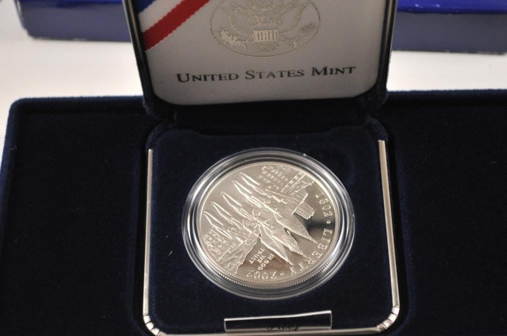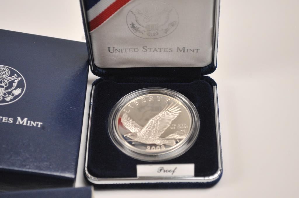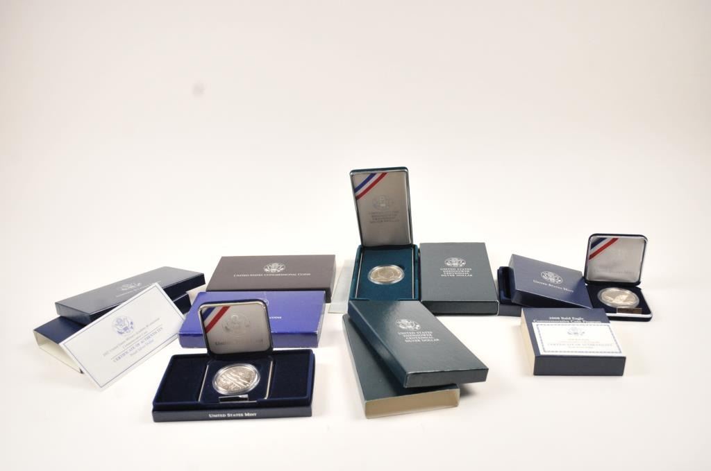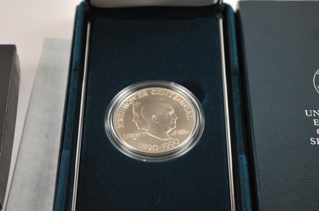 ): Lot of U.S. coins in packs from mints including: A. U.S. Mint 2002- Military Bi-Centennial Commemorative coin. B. Eisenhower Centennial Silver dollar1890-1990. C. Eisenhower Centennial Silver dollar 1890-1990. D. Two U.S. Congressional coins 1789-1989 with $1 dollar and half dollar.E. 2008 Bald Eagle Silver Proof dollar. F. 1986 S.F. Mint Silver dollar and half. Value to $100 each plus. All are mint in packs. Est.: $250-$500+++