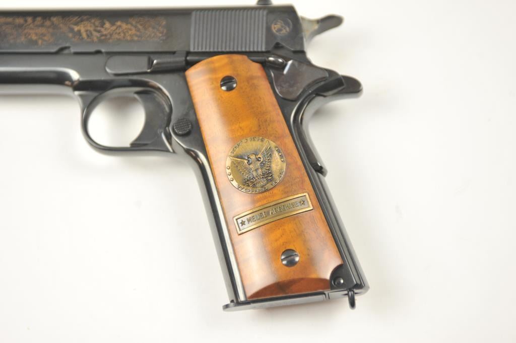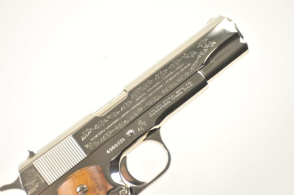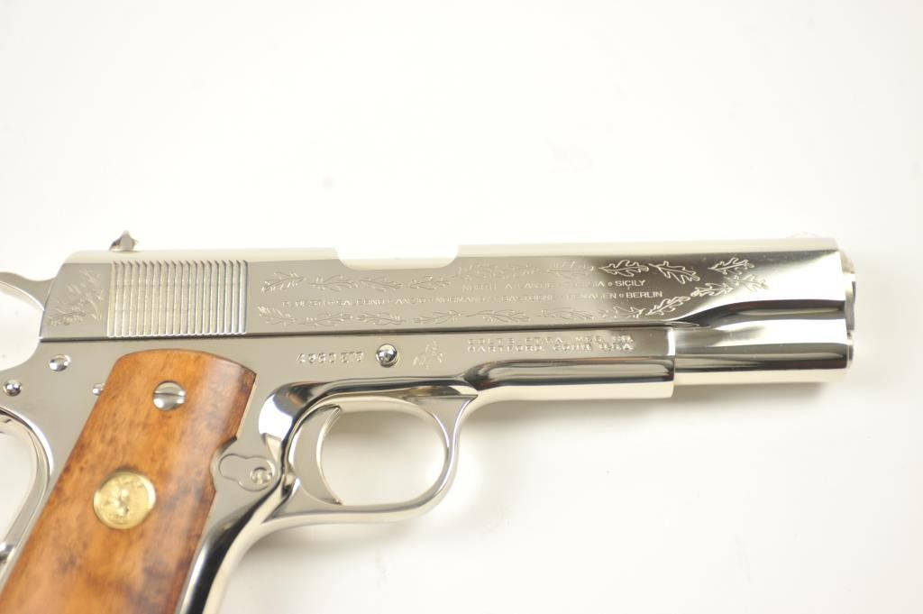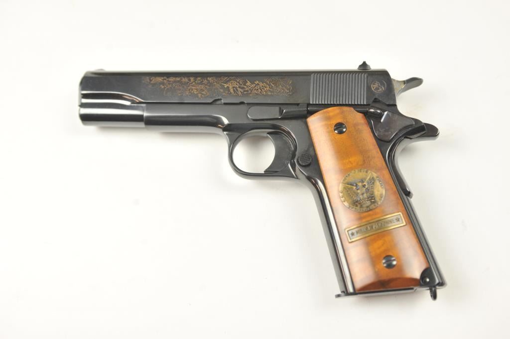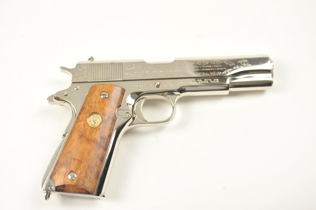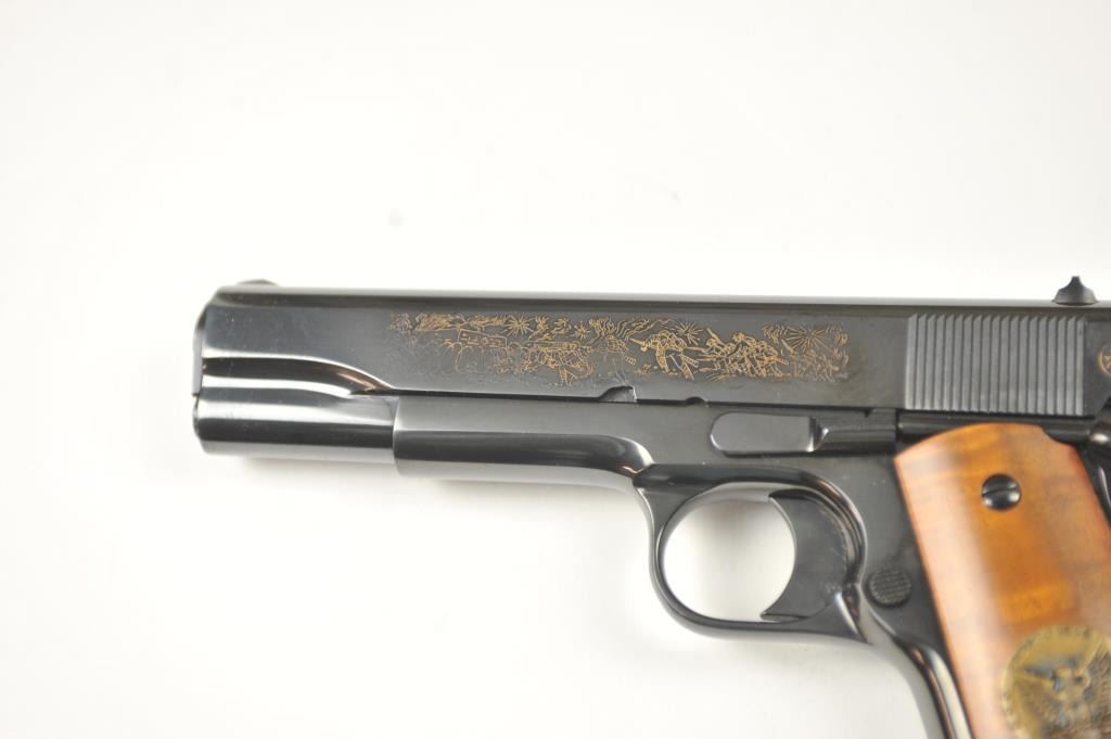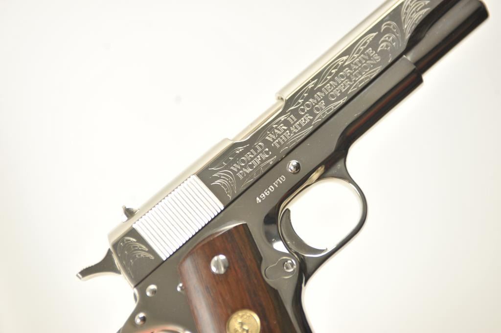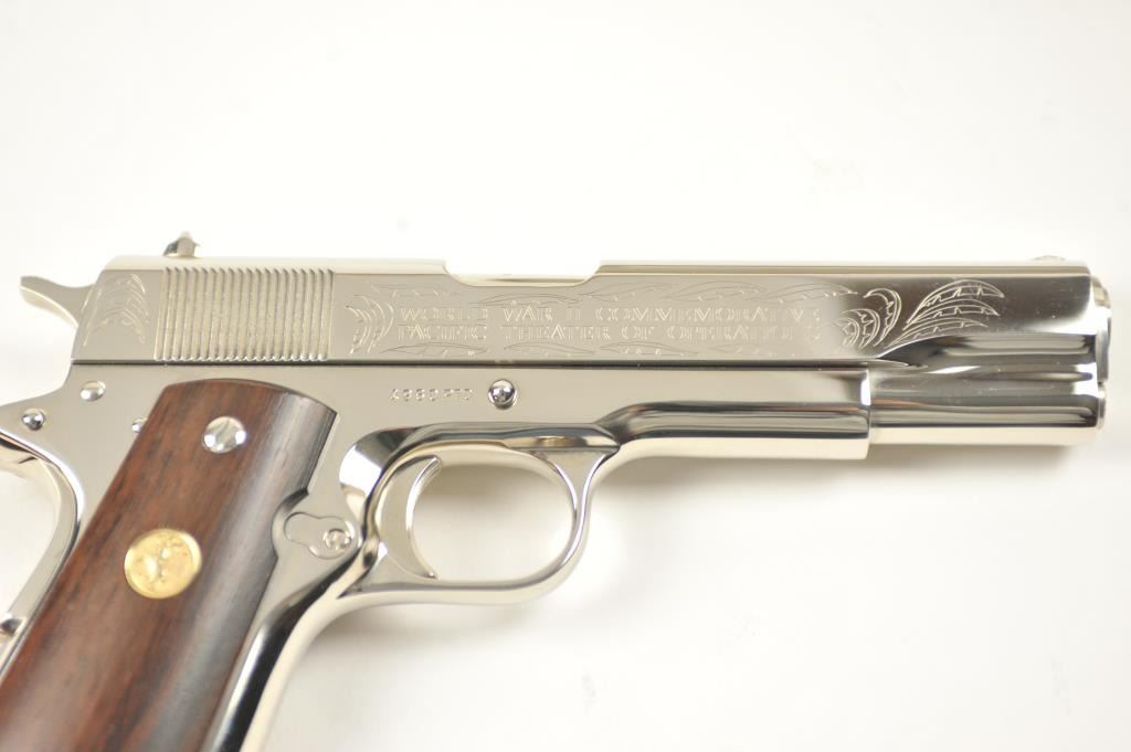Scarce intact six gun matching set of World War I and World War II commemorative Model 1911 and 1911A-1 Colt .45 autos Serial #4960BW, #4960CT, #4960ETO, #4960MA, #4960MZ and #4960PTO. The pistols are in excellentto new condition with original shipping cartons. No evidence of firing or use. Minor storage and handling only. 99% to mint condition. Est.: $5,000-$10,000. (C+R/PPT).