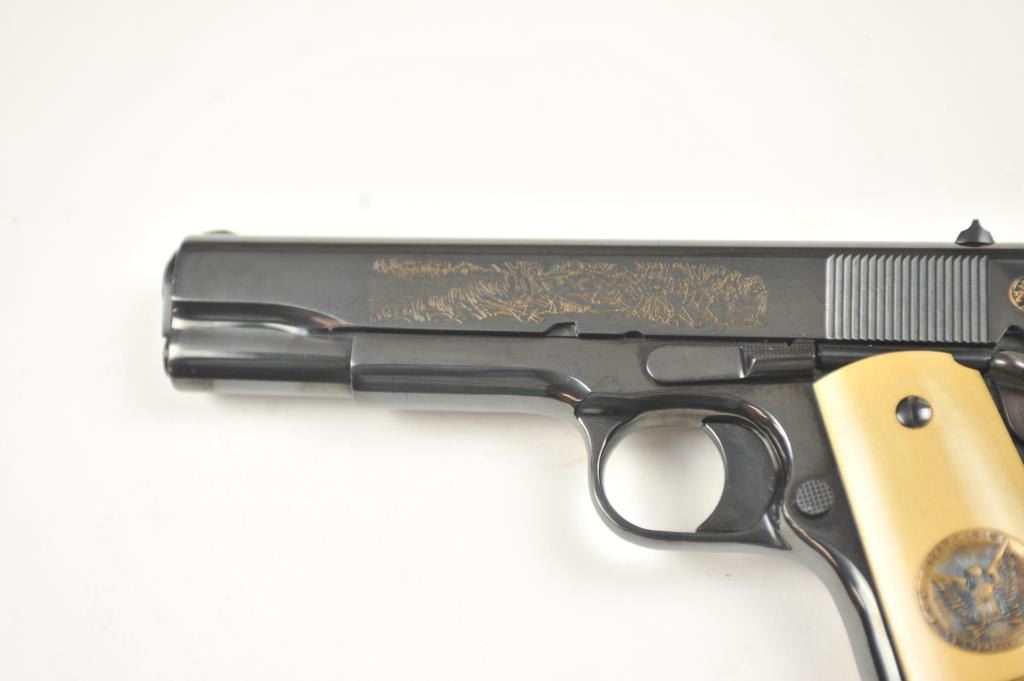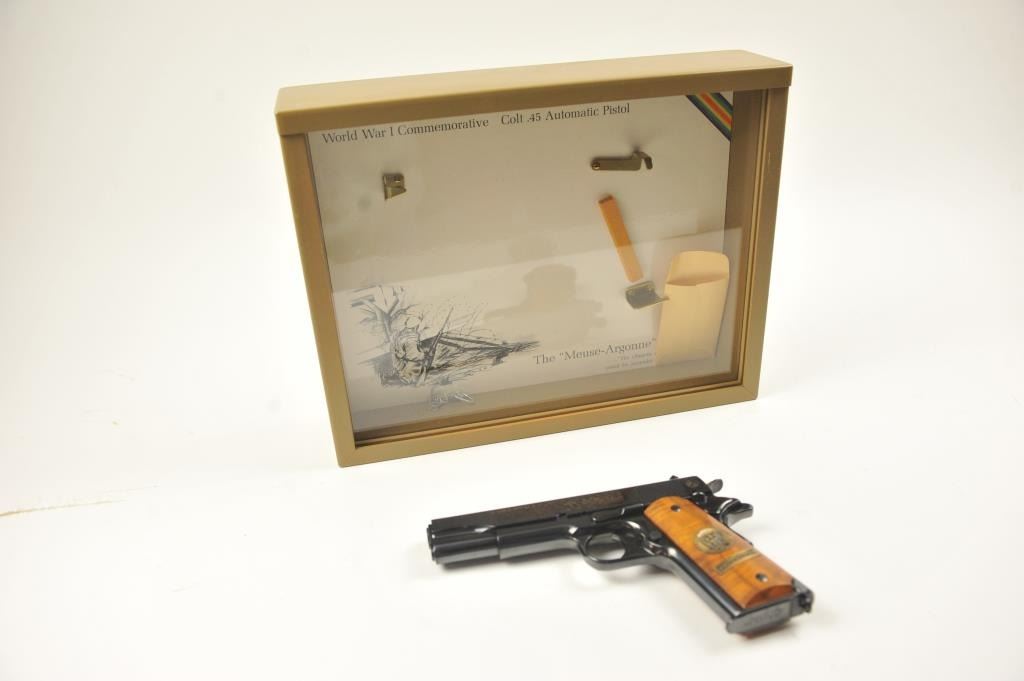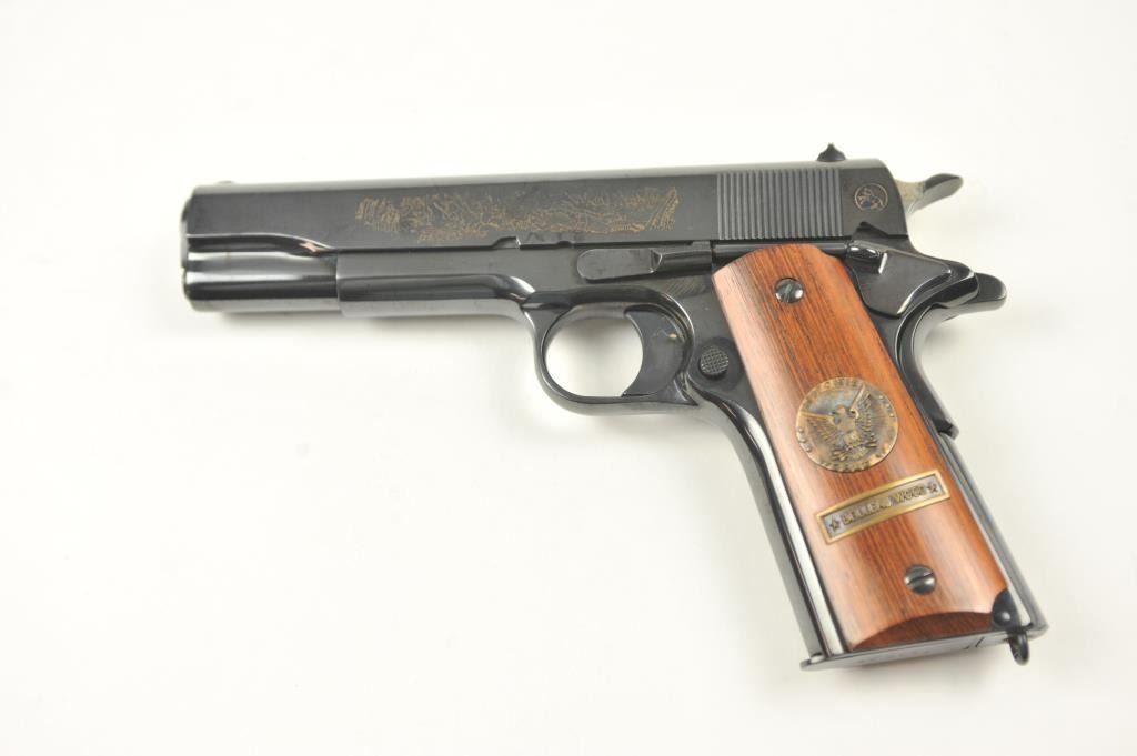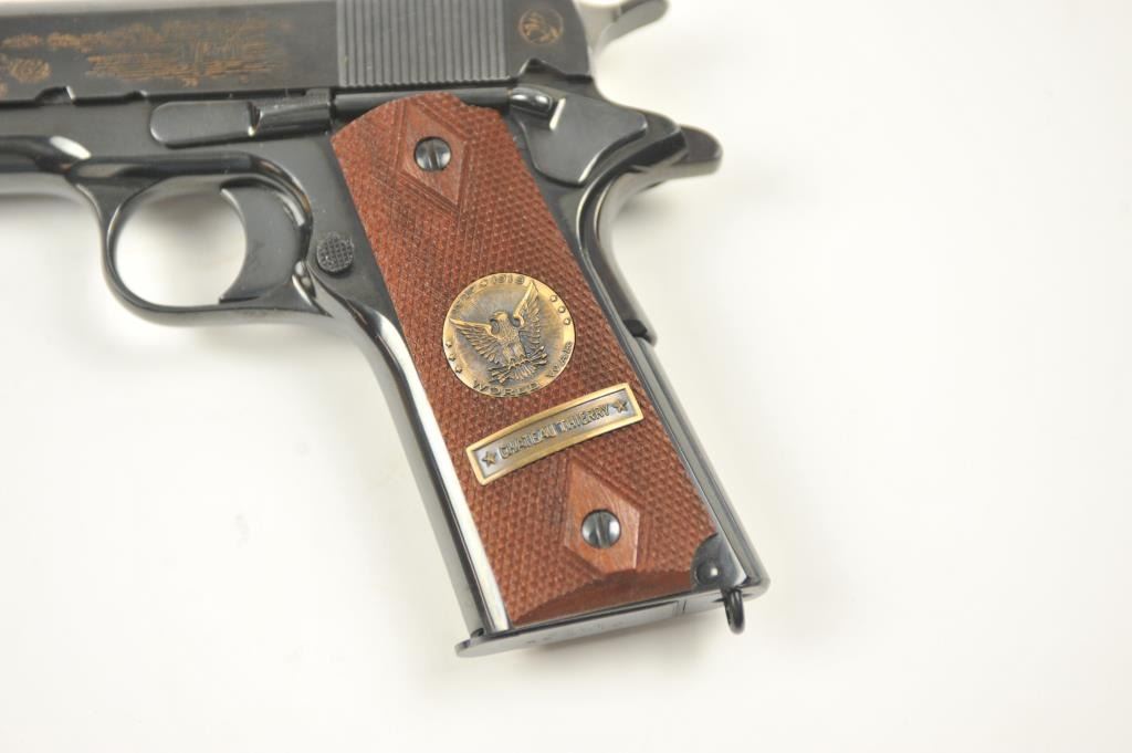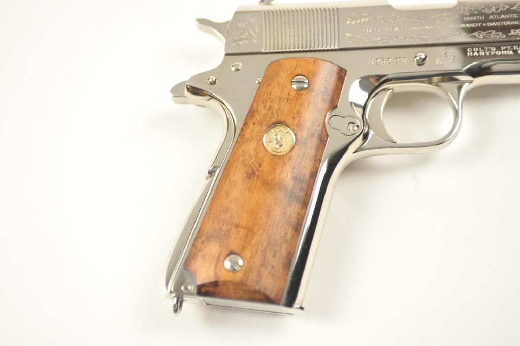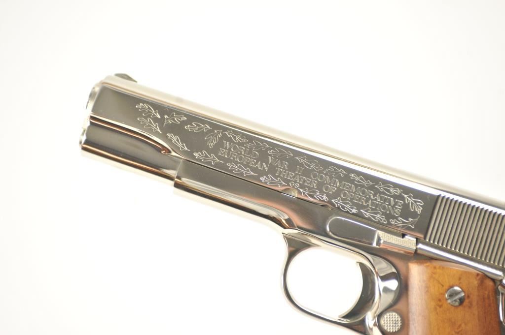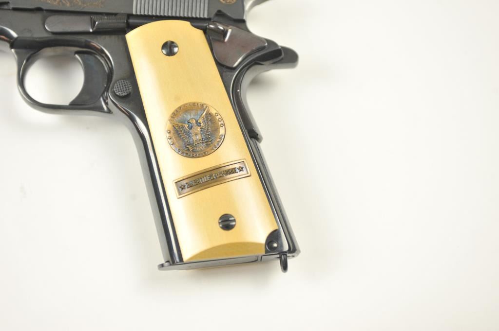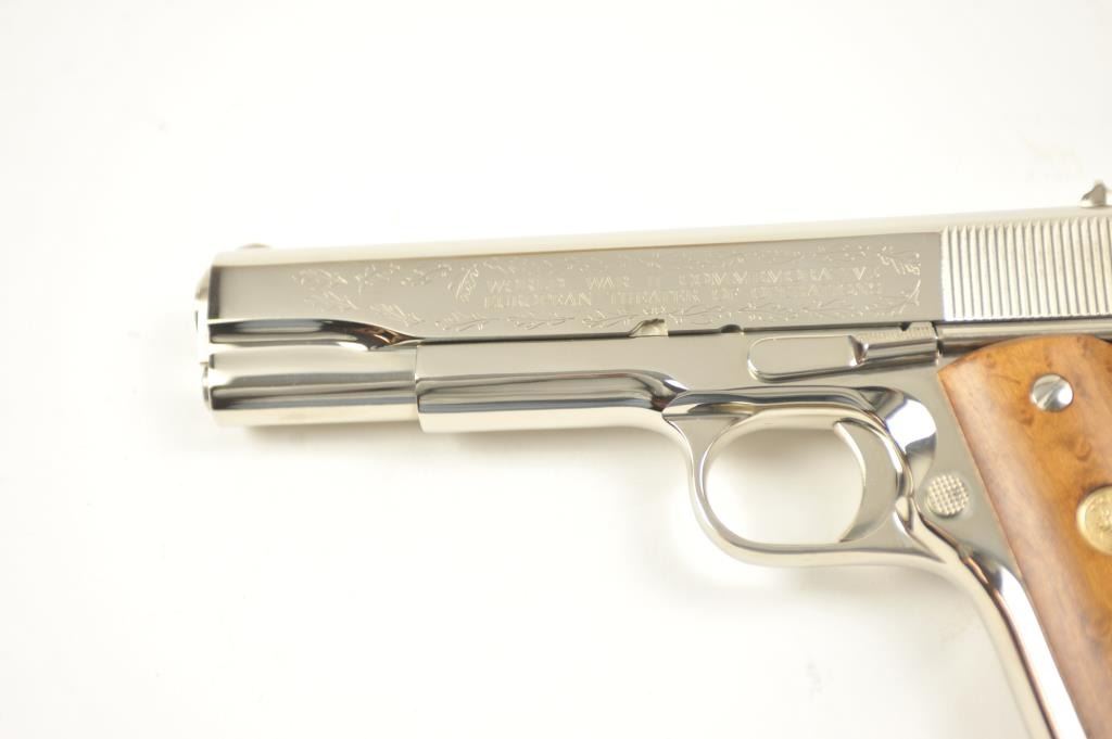 Scarce intact six gun matching set of World War I and World War II commemorative Model 1911 and 1911A-1 Colt .45 autos Serial #4960BW, #4960CT, #4960ETO, #4960MA, #4960MZ and #4960PTO. The pistols are in excellentto new condition with original shipping cartons. No evidence of firing or use. Minor storage and handling only. 99% to mint condition. Est.: $5,000-$10,000. (C+R/PPT).