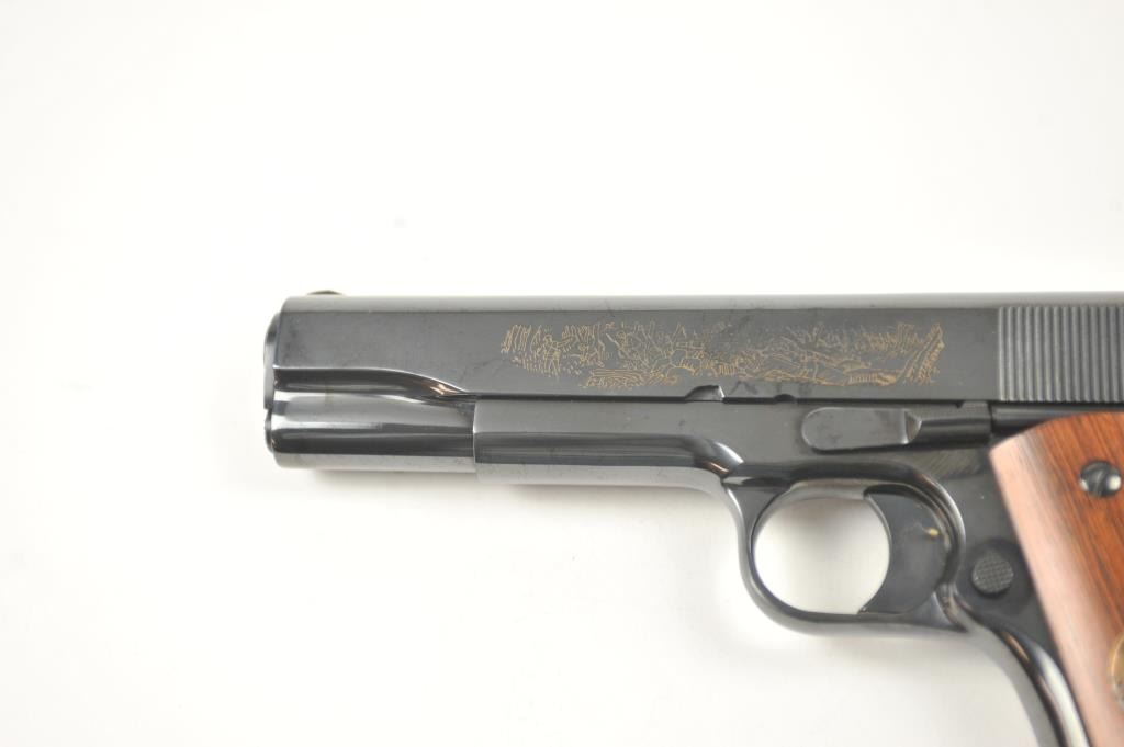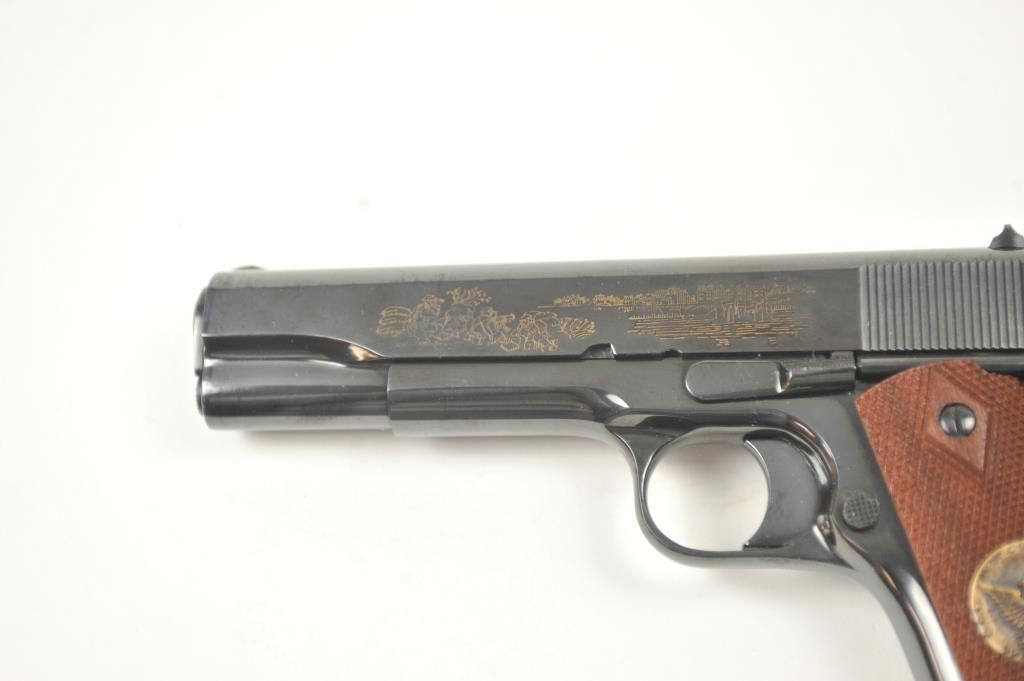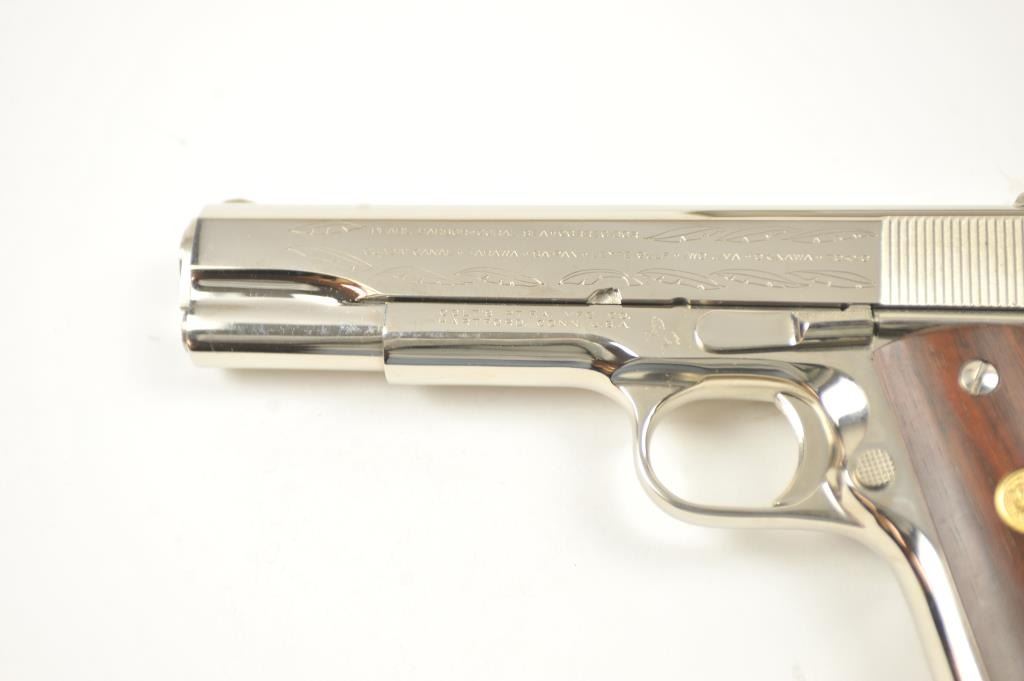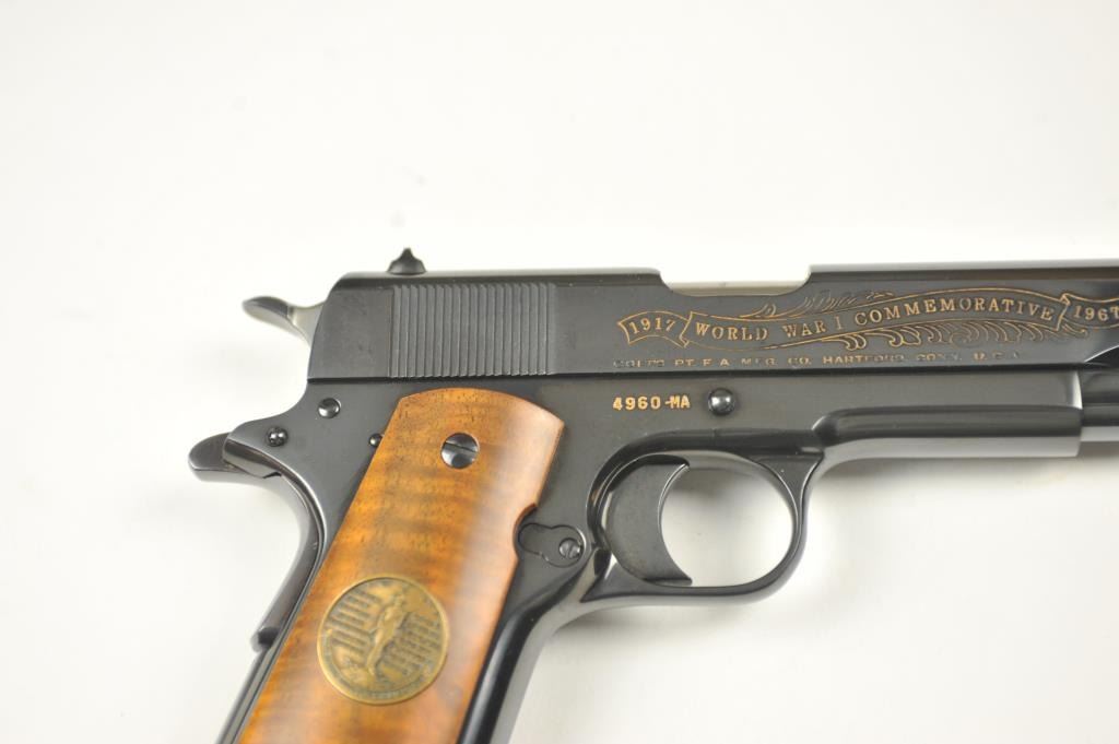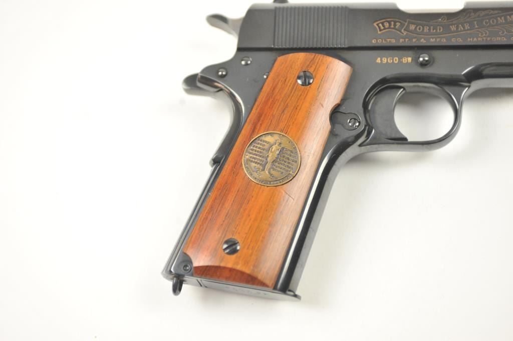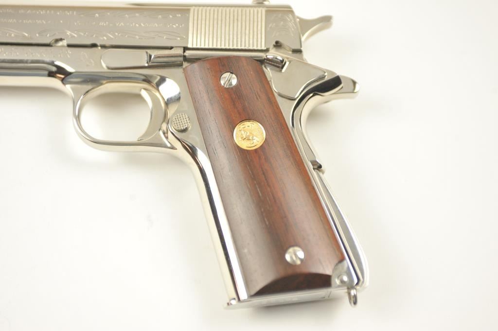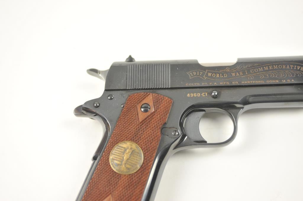 Scarce intact six gun matching set of World War I and World War II commemorative Model 1911 and 1911A-1 Colt .45 autos Serial #4960BW, #4960CT, #4960ETO, #4960MA, #4960MZ and #4960PTO. The pistols are in excellentto new condition with original shipping cartons. No evidence of firing or use. Minor storage and handling only. 99% to mint condition. Est.: $5,000-$10,000. (C+R/PPT).