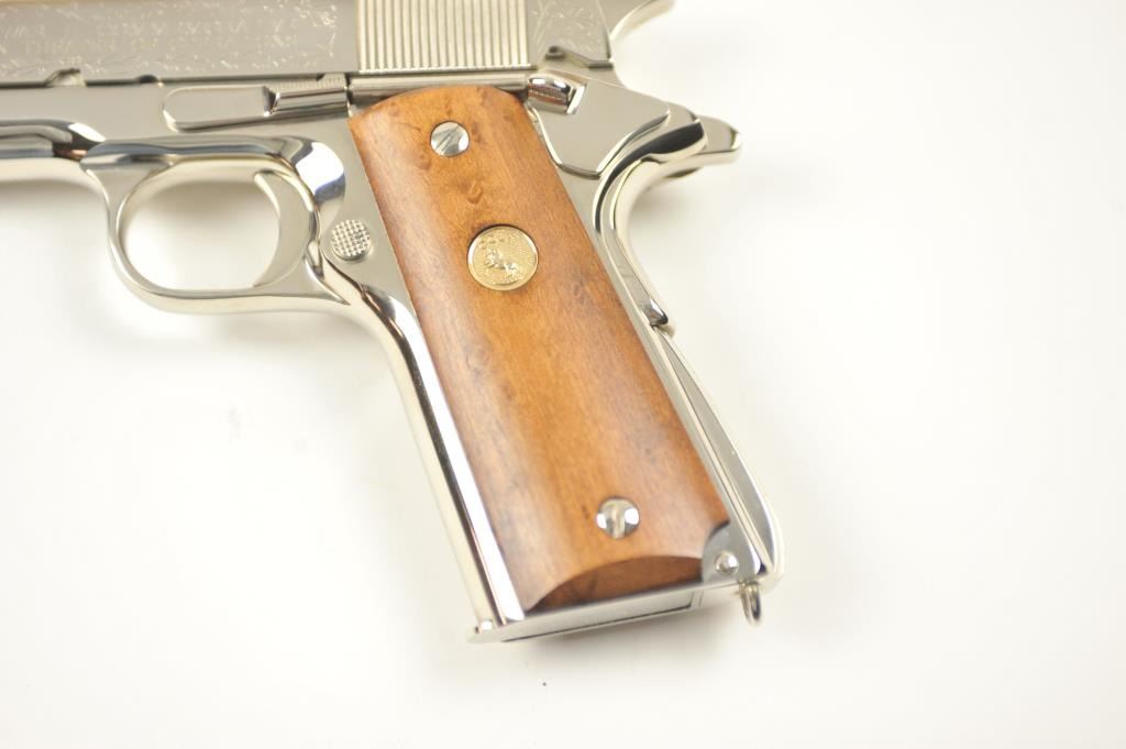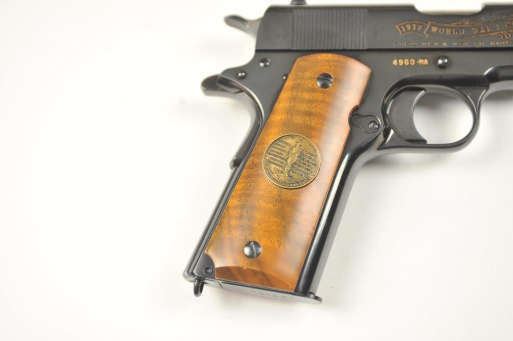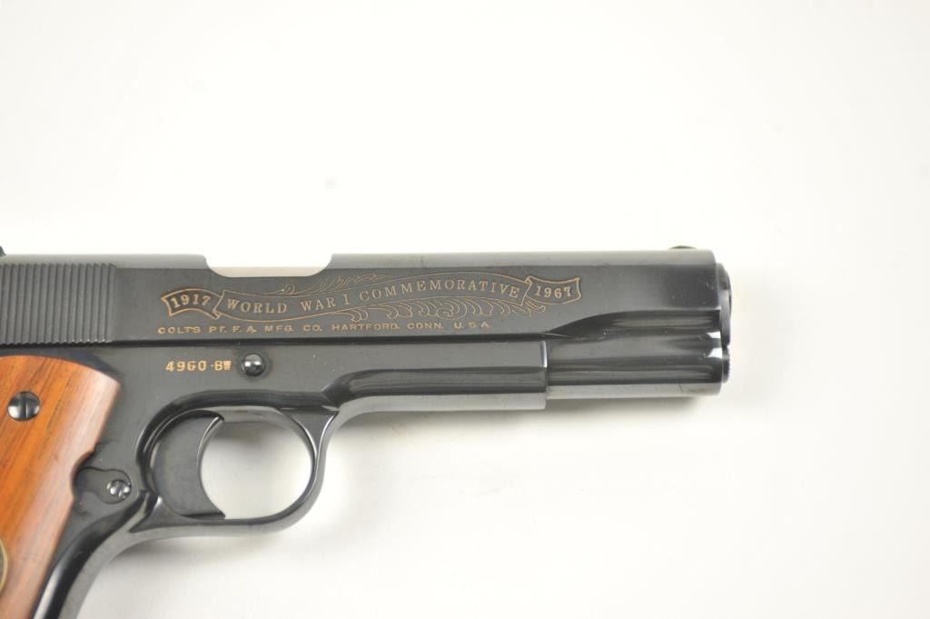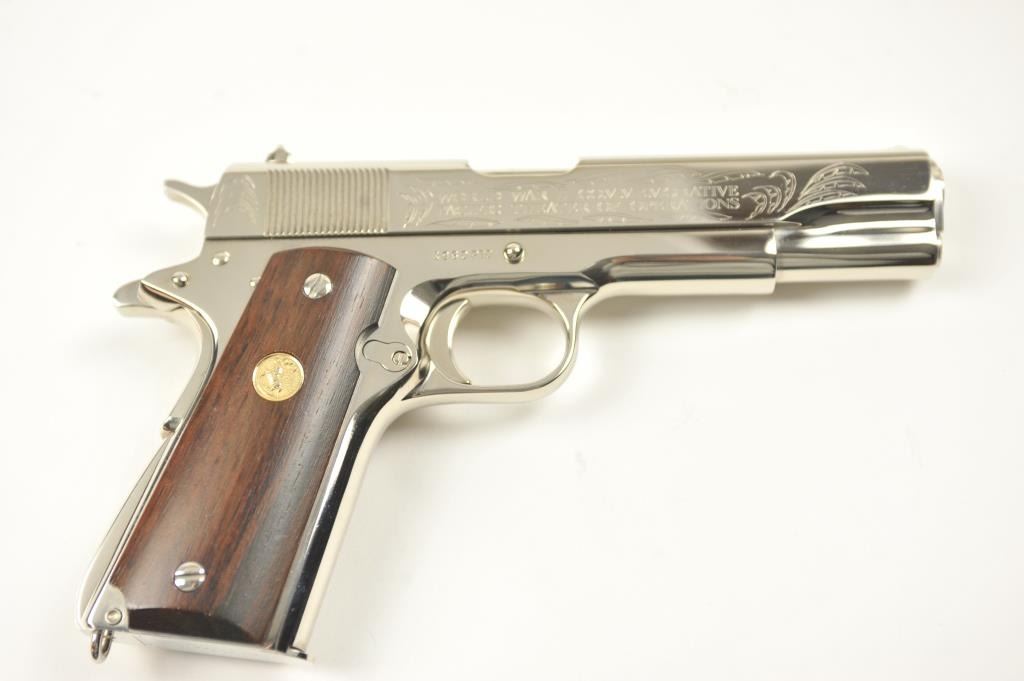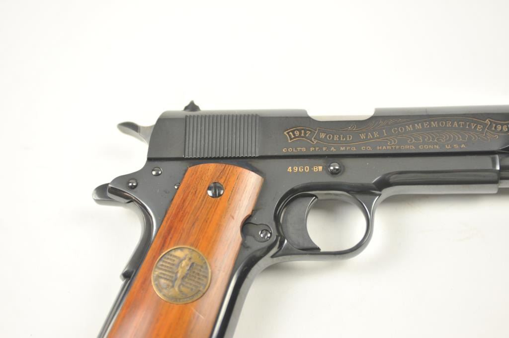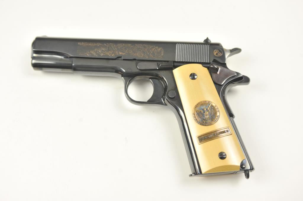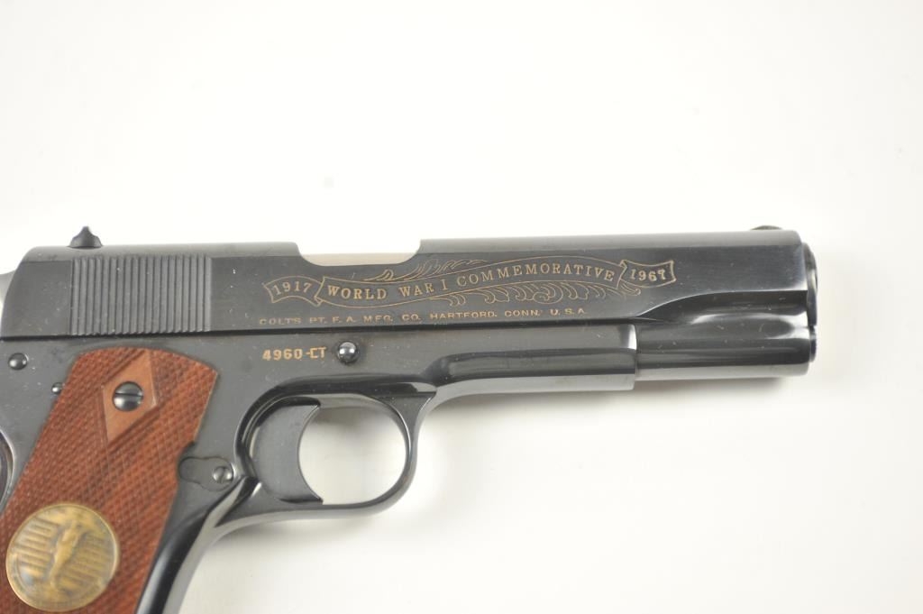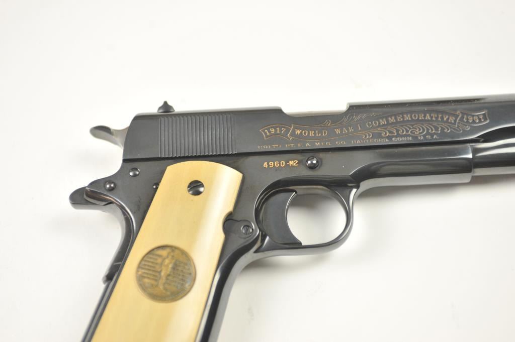 Scarce intact six gun matching set of World War I and World War II commemorative Model 1911 and 1911A-1 Colt .45 autos Serial #4960BW, #4960CT, #4960ETO, #4960MA, #4960MZ and #4960PTO. The pistols are in excellentto new condition with original shipping cartons. No evidence of firing or use. Minor storage and handling only. 99% to mint condition. Est.: $5,000-$10,000. (C+R/PPT).