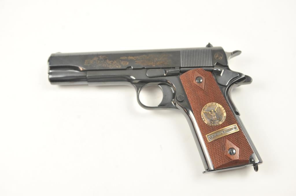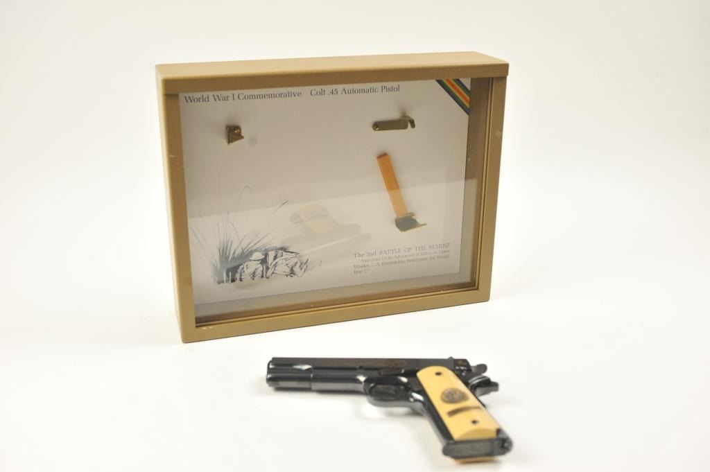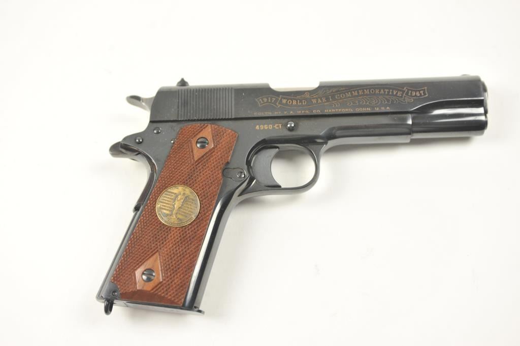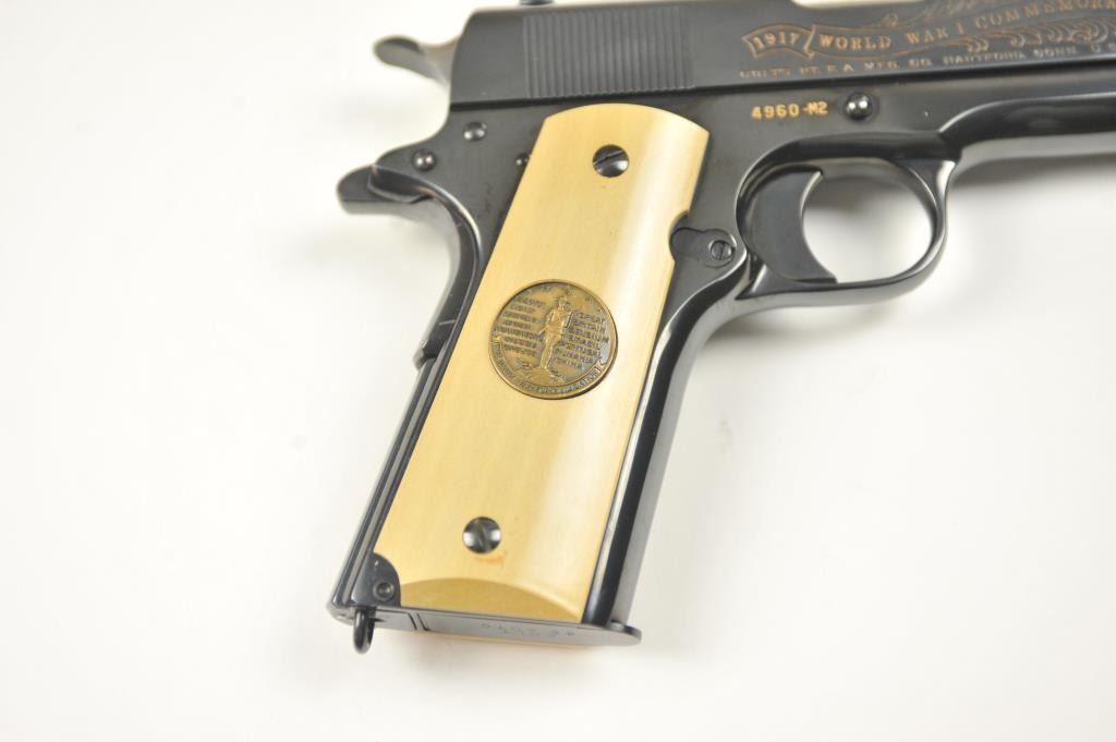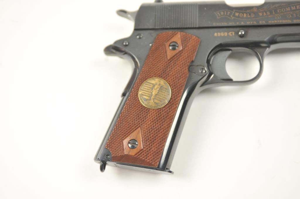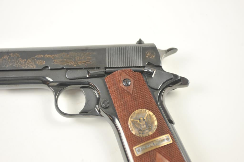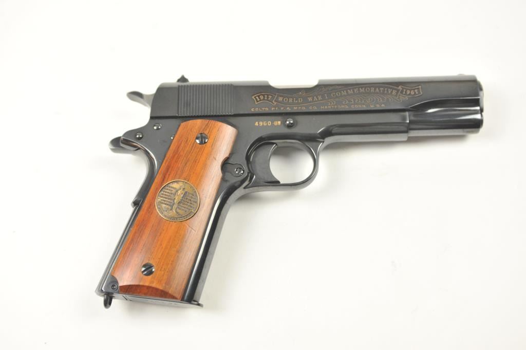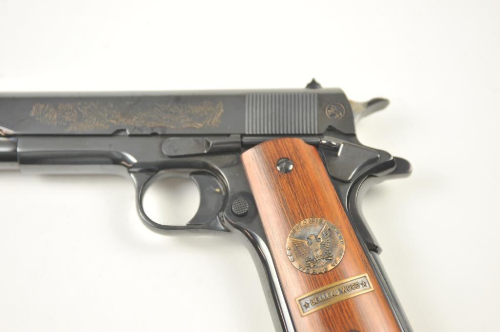 Scarce intact six gun matching set of World War I and World War II commemorative Model 1911 and 1911A-1 Colt .45 autos Serial #4960BW, #4960CT, #4960ETO, #4960MA, #4960MZ and #4960PTO. The pistols are in excellentto new condition with original shipping cartons. No evidence of firing or use. Minor storage and handling only. 99% to mint condition. Est.: $5,000-$10,000. (C+R/PPT).