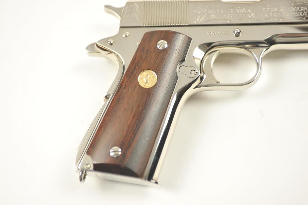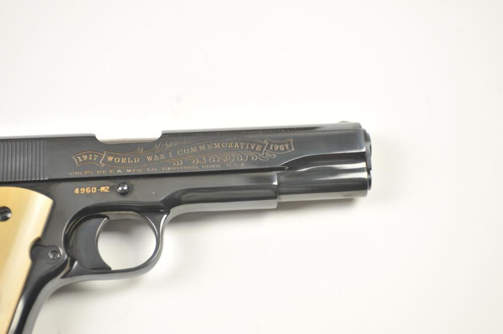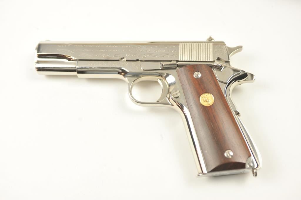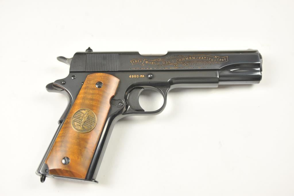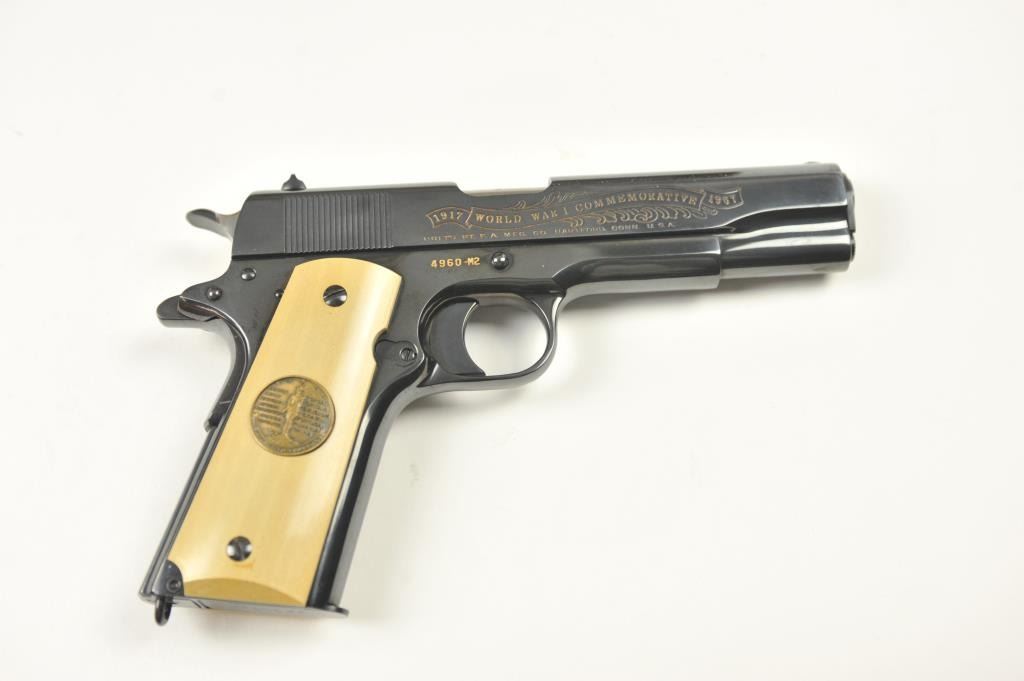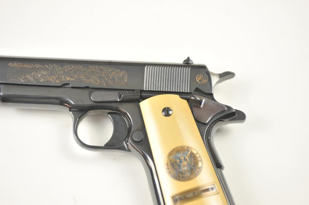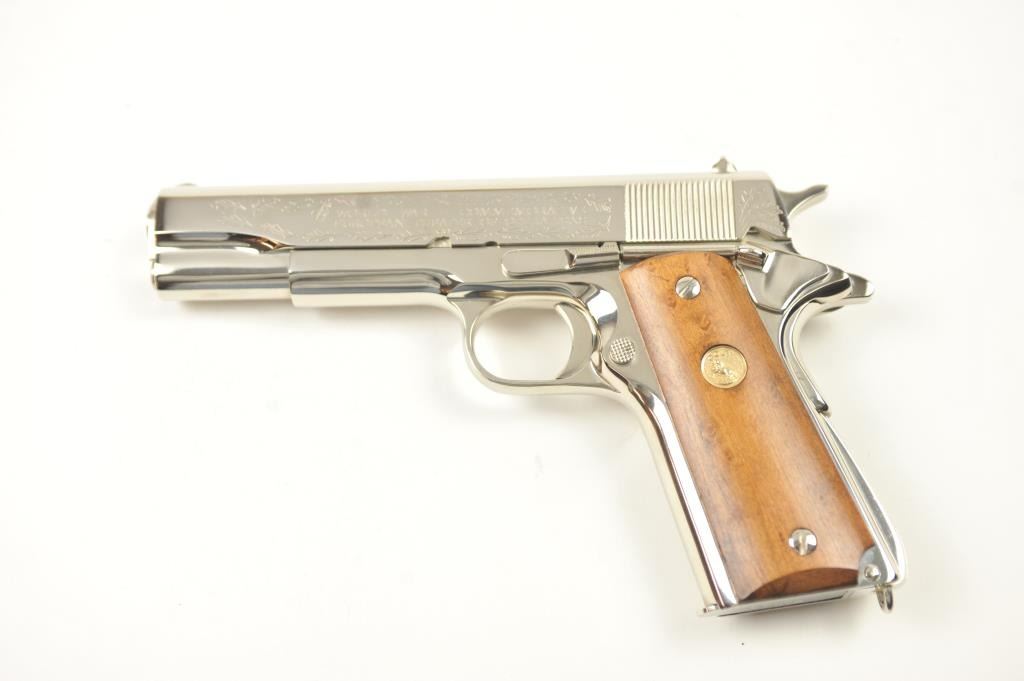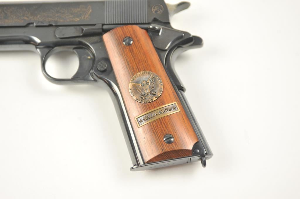 Scarce intact six gun matching set of World War I and World War II commemorative Model 1911 and 1911A-1 Colt .45 autos Serial #4960BW, #4960CT, #4960ETO, #4960MA, #4960MZ and #4960PTO. The pistols are in excellentto new condition with original shipping cartons. No evidence of firing or use. Minor storage and handling only. 99% to mint condition. Est.: $5,000-$10,000. (C+R/PPT).