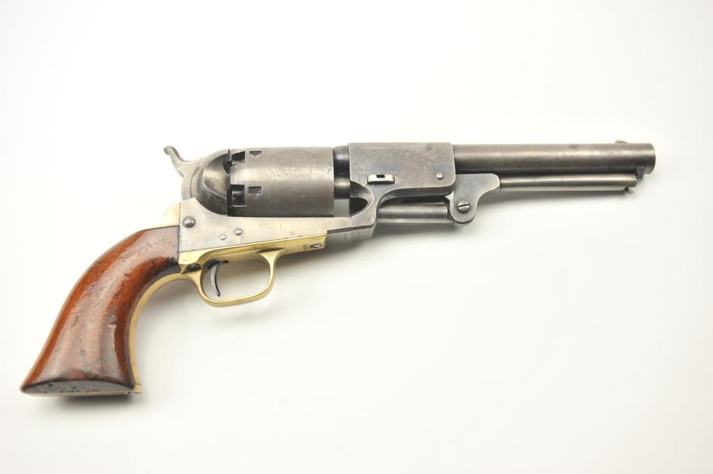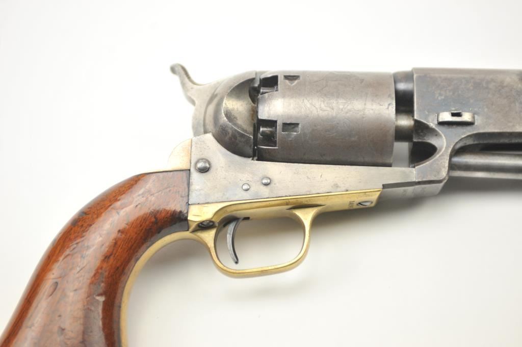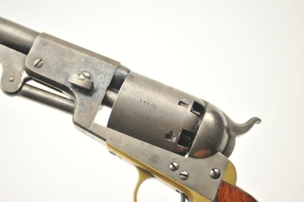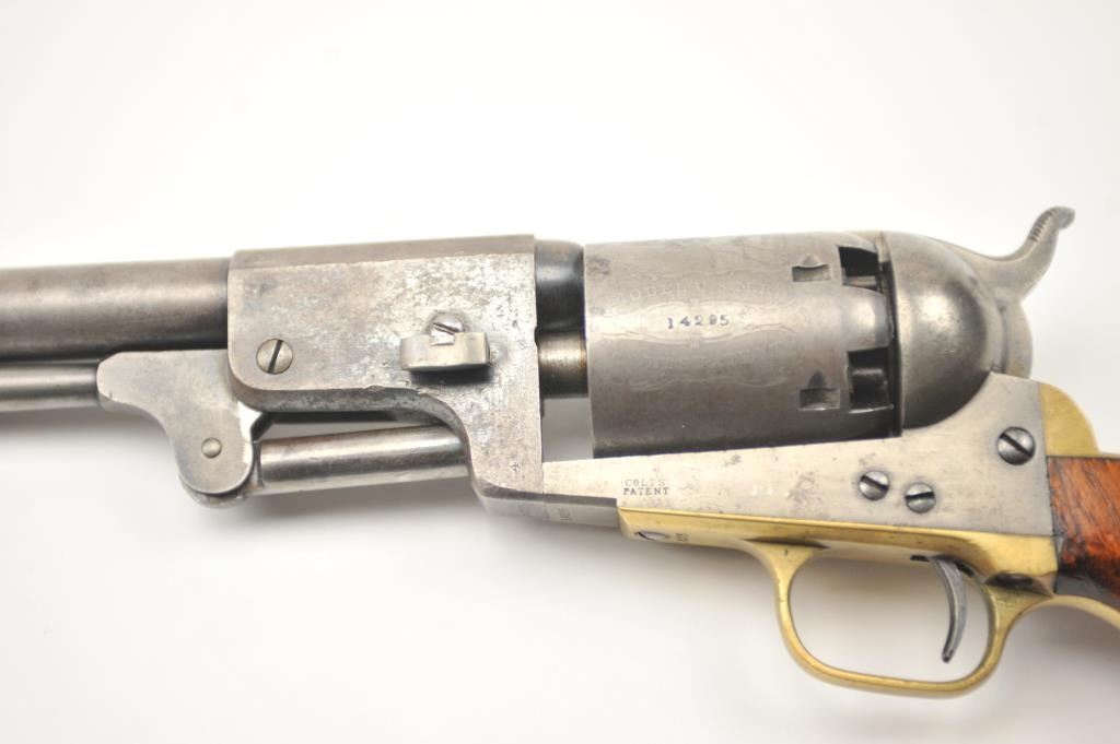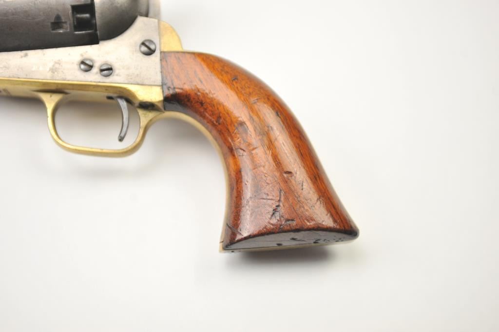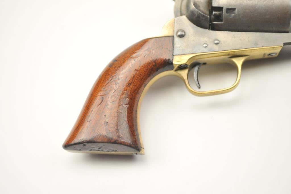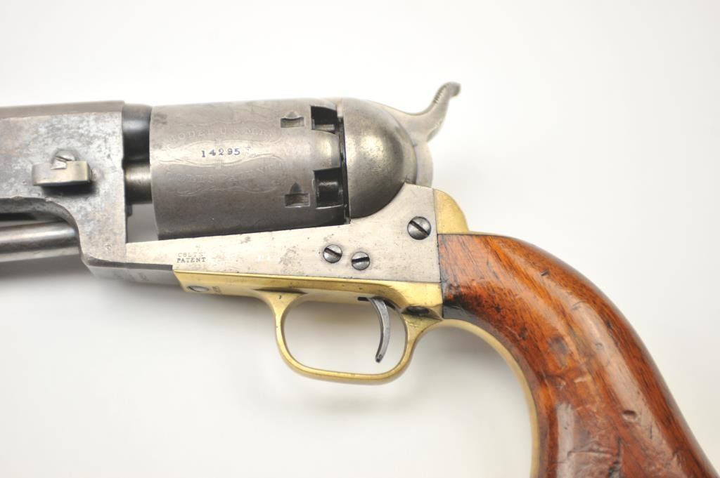 Colt 3rd Model Civilian Dragoon Percussion Revolver in .44 caliber showing 30%-50% original finish with varnished wood grips, S/N 14295. The barrel shows 30%-50% bright original blue drifting at the high pointswith minor erosion and light pinprick pitting. Some scratches with sharp edges and good markings. 75%-85% original cylinder scene with model U.S.M.R. and Colt’s patent fully visible. The cylinder shows all sixsafety pins. Traces of silvery case colors on the frame and hammer. The grips show 70%-80% original varnish with some mars and scratches and tacking marks on the butt strap and bottoms of grip. All matching visiblenumbers and well-marked. A pleasing and authentic dragoon with a lot of original color. Gary Wiemann collection. Est.: $7,000-$14,000