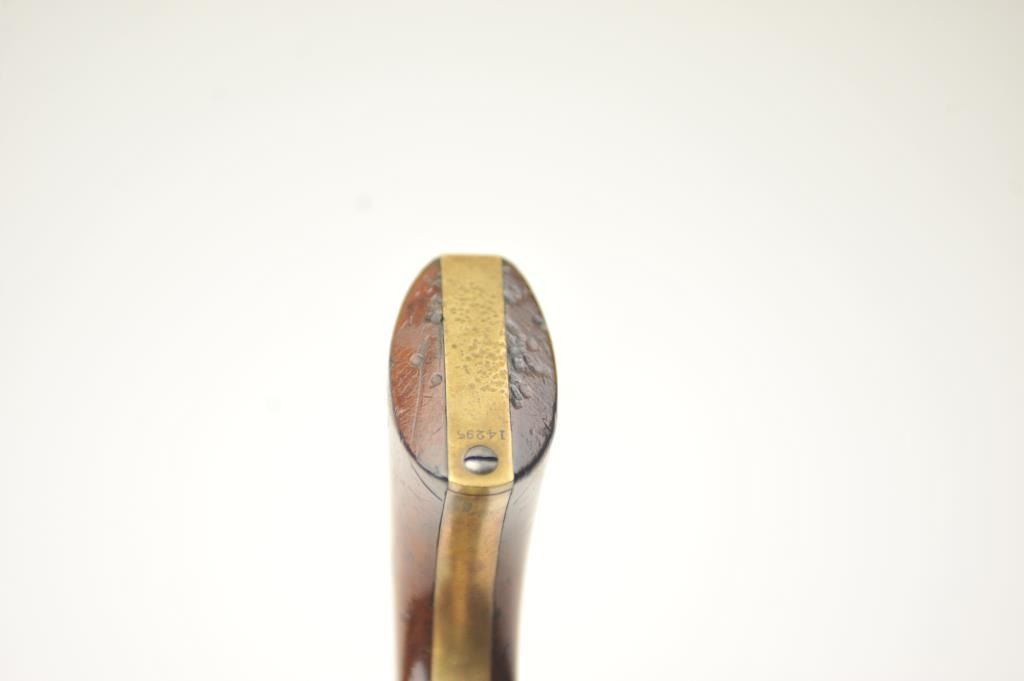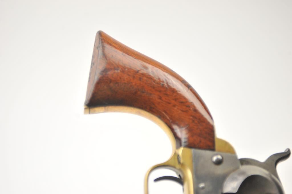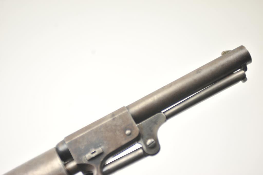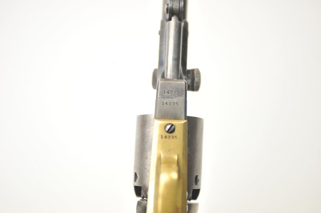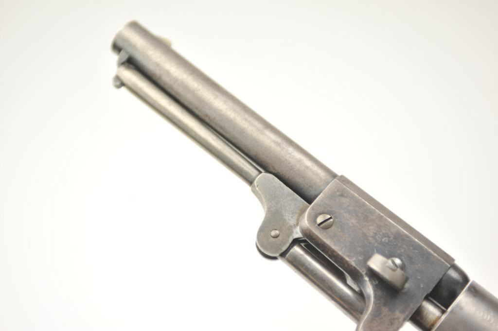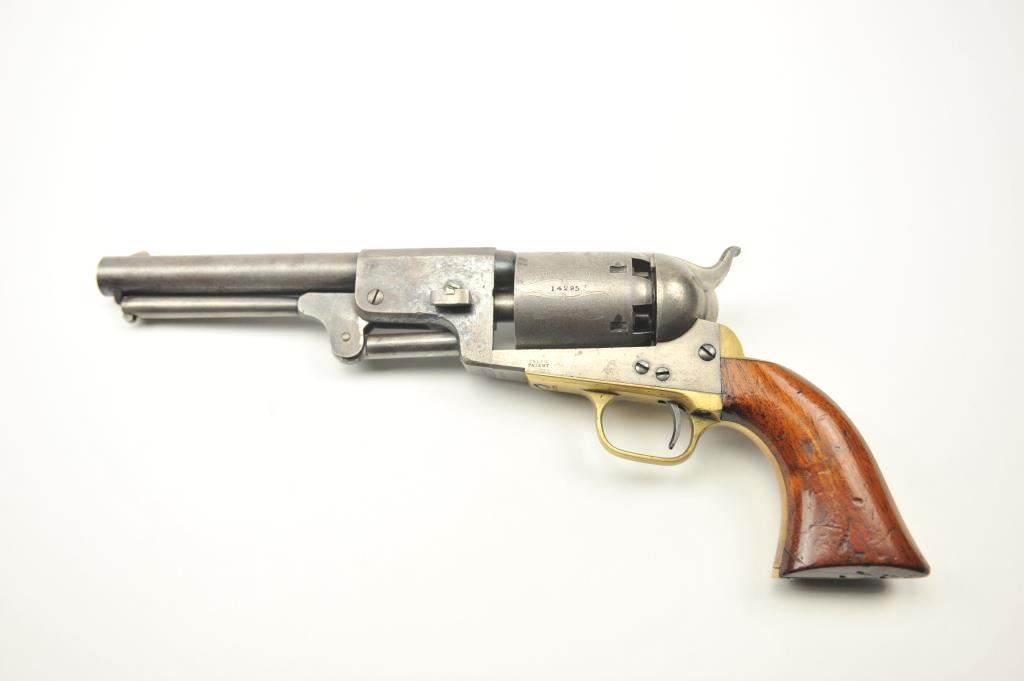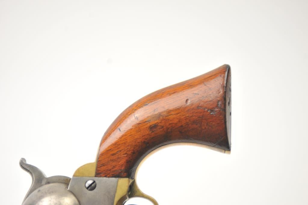 Colt 3rd Model Civilian Dragoon Percussion Revolver in .44 caliber showing 30%-50% original finish with varnished wood grips, S/N 14295. The barrel shows 30%-50% bright original blue drifting at the high pointswith minor erosion and light pinprick pitting. Some scratches with sharp edges and good markings. 75%-85% original cylinder scene with model U.S.M.R. and Colt’s patent fully visible. The cylinder shows all sixsafety pins. Traces of silvery case colors on the frame and hammer. The grips show 70%-80% original varnish with some mars and scratches and tacking marks on the butt strap and bottoms of grip. All matching visiblenumbers and well-marked. A pleasing and authentic dragoon with a lot of original color. Gary Wiemann collection. Est.: $7,000-$14,000
